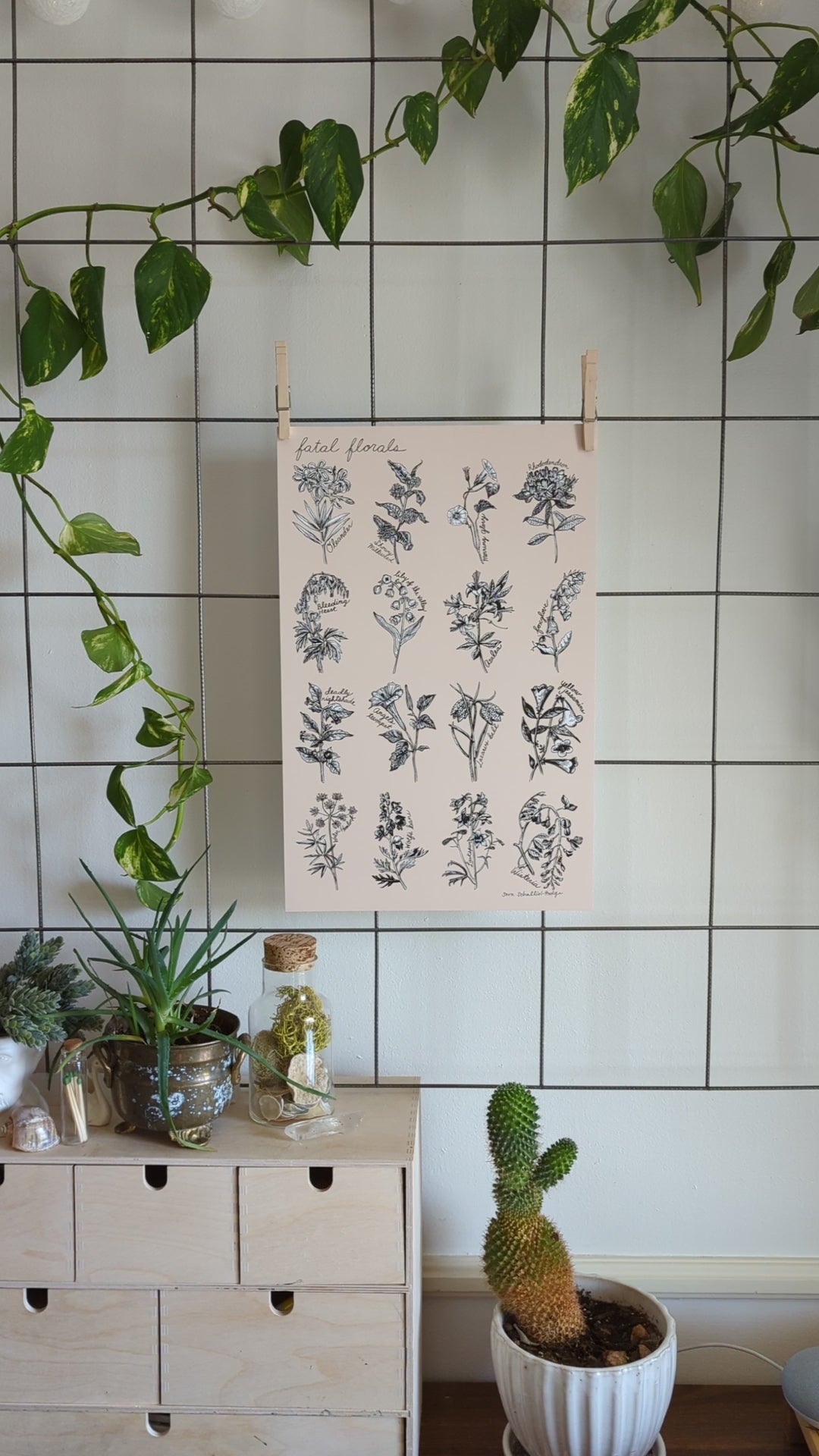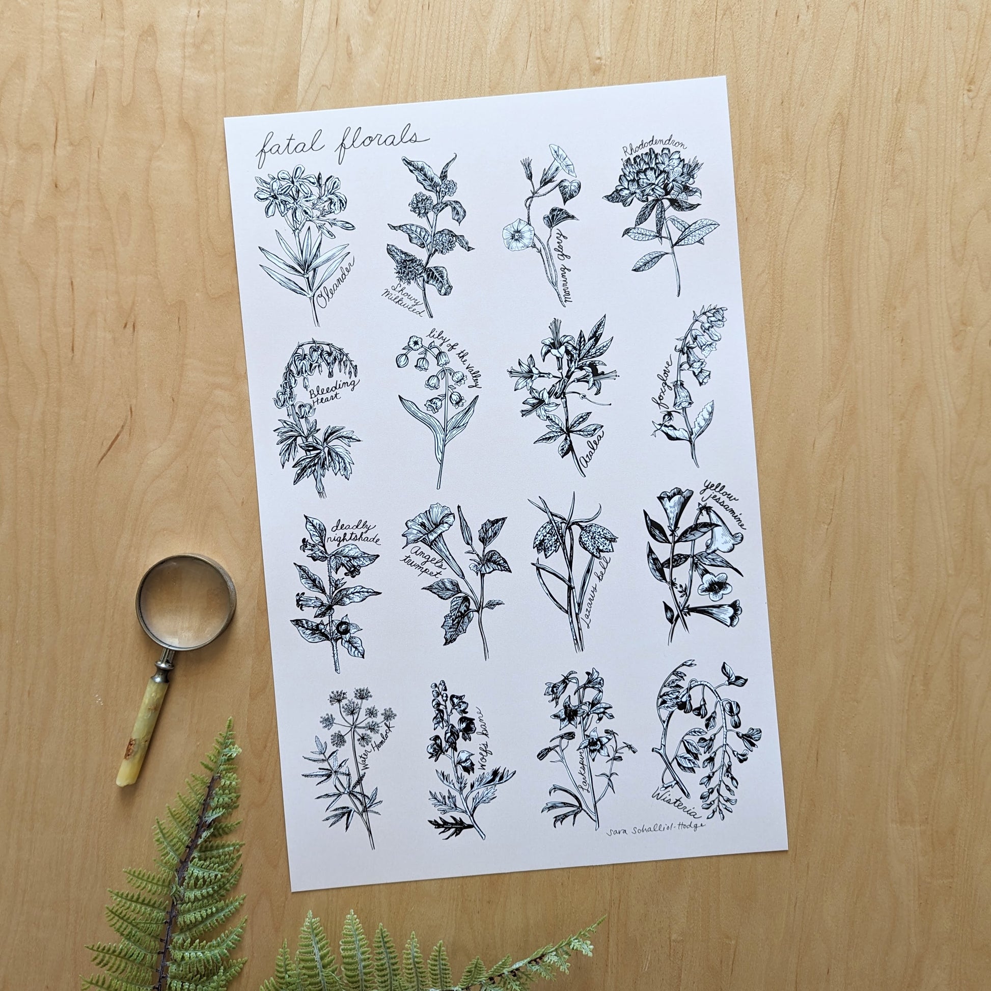An archival print featuring 16 poisonous flower illustrations by ilikesara / Sara Schalliol-Hodge. "Fatal Florals" is printed with archival inks on 80 lb cover paper. The background color is beigey while the flowers are black and white, giving these illustrations a subtle pop.