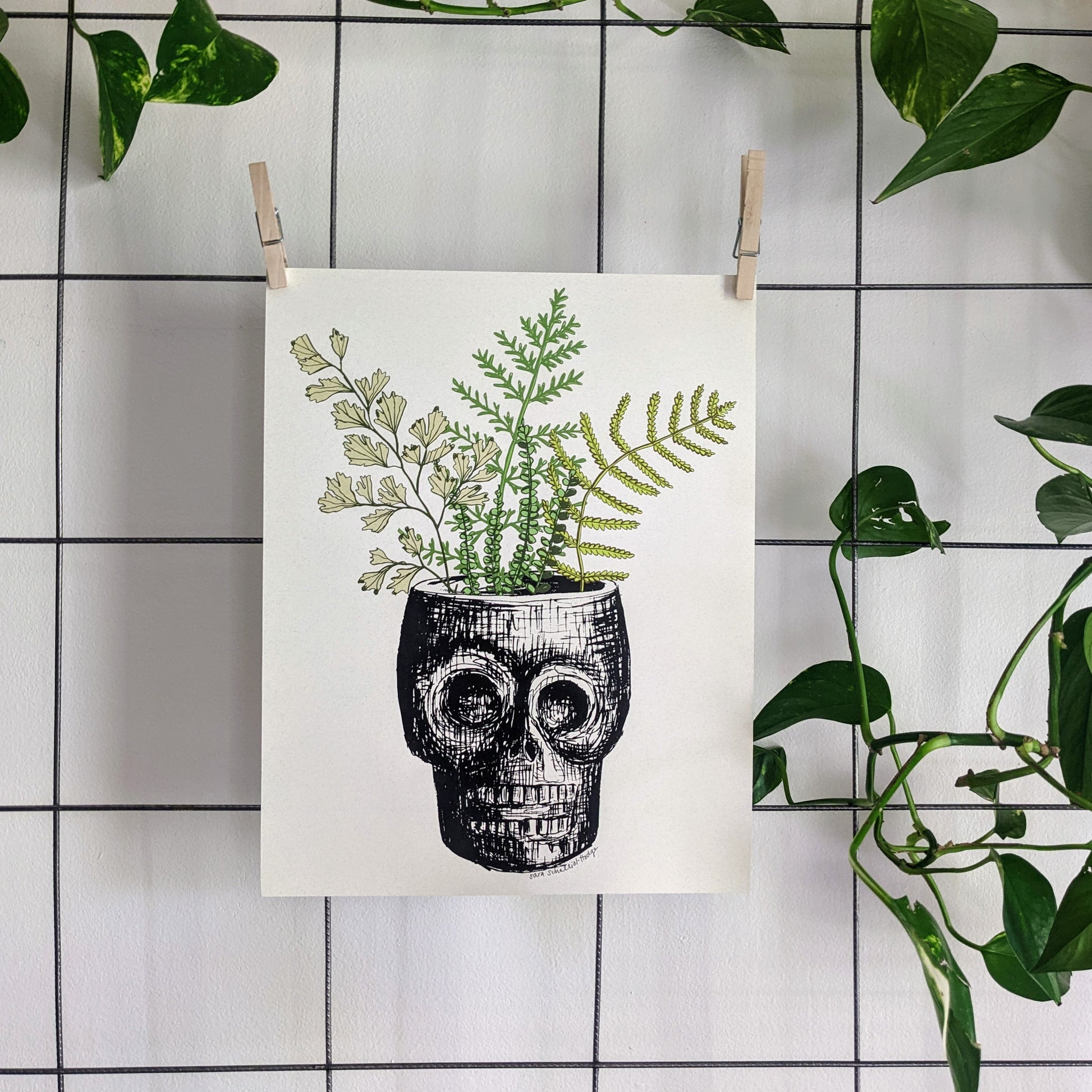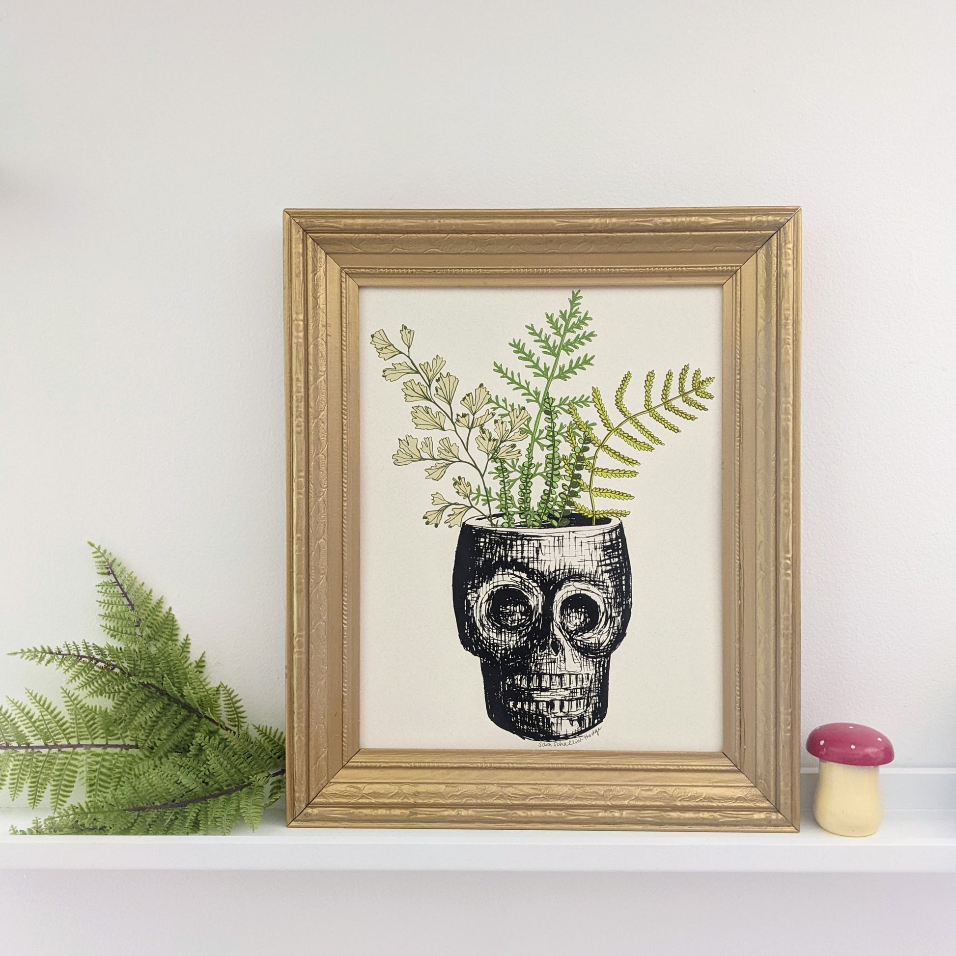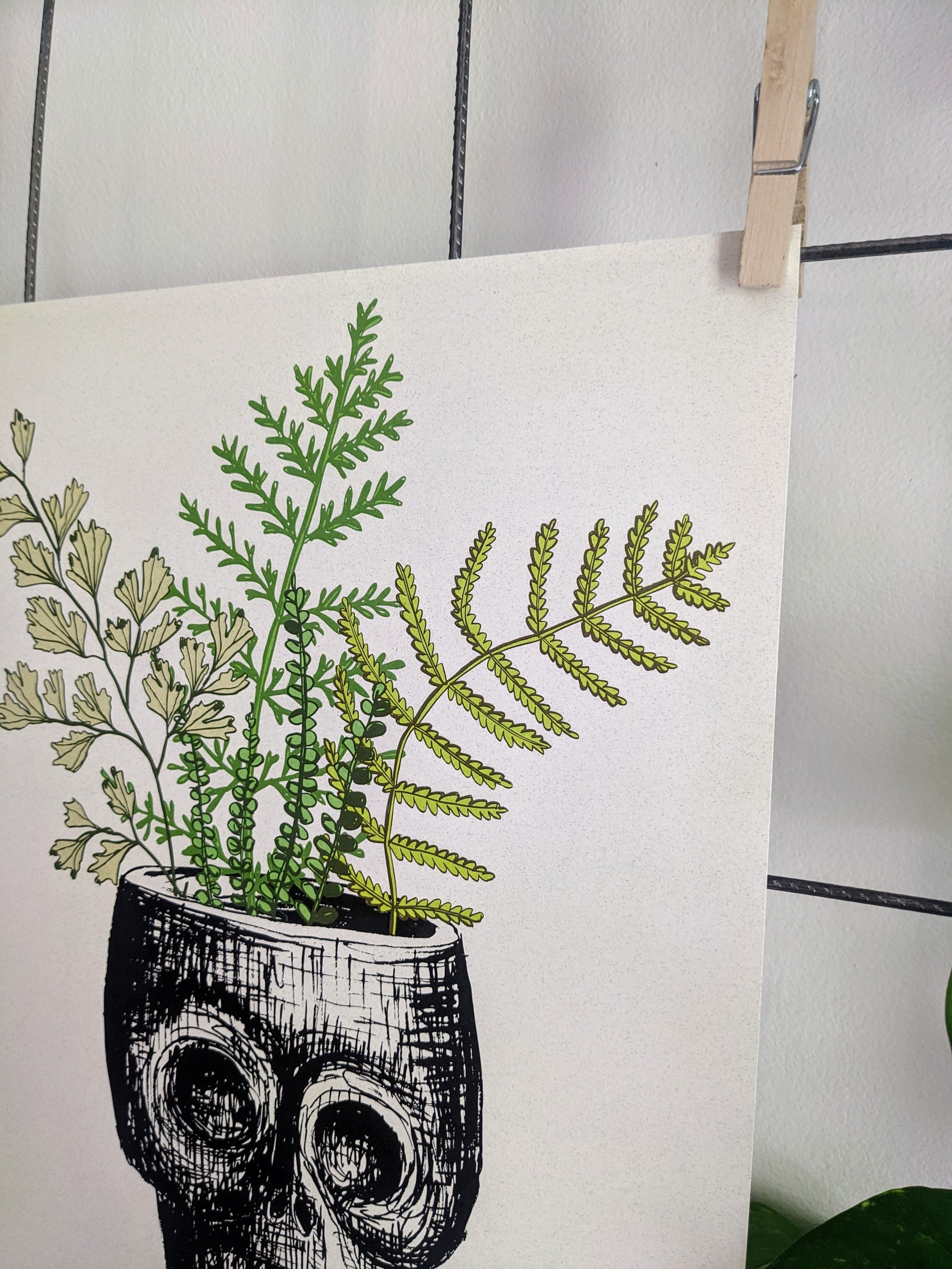 An archival print of various fern specimens, housed in a skull vase with tiki vibes.
