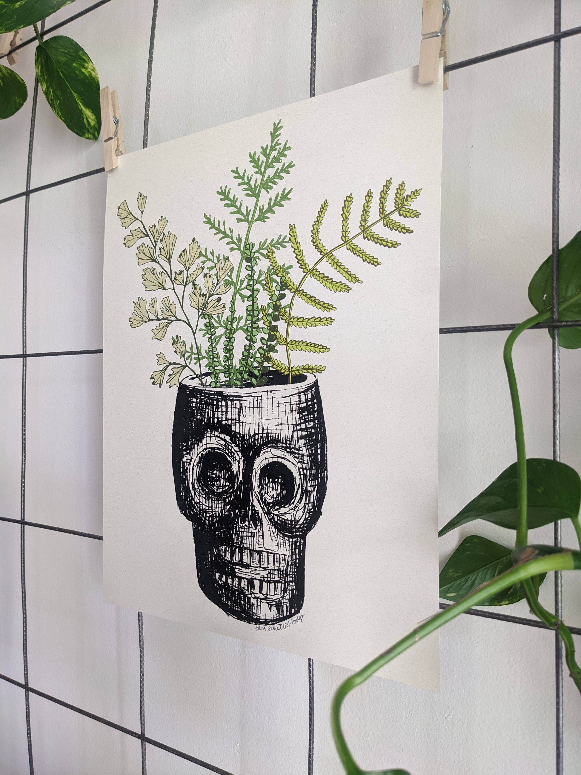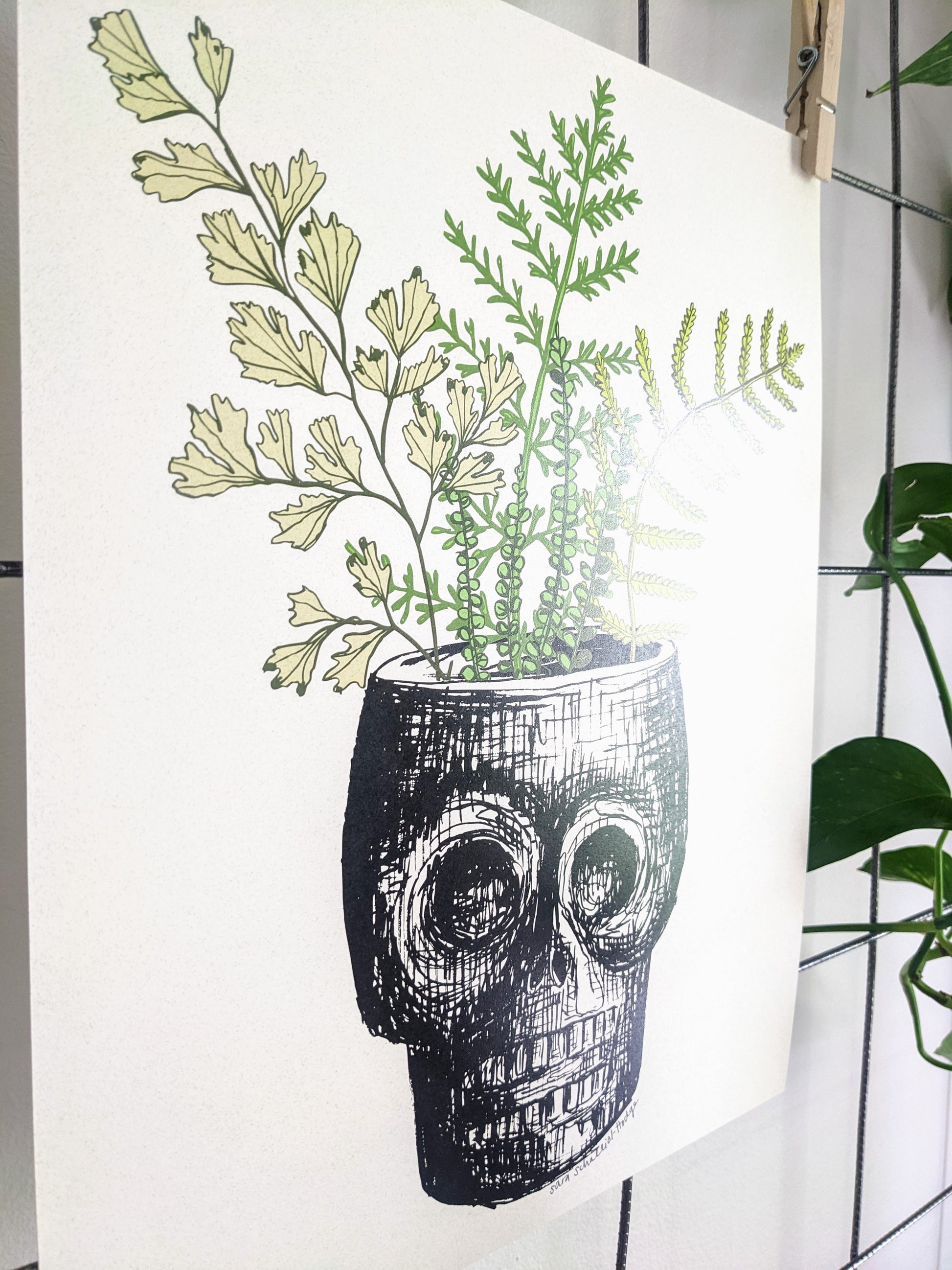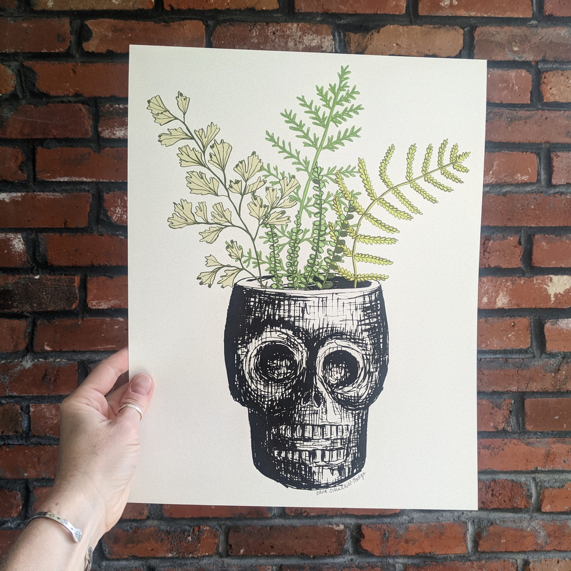 An archival print of various fern specimens, housed in a skull vase with tiki vibes.