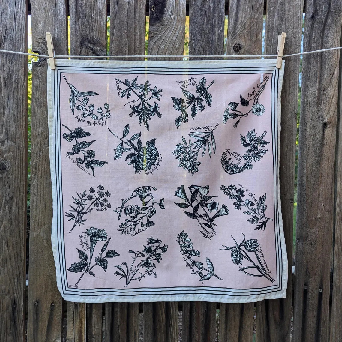 A sweet looking floral bandana, with a dangerous twist... poisonous flowers! Featuring Deadly Nightshade, Oleander, Morning Glory, Lily of the Valley, Water Hemlock, Showy Milkweed, and Wolf's Bane. Made up of hand-drawings by ilikesara aka Sara Schalliol-Hodge, this bandana is made of the softest premium cotton. Hand screenprinted with black and pink inks onto unbleached cotton.
