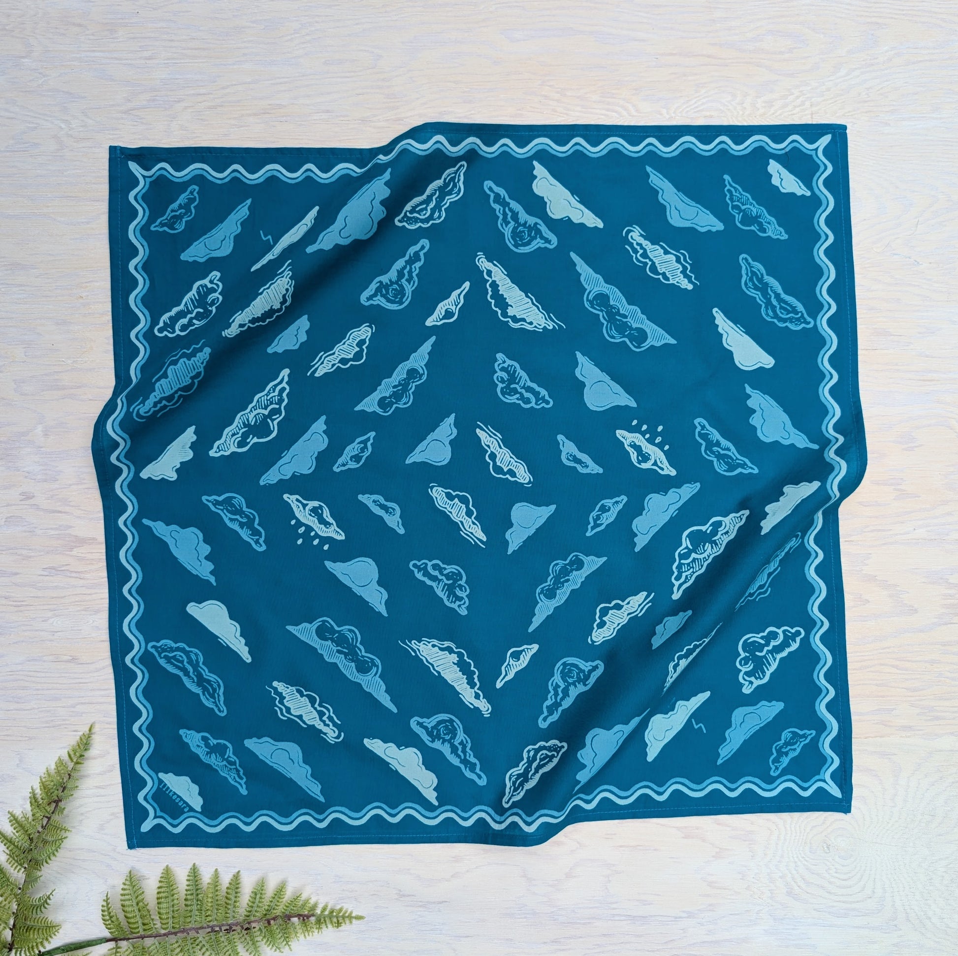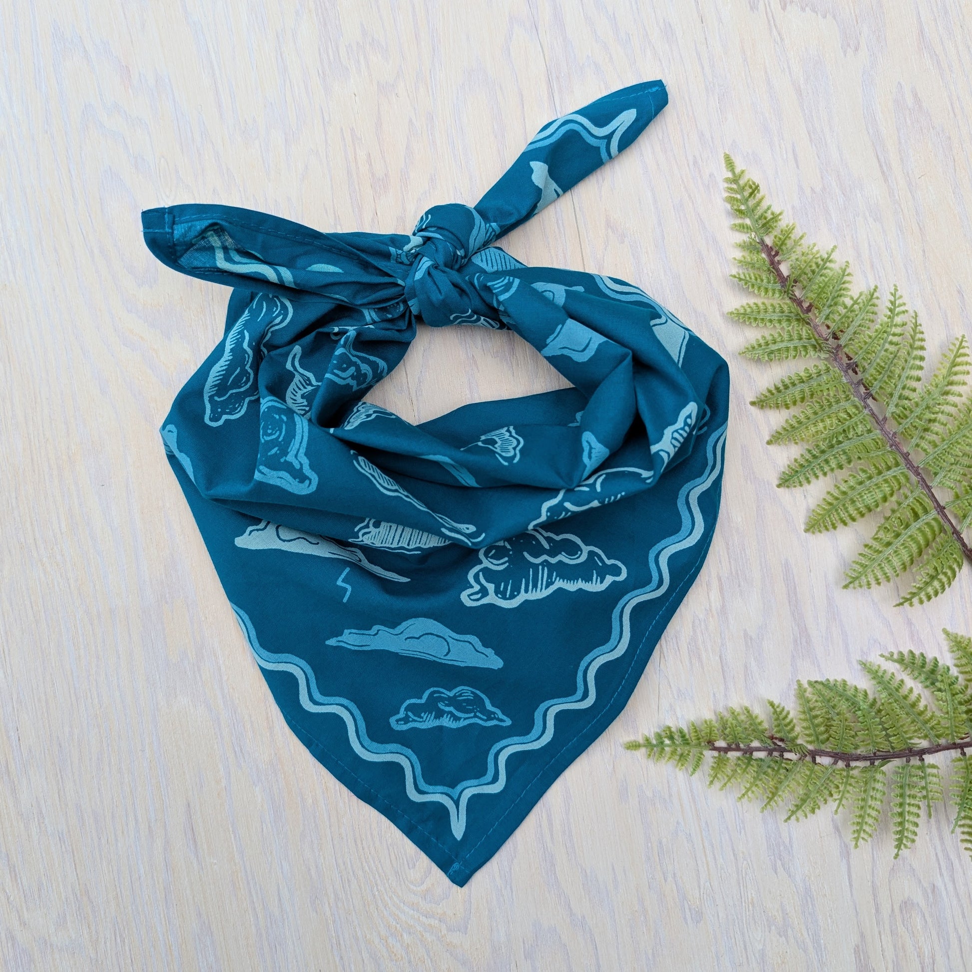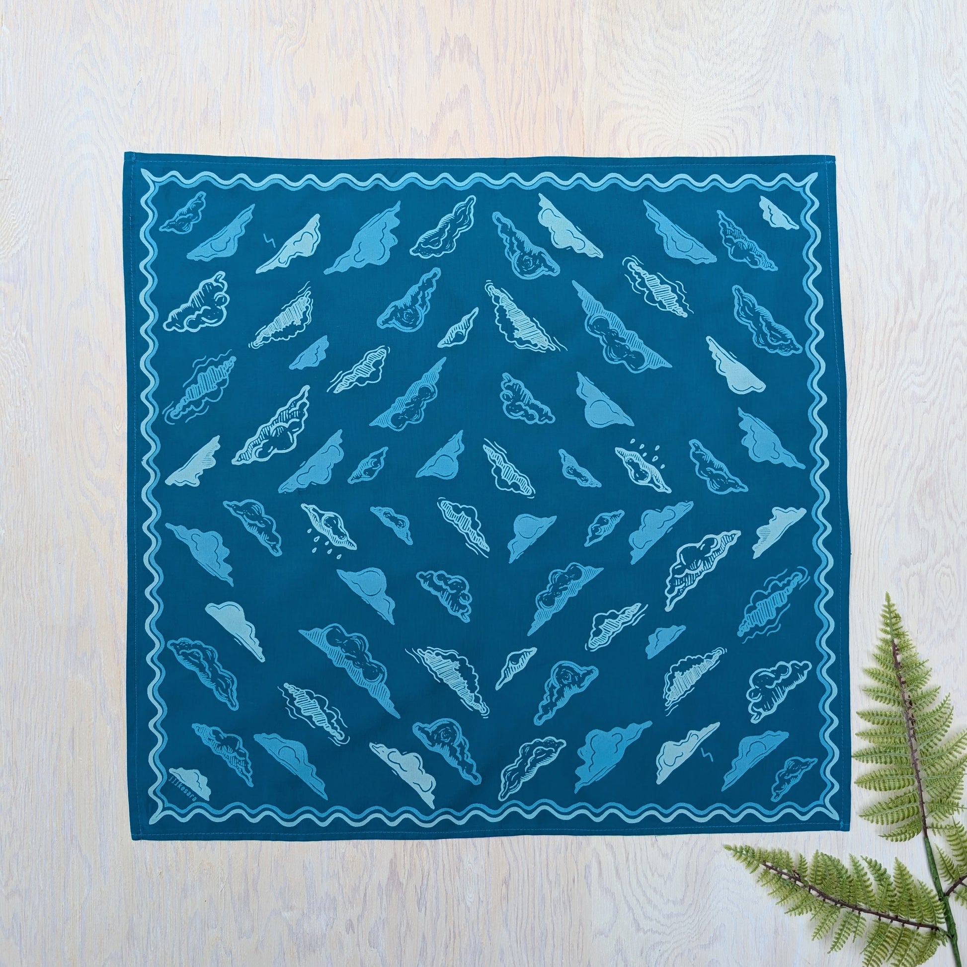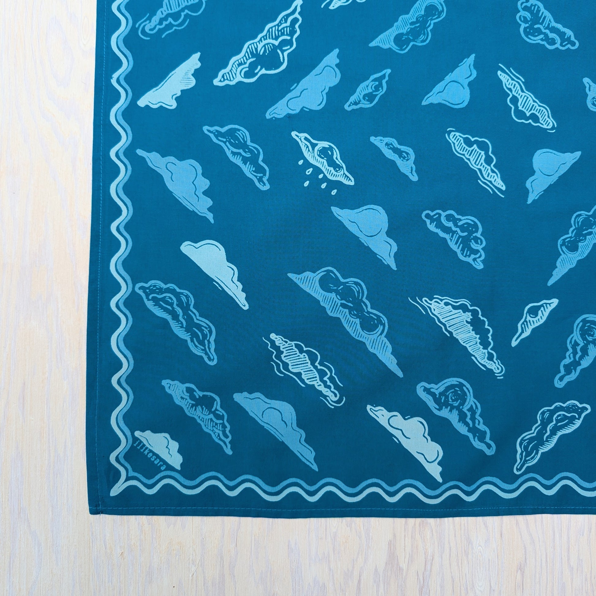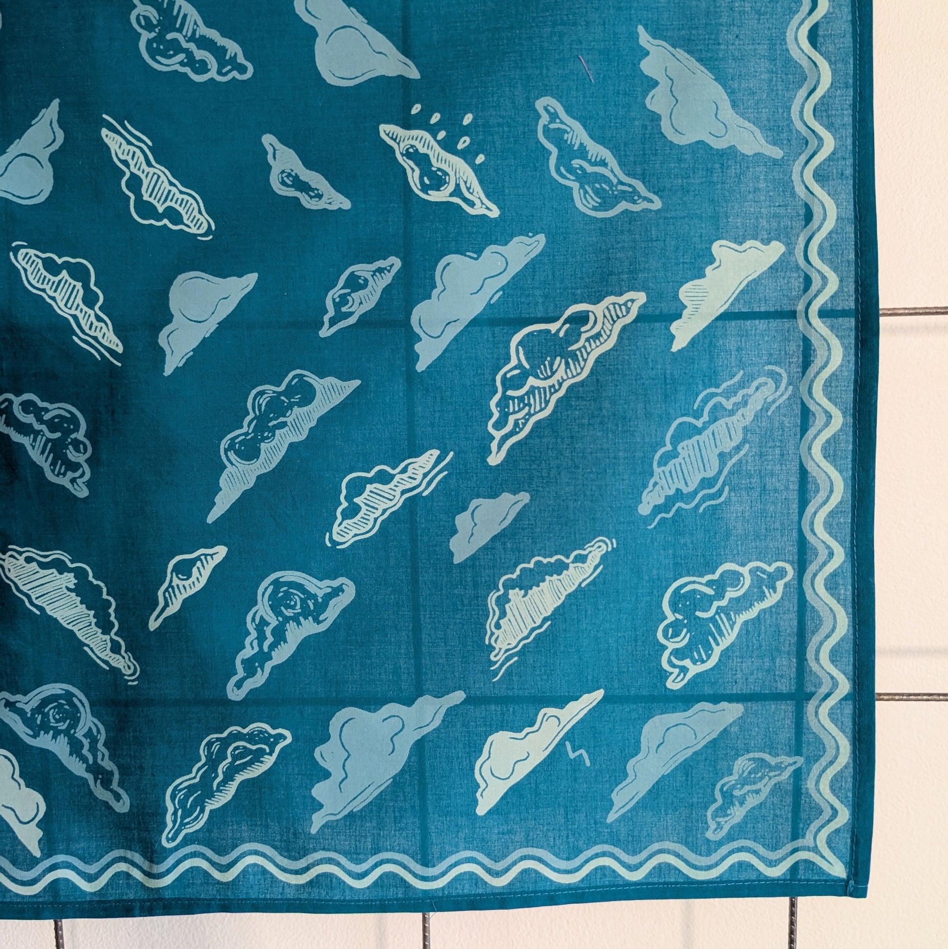 This soft, premium cotton bandana features a swirling sky of cloud forms surrounded by a wavy border. Hand screenprinted in 3 shades of blue (cerulean blue, dusty blue, and sky blue), this bandana is made from linoleum block prints and hand illustrations by ilikesara / Sara Schalliol-Hodge.