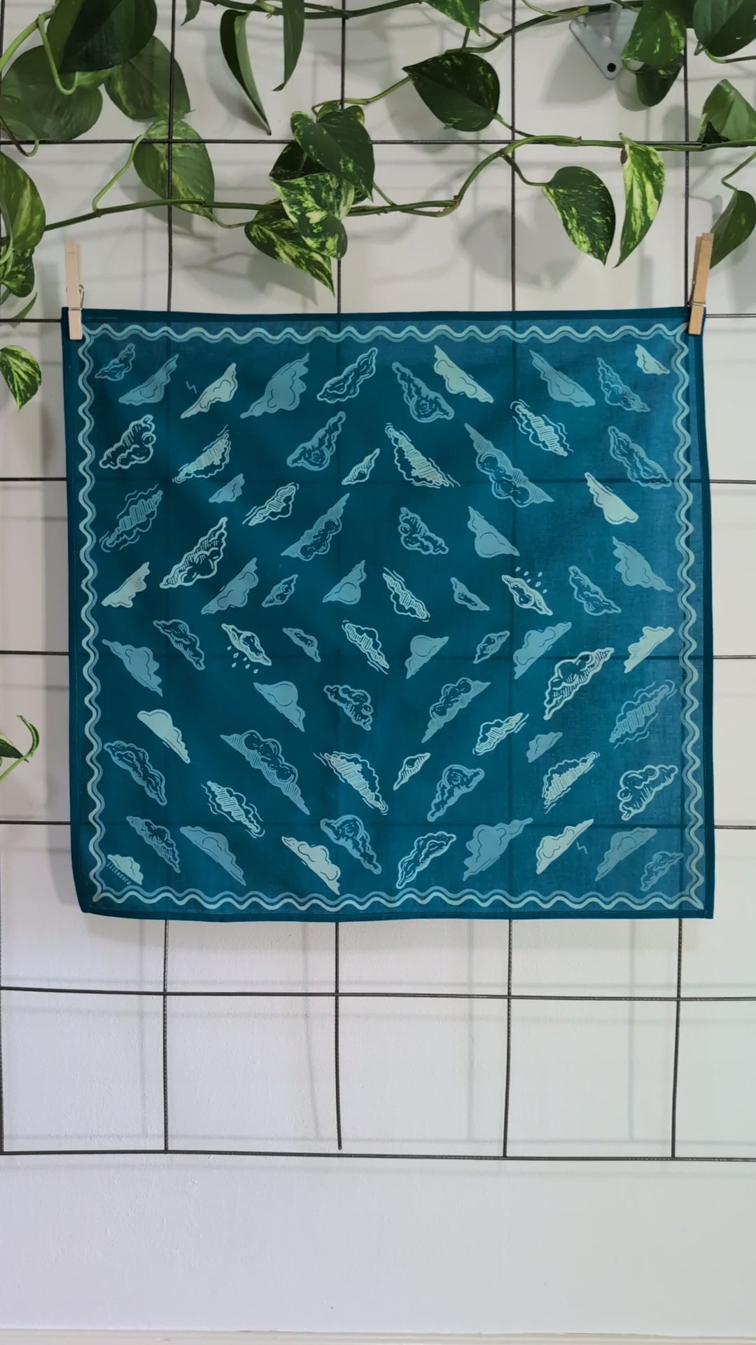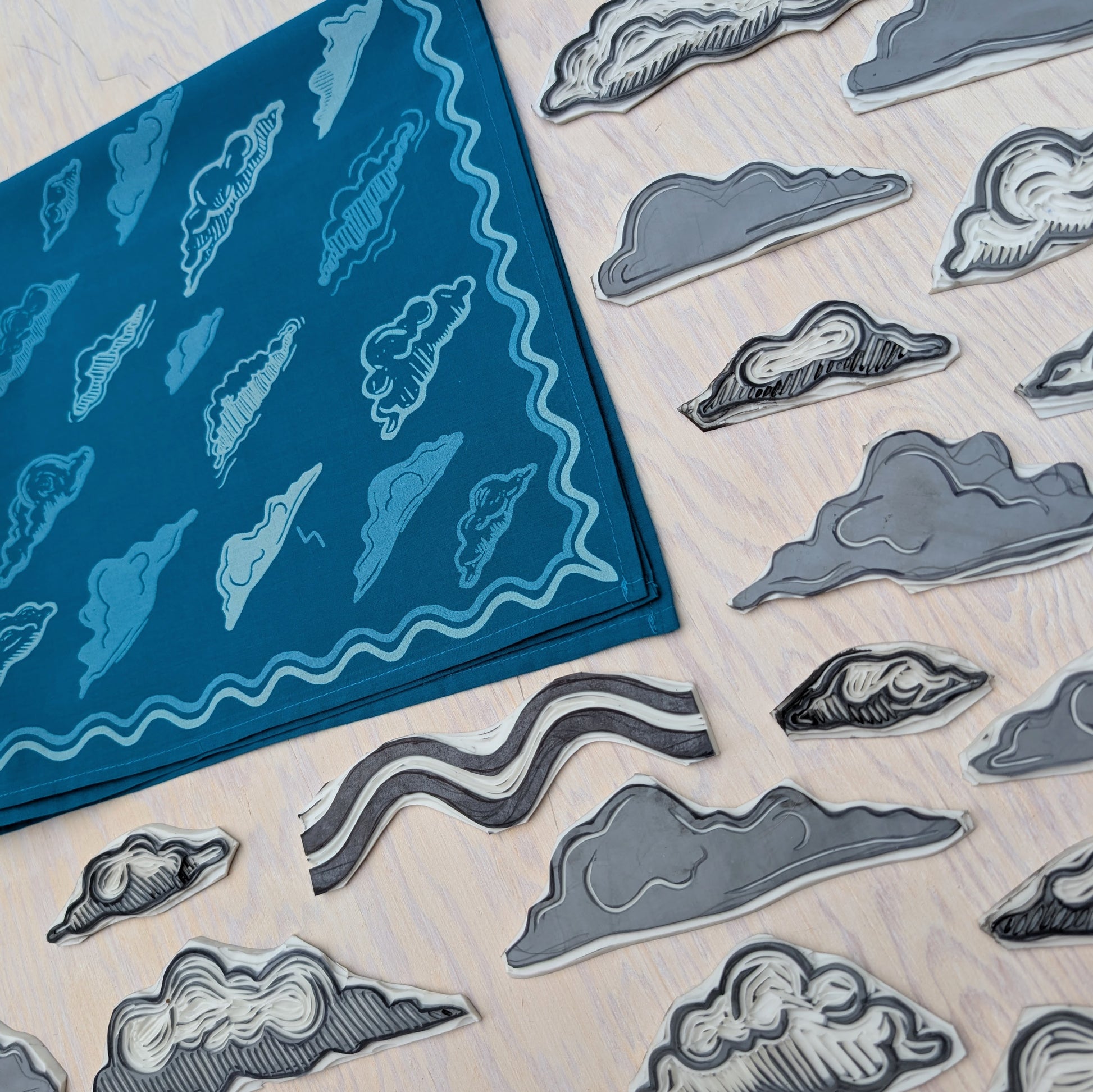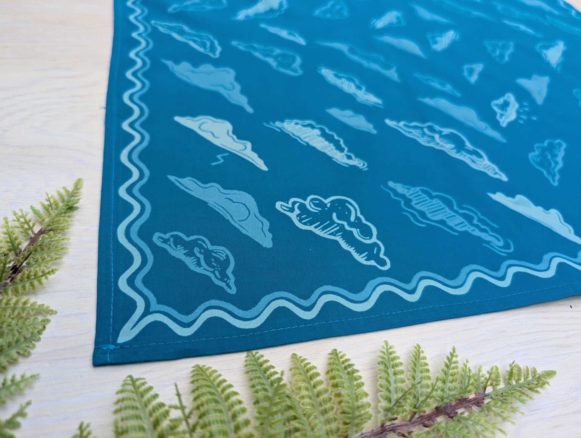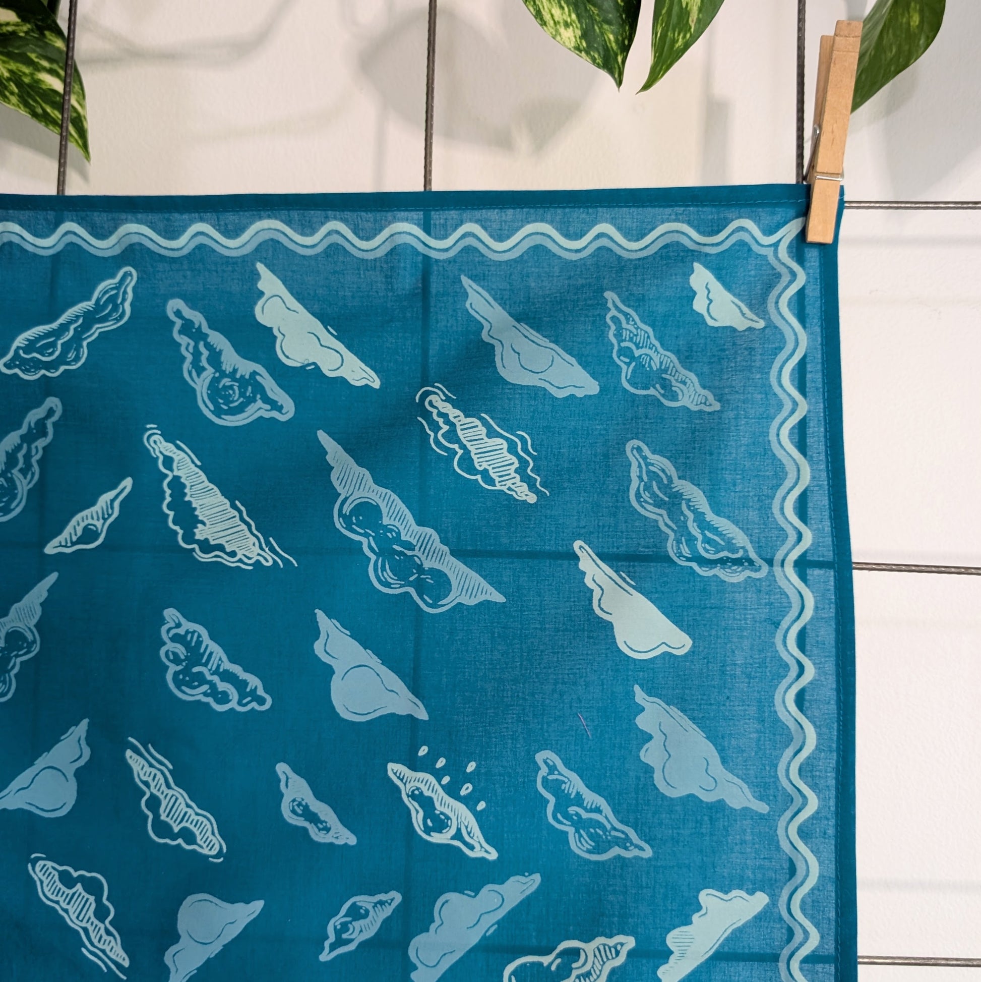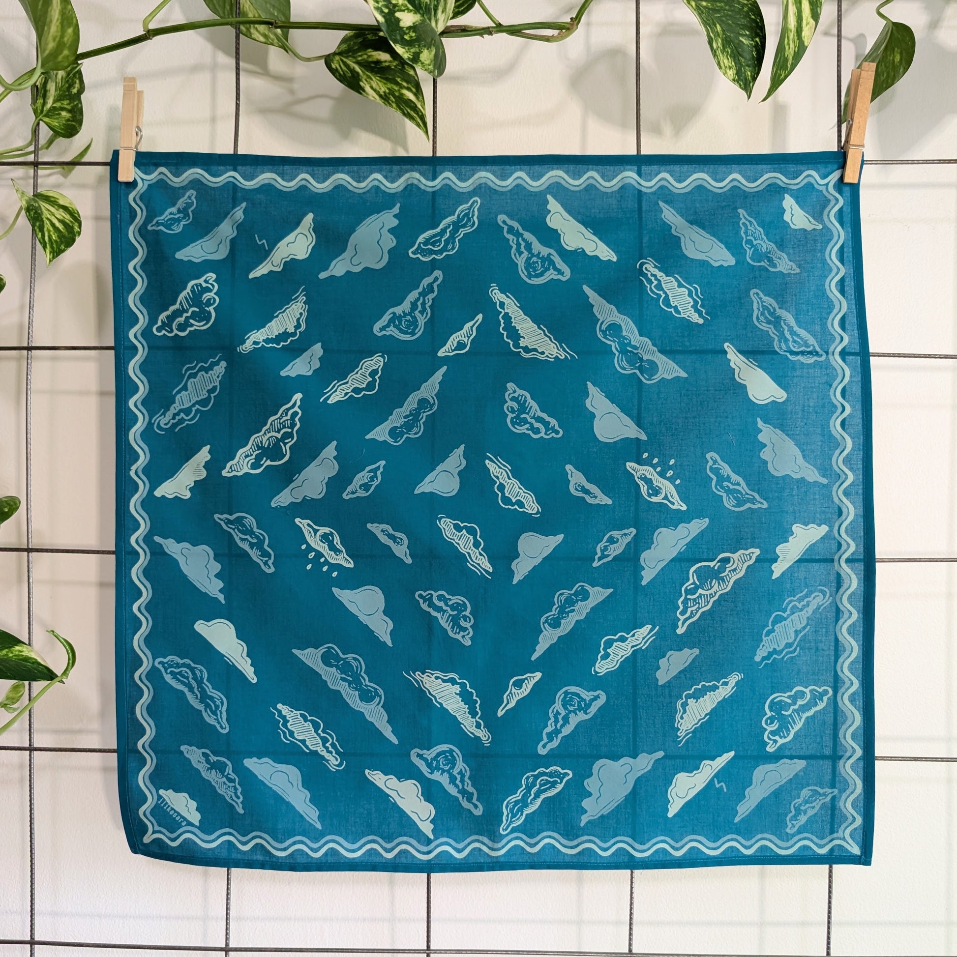 This soft, premium cotton bandana features a swirling sky of cloud forms surrounded by a wavy border. Hand screenprinted in 3 shades of blue (cerulean blue, dusty blue, and sky blue), this bandana is made from linoleum block prints and hand illustrations by ilikesara / Sara Schalliol-Hodge.