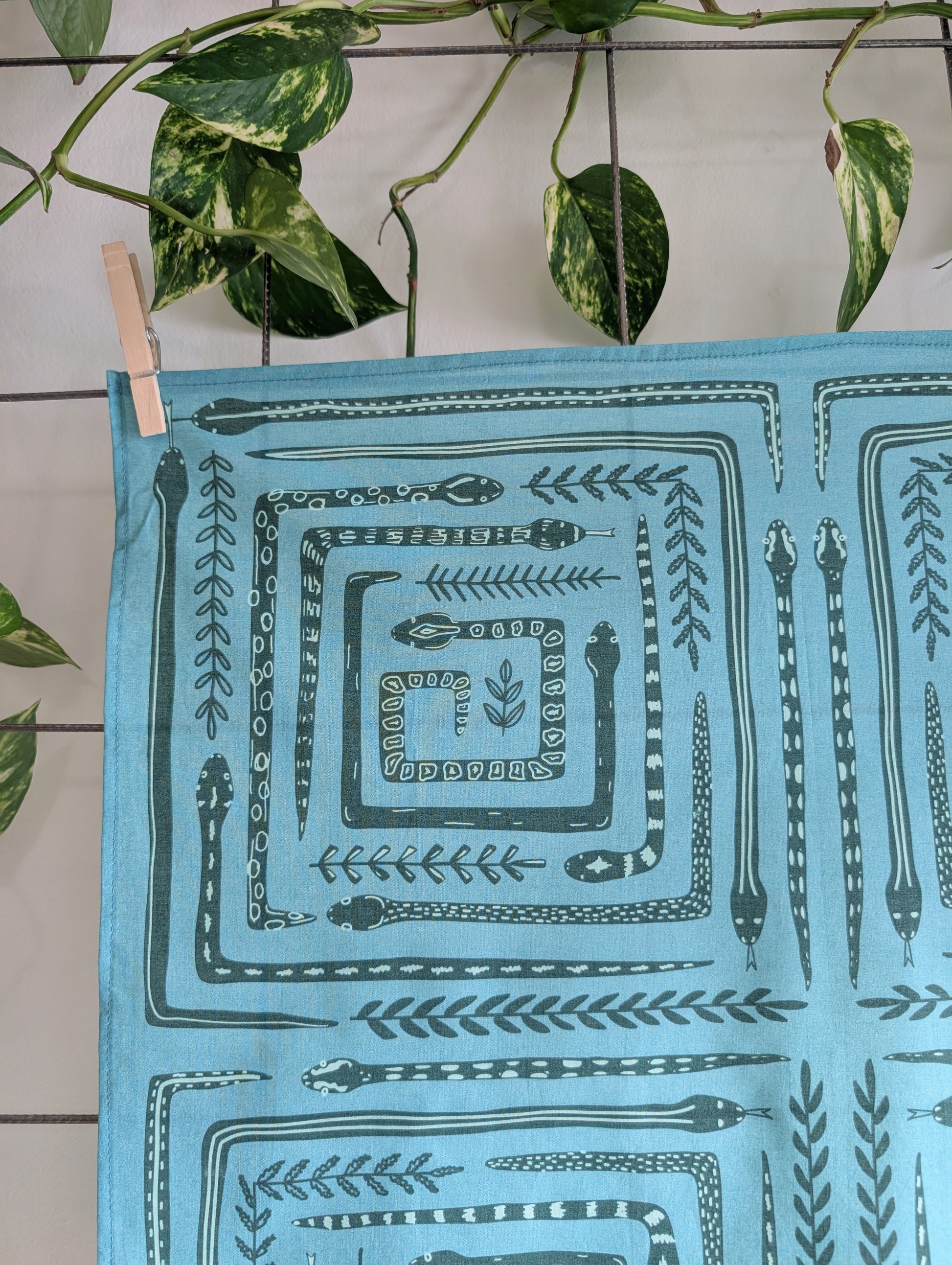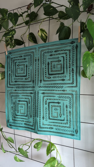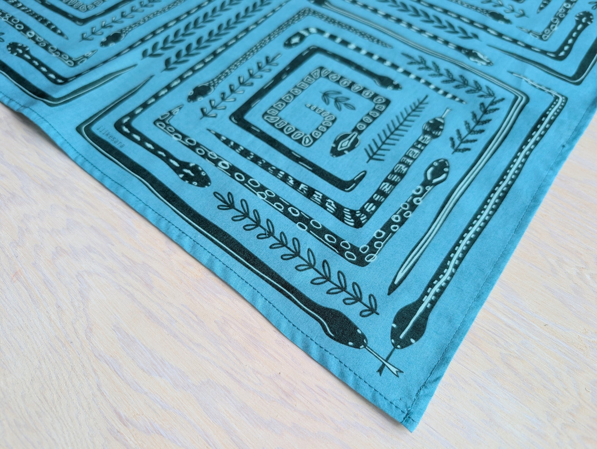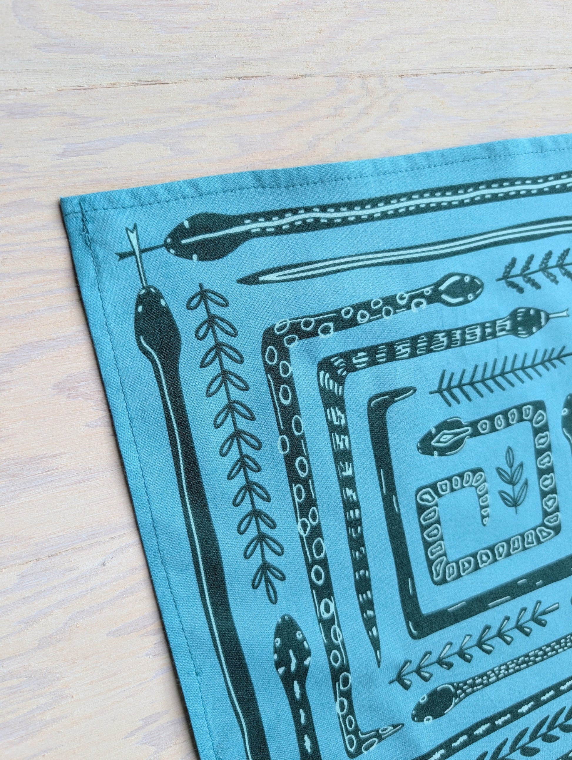 This soft, premium cotton bandana features a bold, graphic snake maze in four mirrored quadrants, with tiny botanical sprigs woven throughout. Handscreenprinted in deep teal with turquoise accents on a bright teal blue background, it’s equal parts vintage folk-art and playful woodland charm.