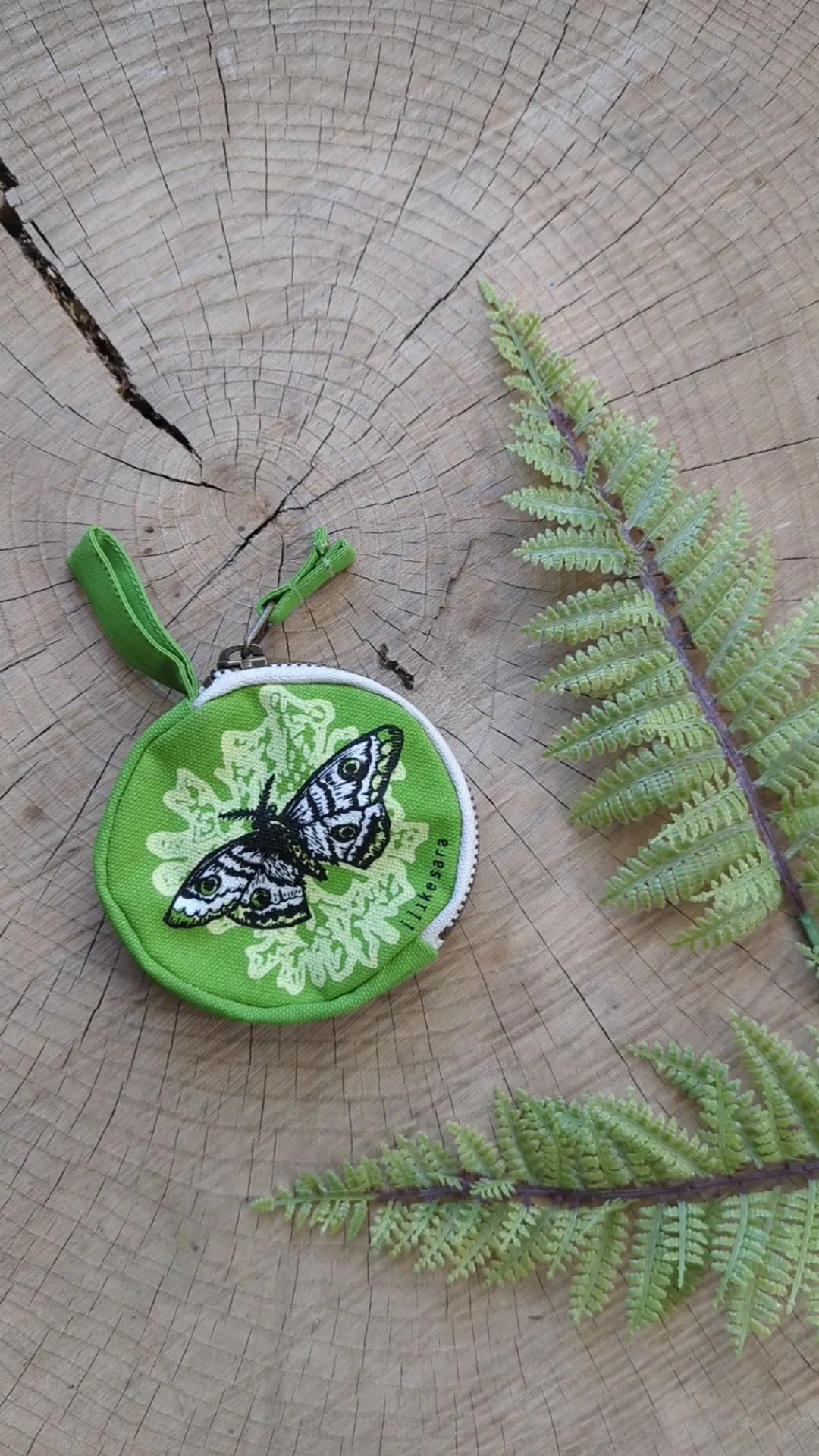 This polyphemus moth (and lichen!) pouch will happily store your spare change, ear buds, travel sewing supplies, on-the-go candy stash, etc! Hand-screenprinted in grassy green, light green, black, and white inks onto cotton canvas, this little pouch will help corral your small things and look cute doing it. Featuring a water-resistant lining, metal zipper (with fabric pull), and carrying loop, this pouch design is based on an original illustration by ilikesara / Sara Schalliol-Hodge.