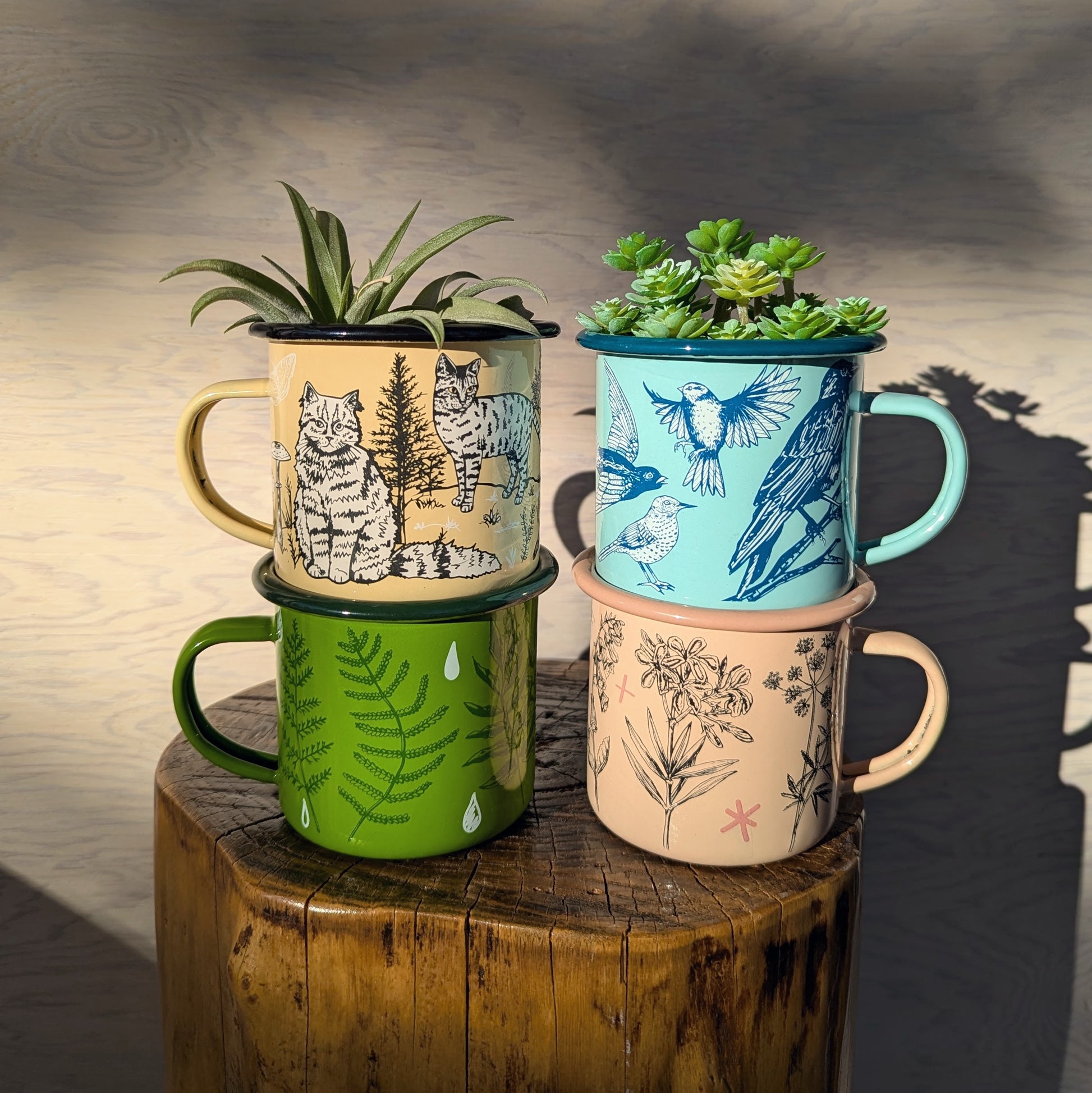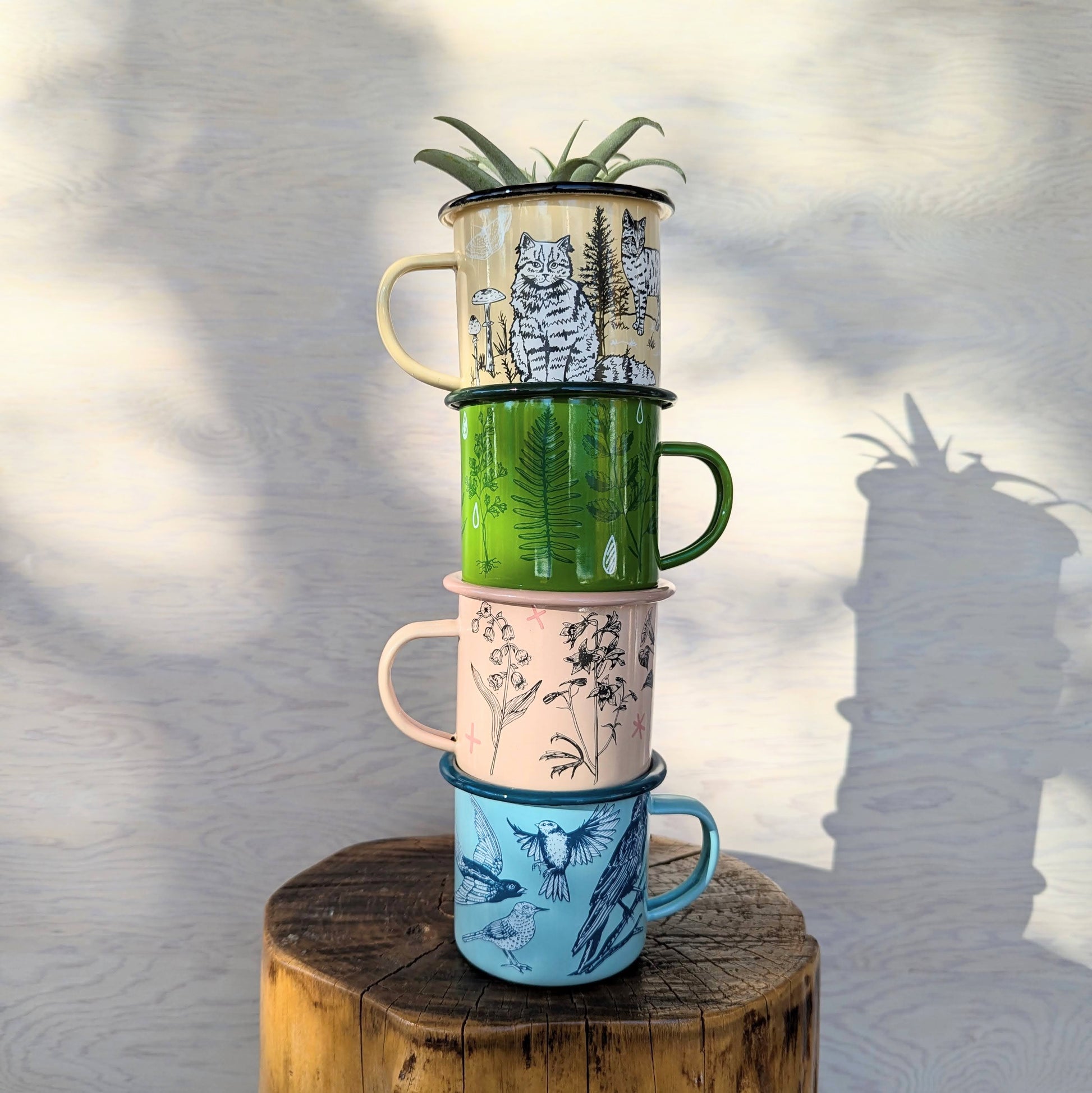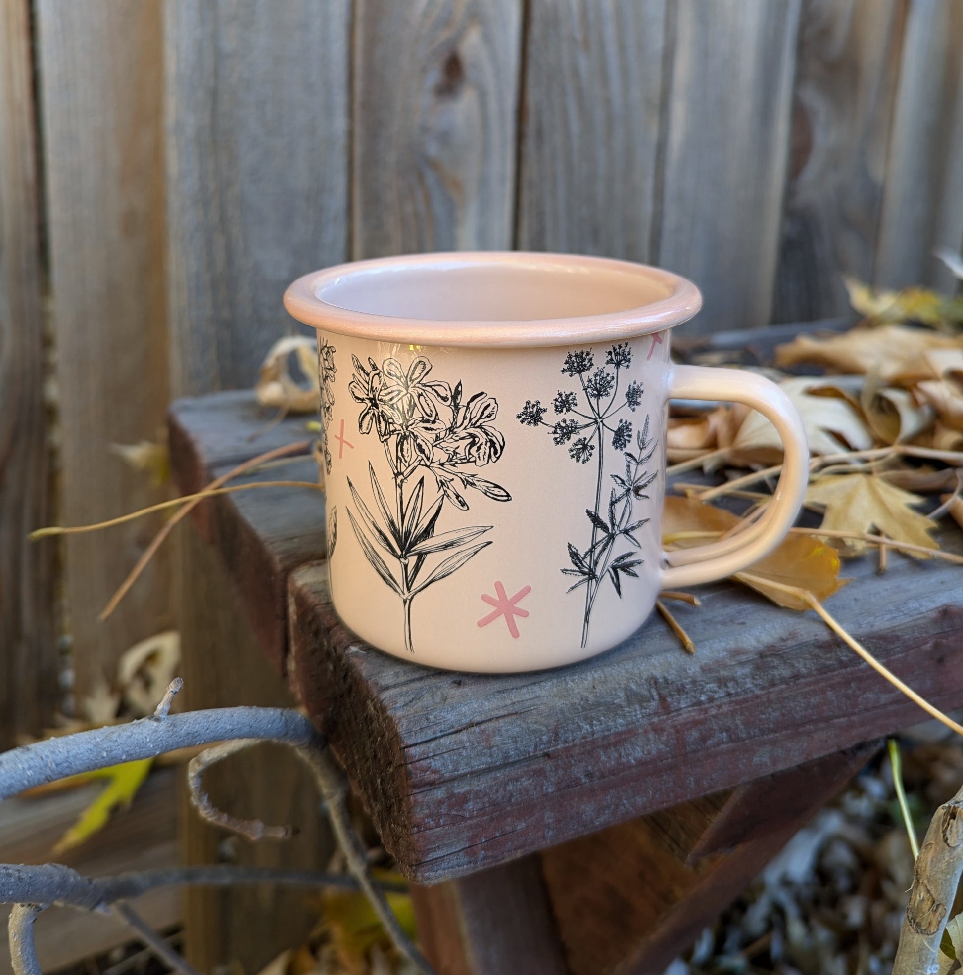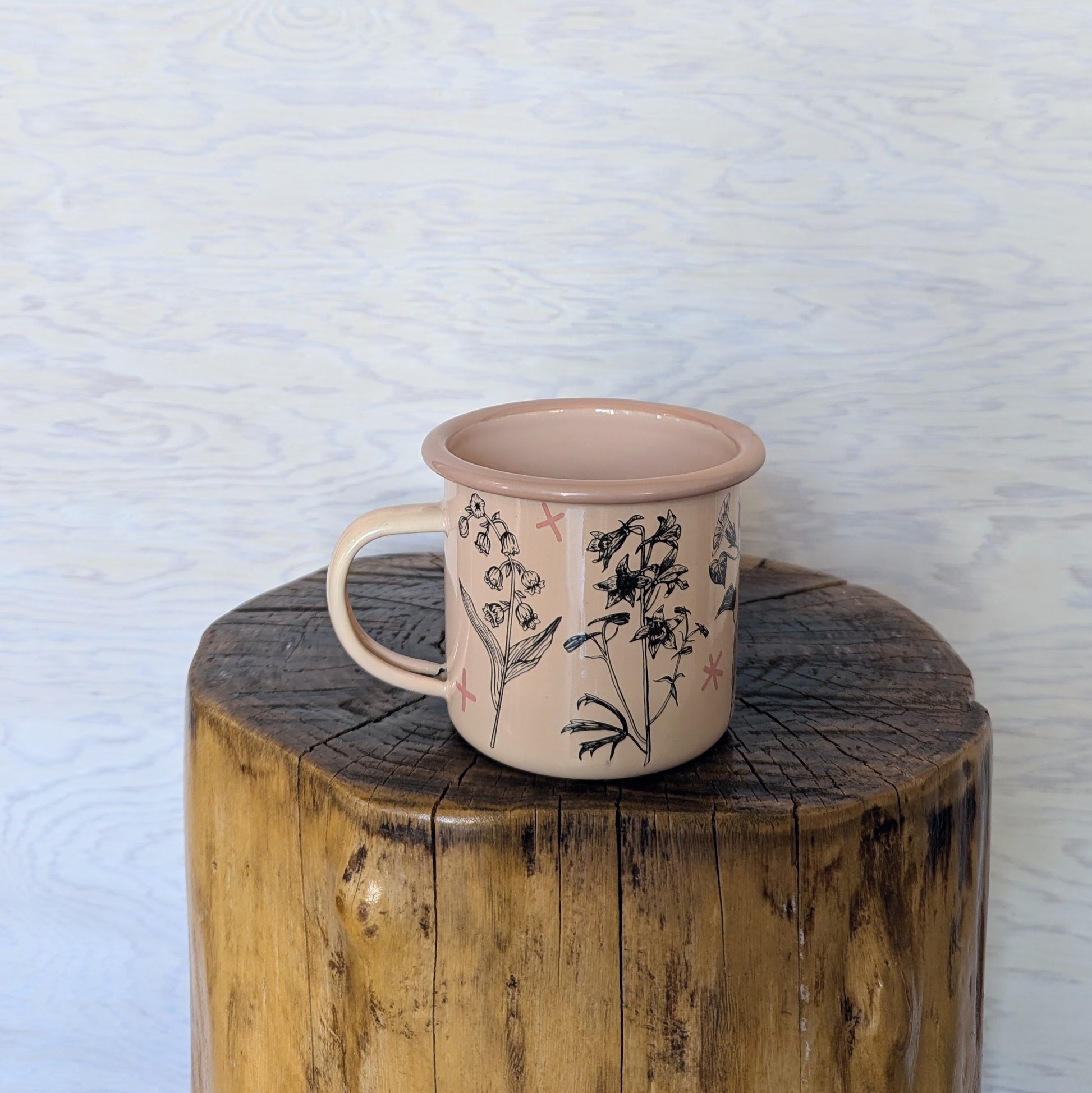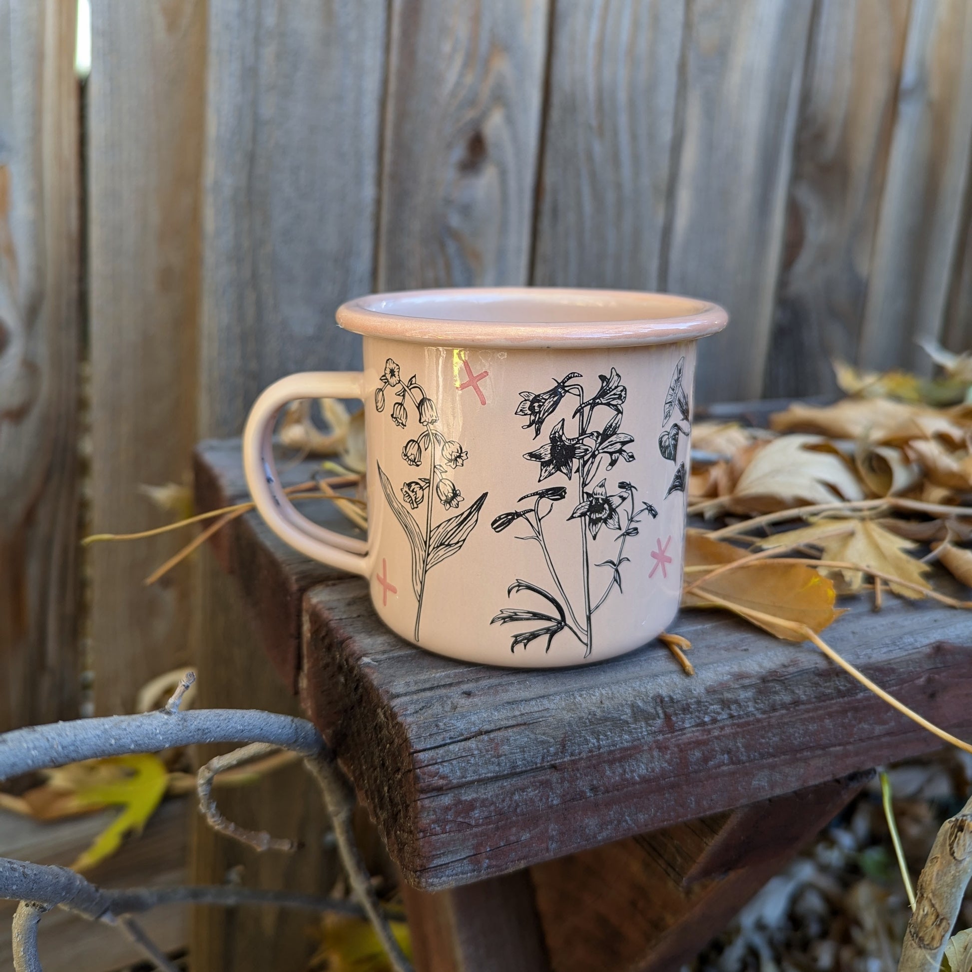 Featuring Lily of the Valley, Larkspur, Morning Glory, Foxglove, Oleander, and Water Hemlock all based on hand-drawings by ilikesara aka Sara Schalliol-Hodge. These are not your average enamel mug; the colors are vibrant (light rose with pink and black), the illustrations are crisp, and the carbon steel is thickly coated with enamel.