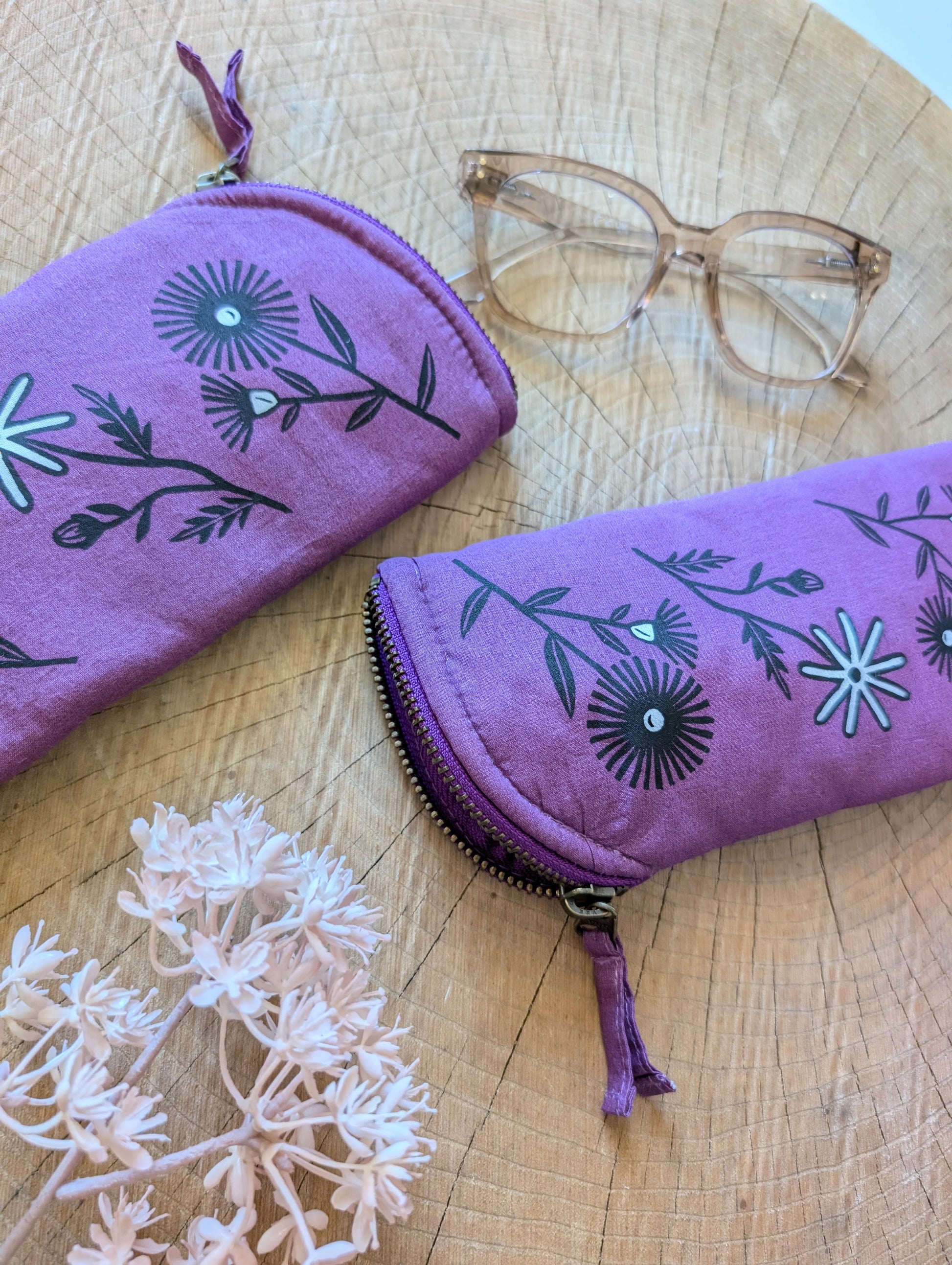 Keep those glasses or sunglasses in a safe, cushy spot while adding some flower vibes to your everyday. Based on original blockprints by ilikesara and hand screenprinted and sewn with care. Large enough to fit the biggest sunnies!