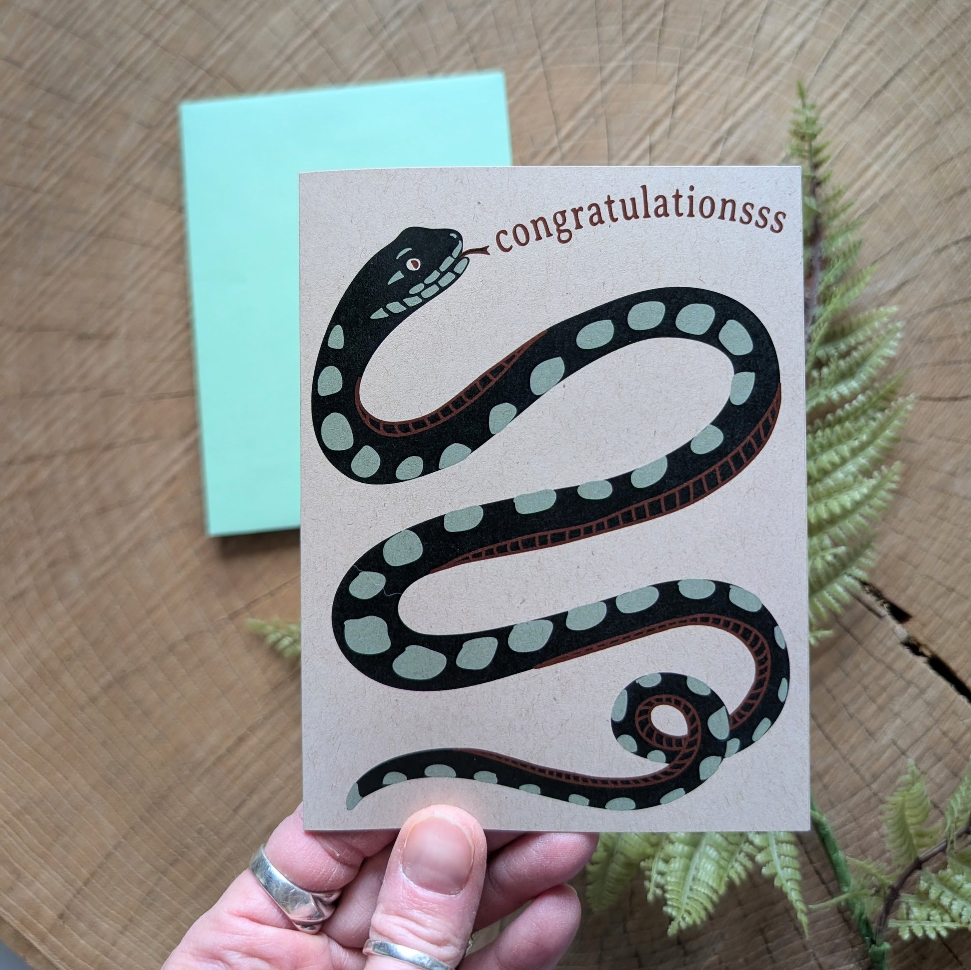 Send a little hiss of celebration. This congratulations card features a bold, folk-art style snake with turquoise spots. It’s a fun, slightly mischievous way to celebrate new jobs, graduations, big moves, engagements—any win worth cheering for.