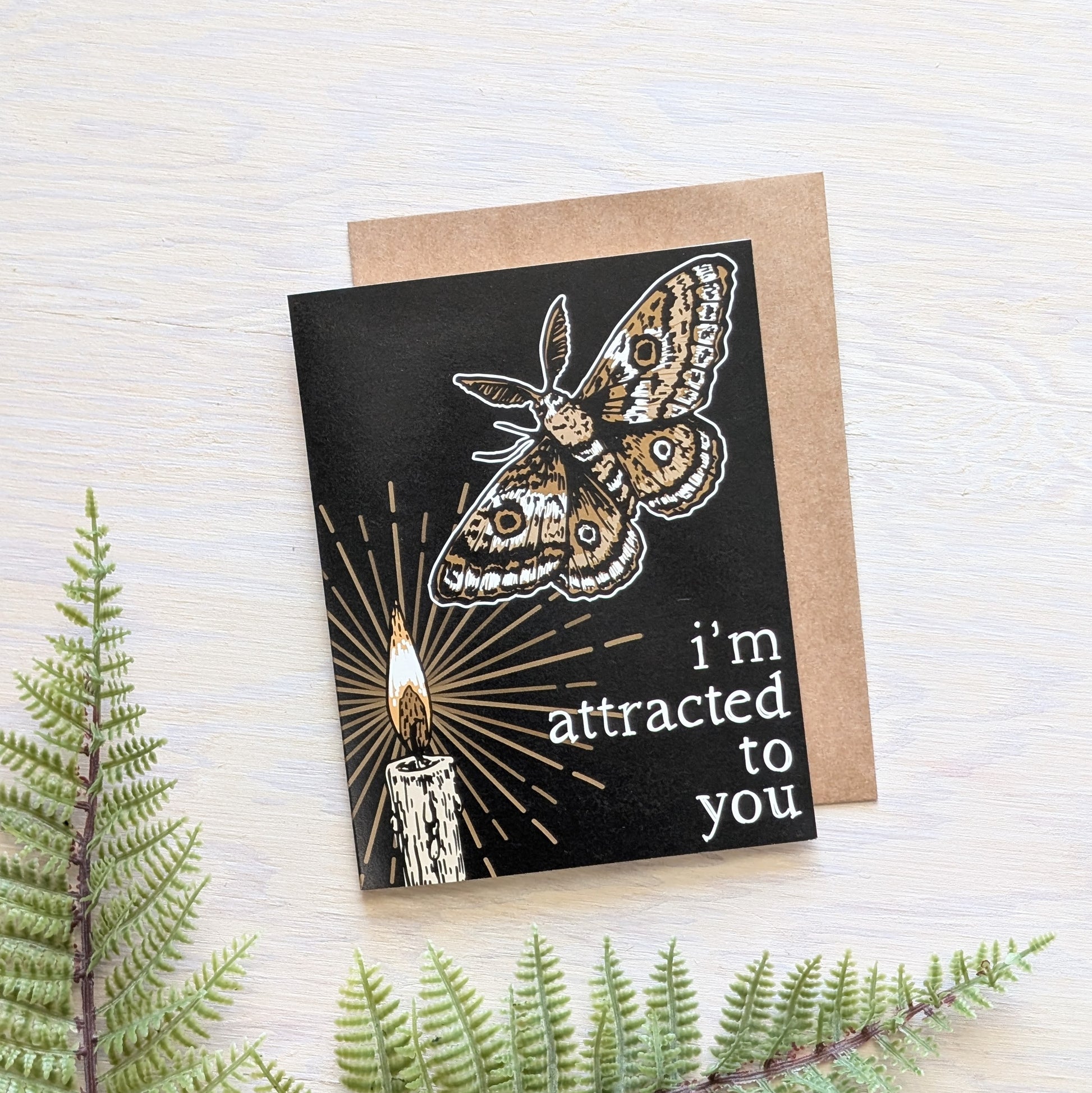 This emperor moth is feeling quite attracted to the lucky recipient of this card, which is based on original illustrations by ilikesara.