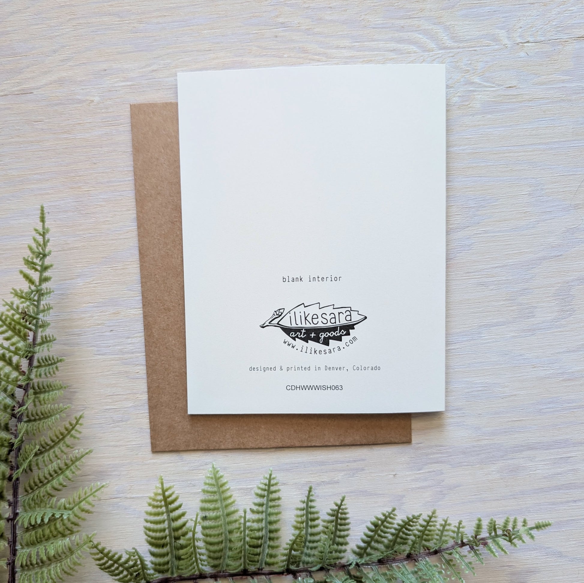 Send cozy cheer with this charming winter village scene. Made from a blockprint by ilikesara / Sara Schalliol-Hodge, this card captures the quiet magic of the season. A chimney-smoke message of “warm winter wishes” sweeps across the sky, making it perfect for Christmas, Hanukkah, New Year’s, or simply sending heartfelt greetings to loved ones in the winter time.