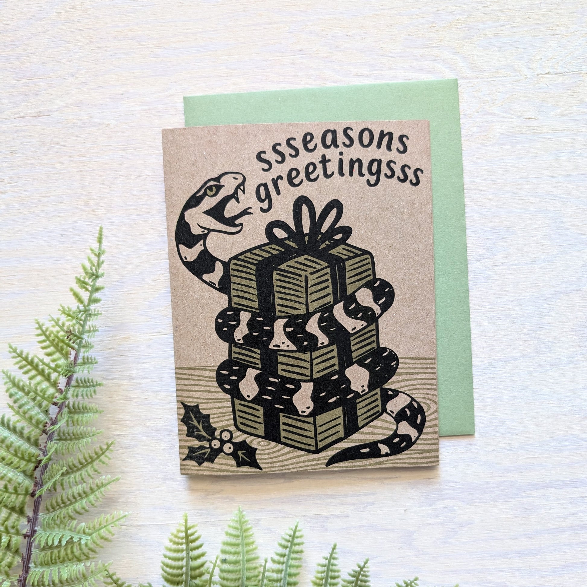 Add a playful twist to your holiday wishes with this slithery seasonal card. Featuring a snake coiled around a gift, this blockprint-style design is both woodsy and whimsical. Perfect for reptile lovers, nature enthusiasts, or anyone who enjoys sending greetings with a little bite. Illustrated by ilikesara / Sara Schalliol-Hodge.