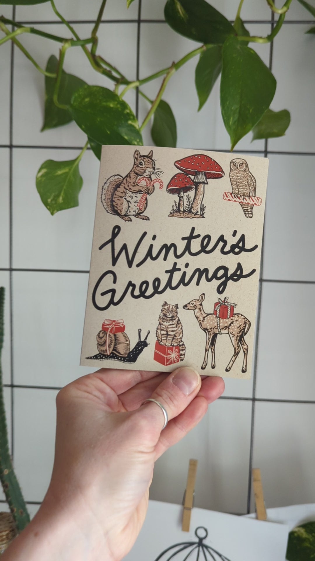 Wishing you warm woodland greetings from a squirrel with candy canes, fly agaric mushrooms, an owl with a peppermint stick, a snail with a gift, a cat with a present, and a deer with a package just for you!