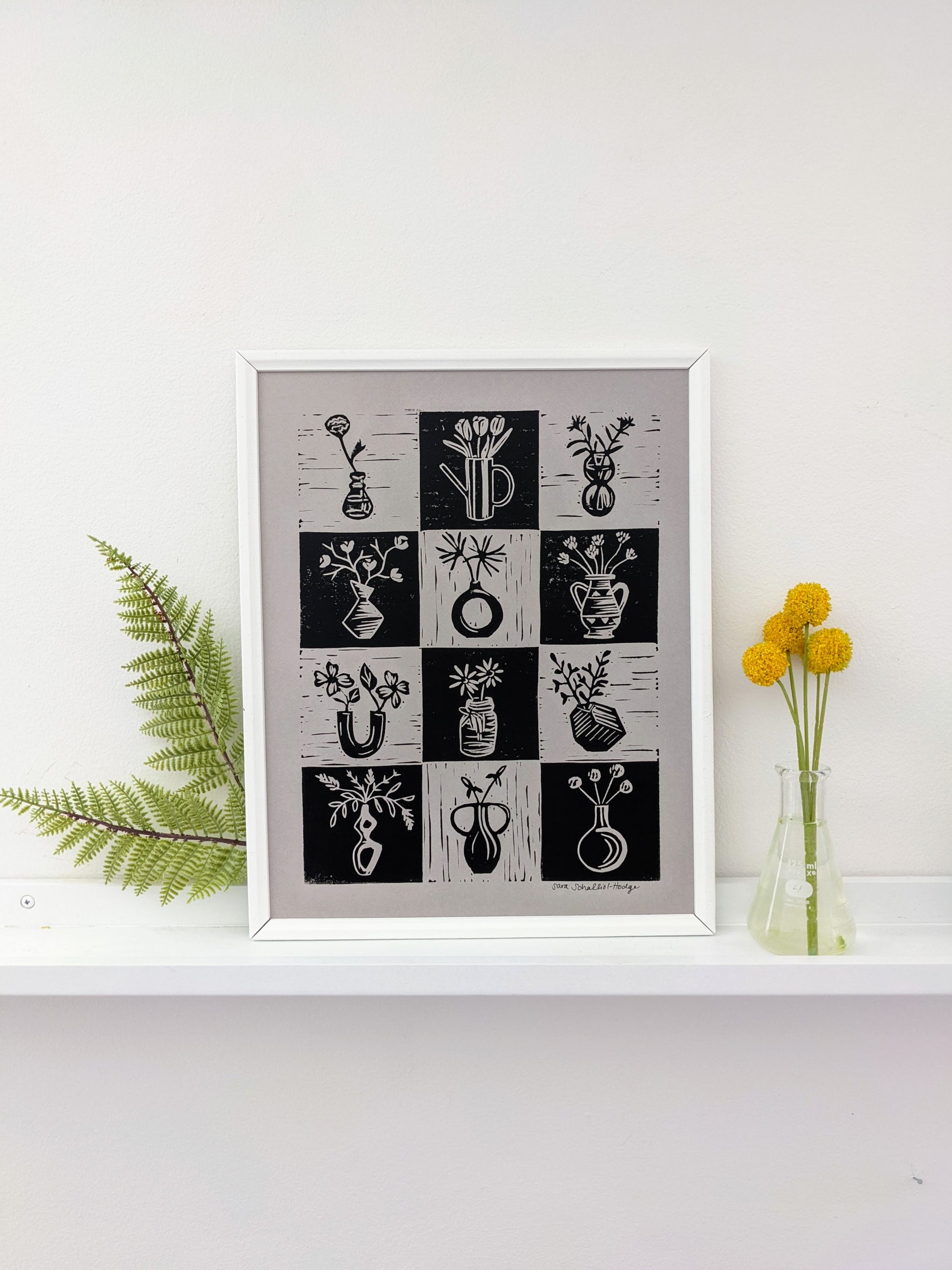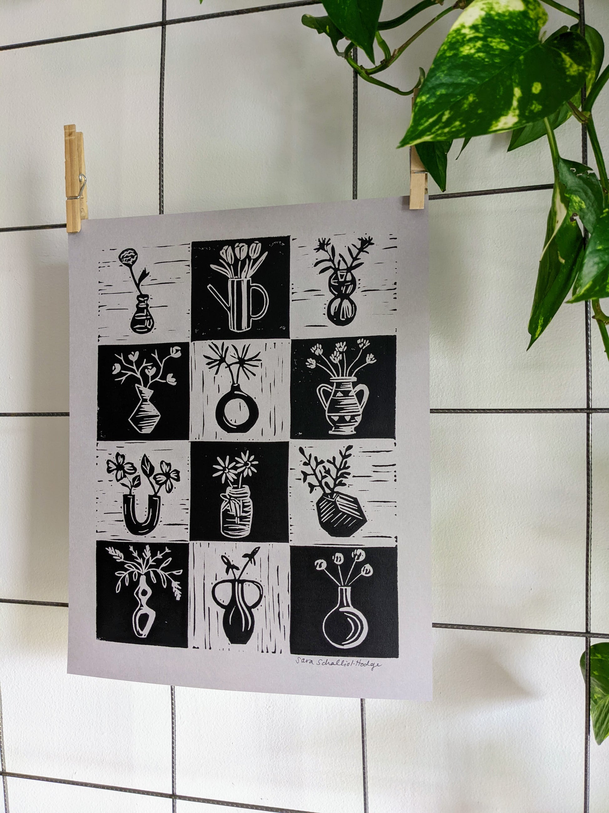 "Flower Grid" handprinted linocut blockprint by Sara Schalliol-Hodge