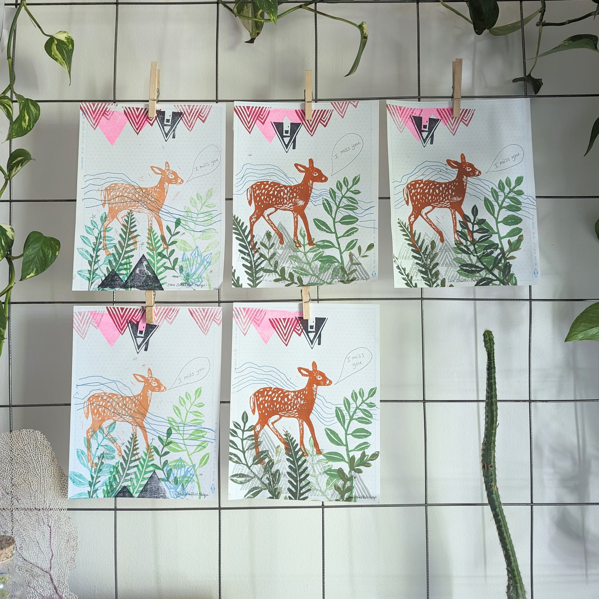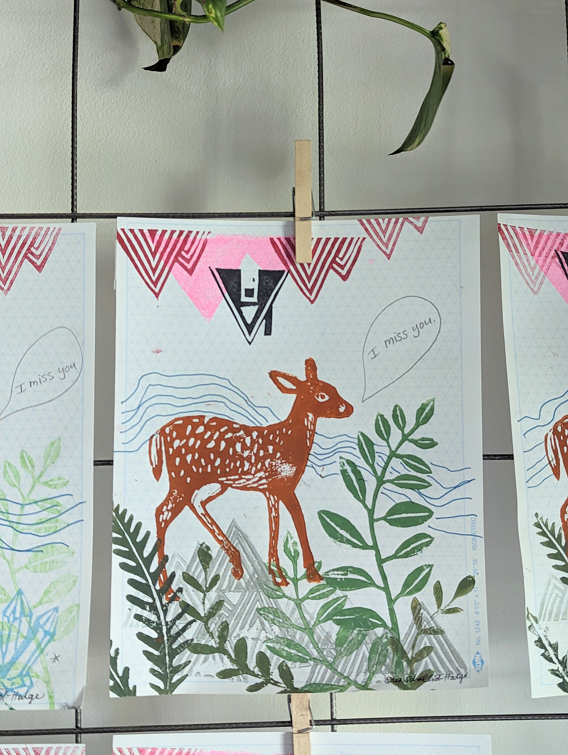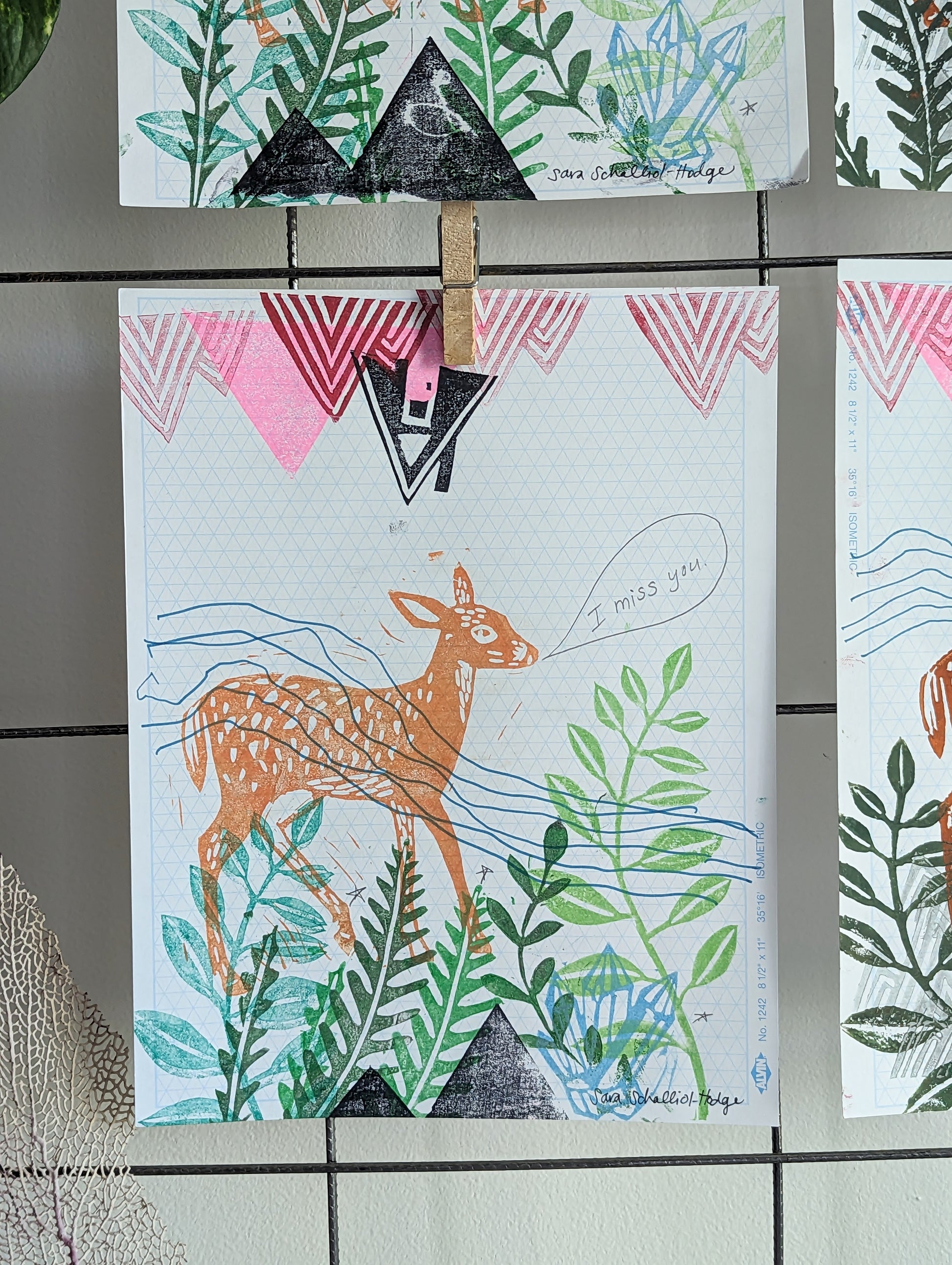 "i miss you dear" handprinted linocut blockprint by Sara Schalliol-Hodge