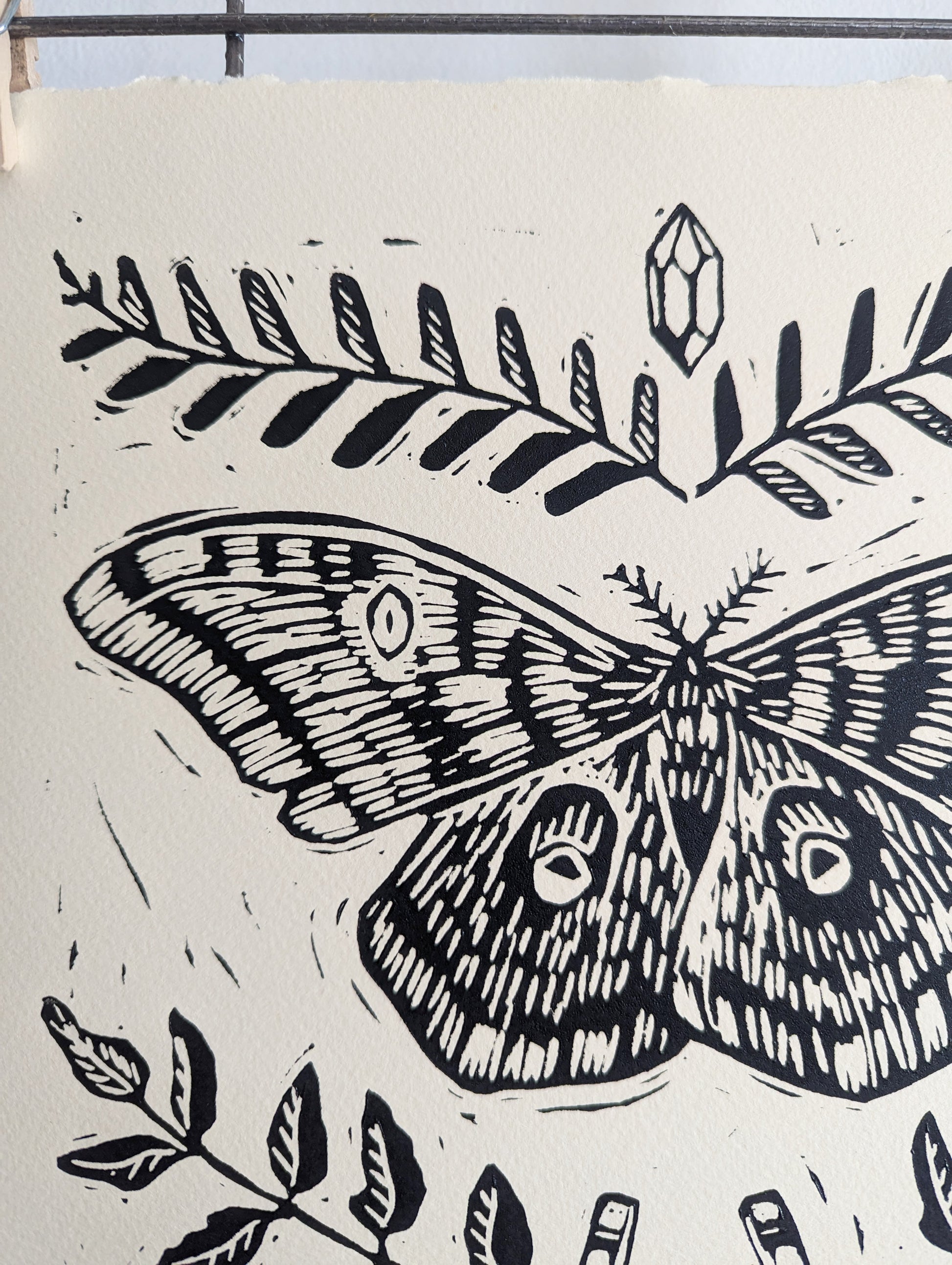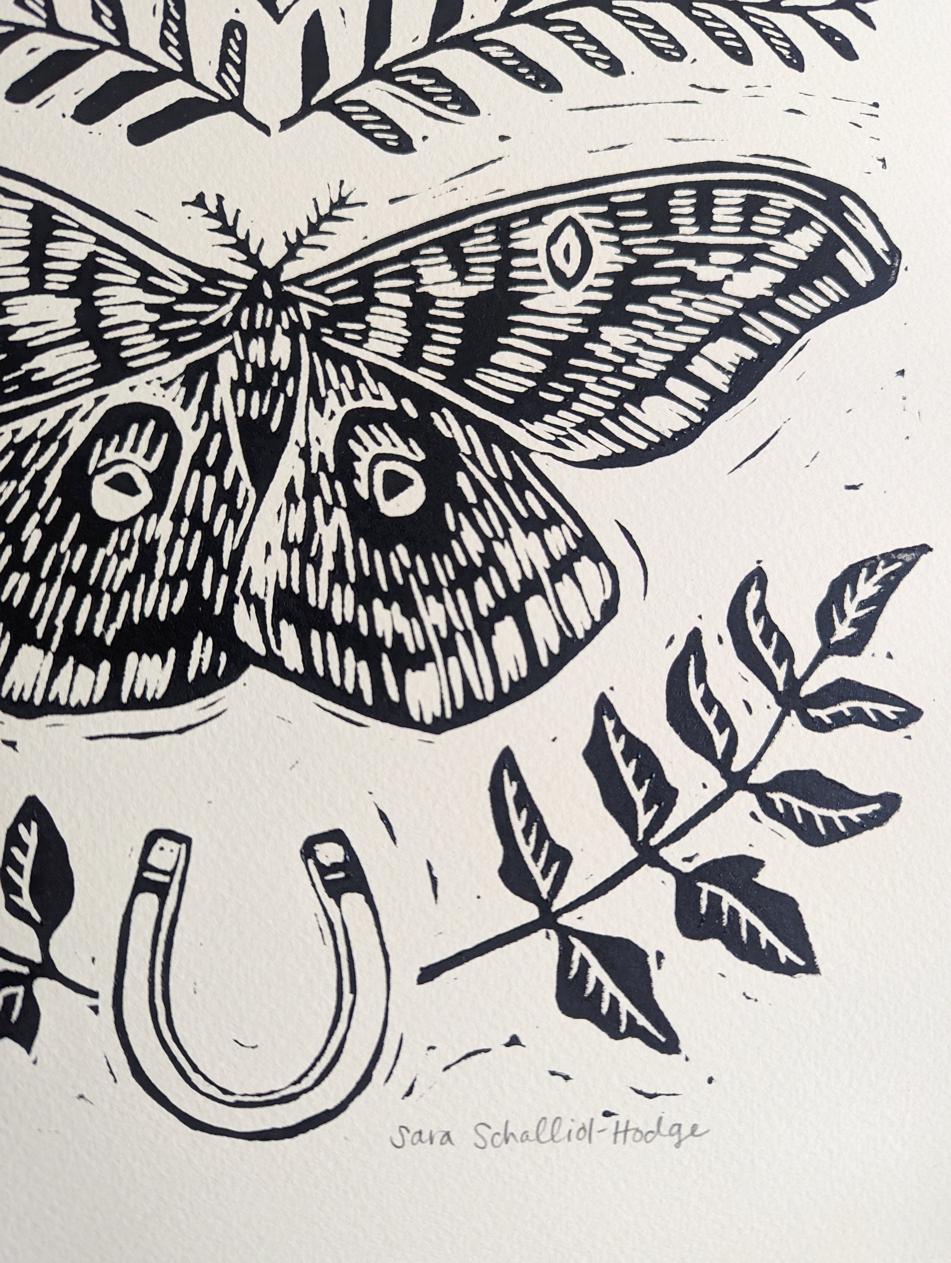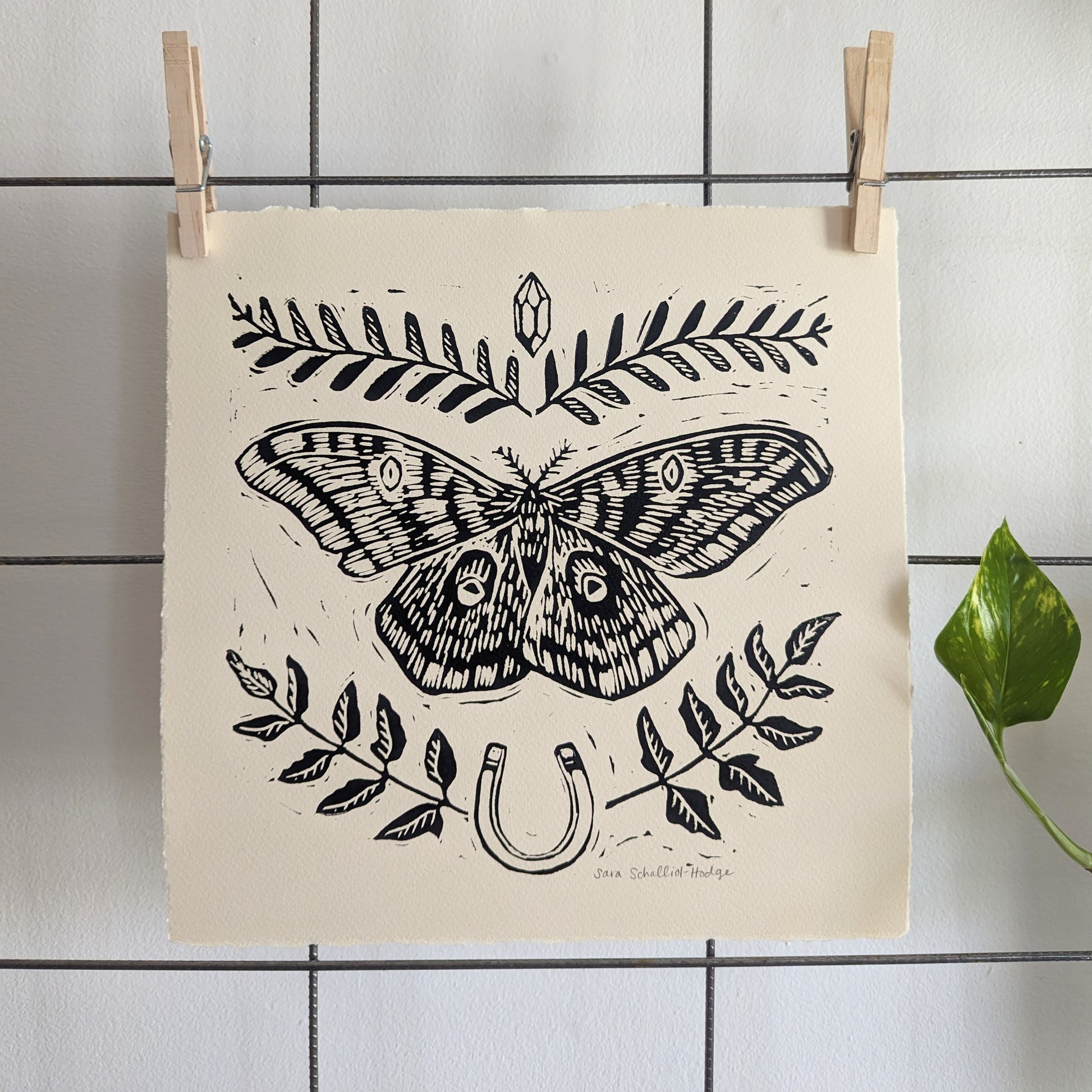 "luck moth" handprinted linocut blockprint on by Sara Schalliol-Hodge