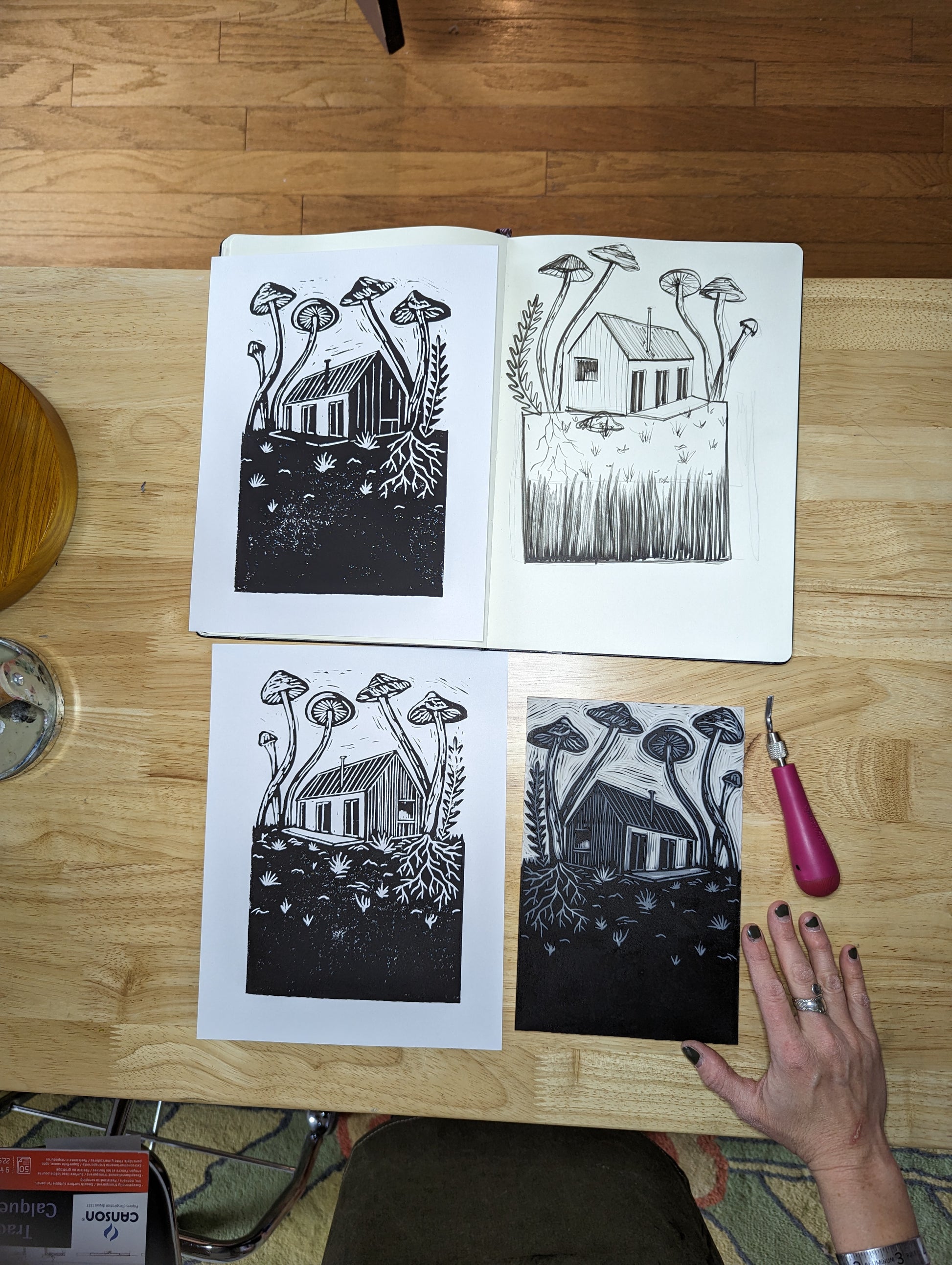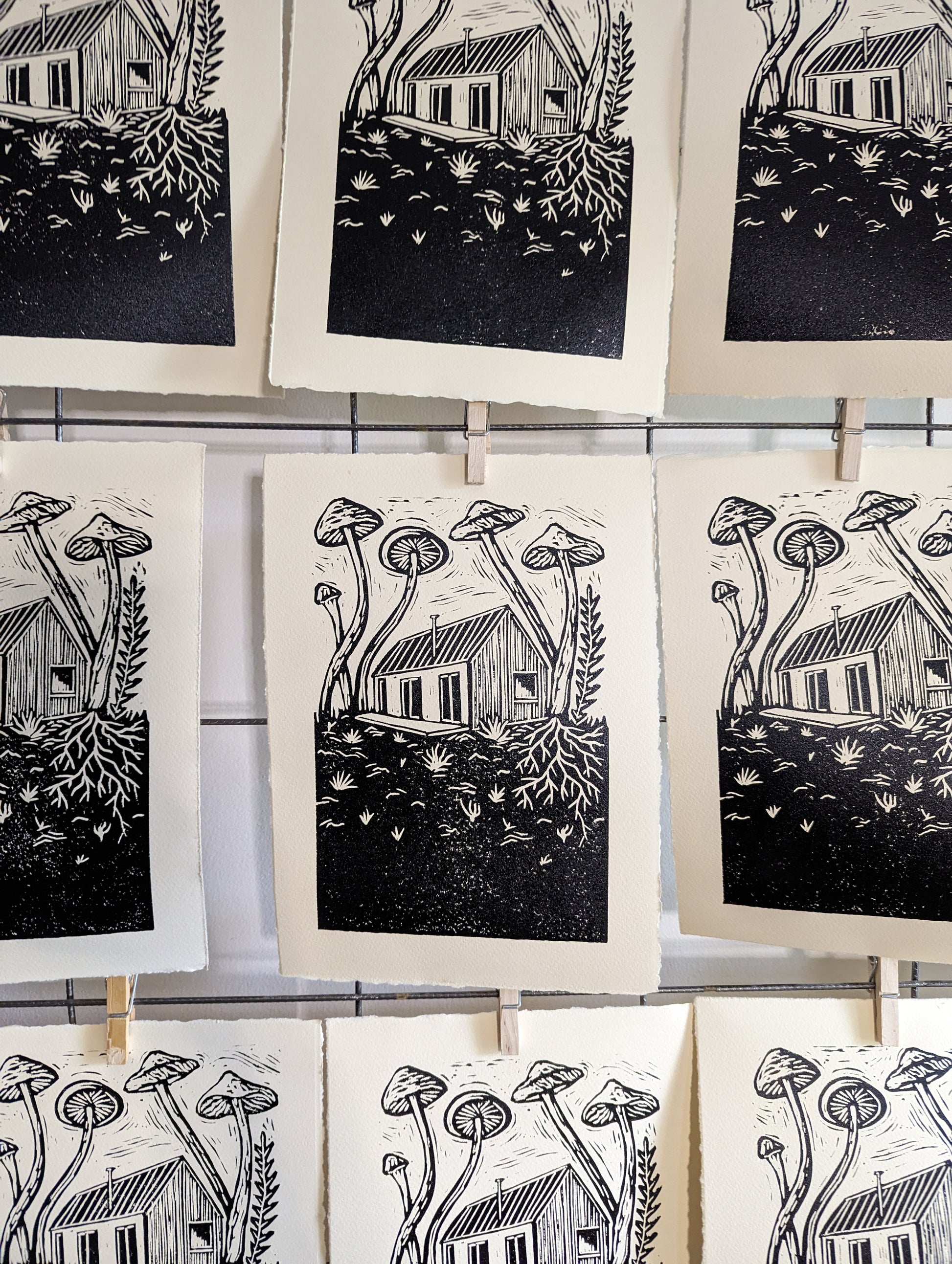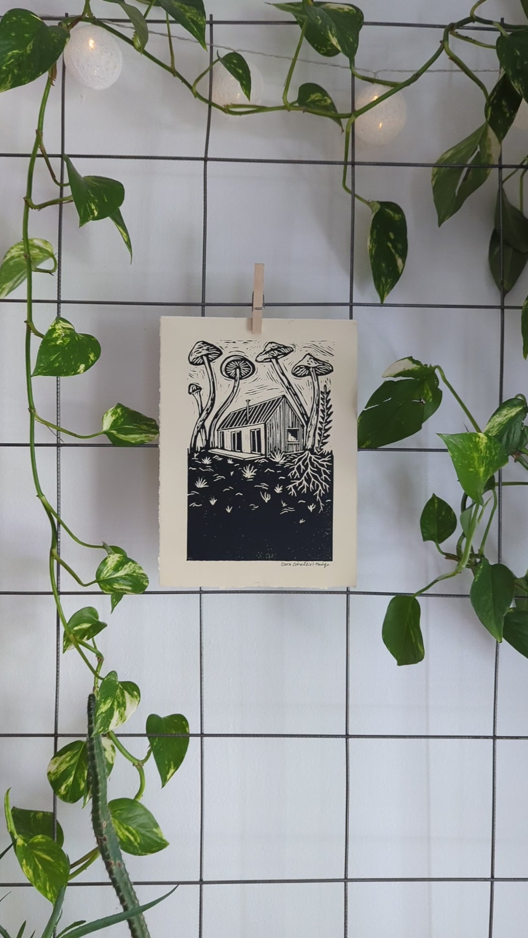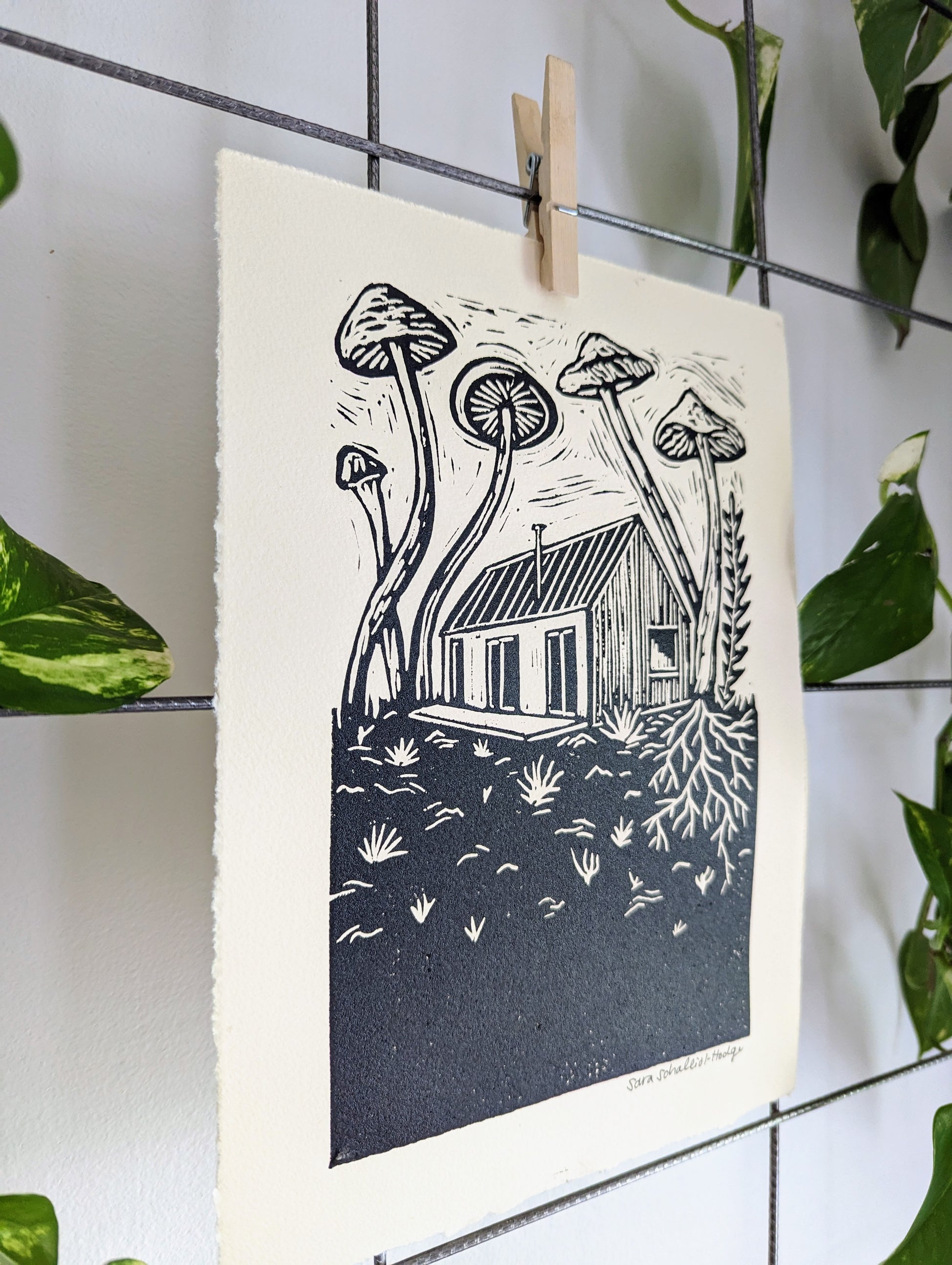 "mushroom cabin" handprinted linocut blockprint on by Sara Schalliol-Hodge