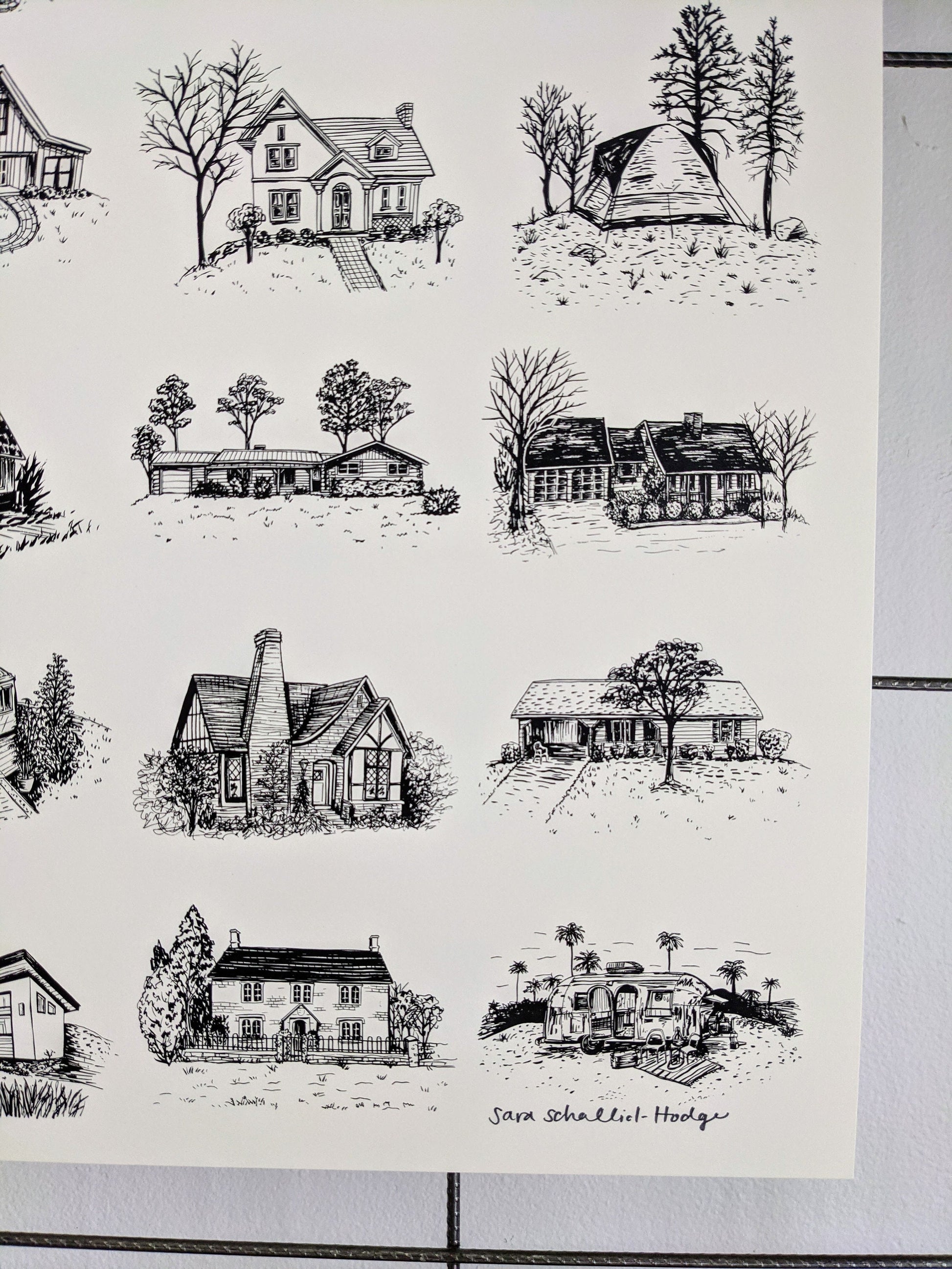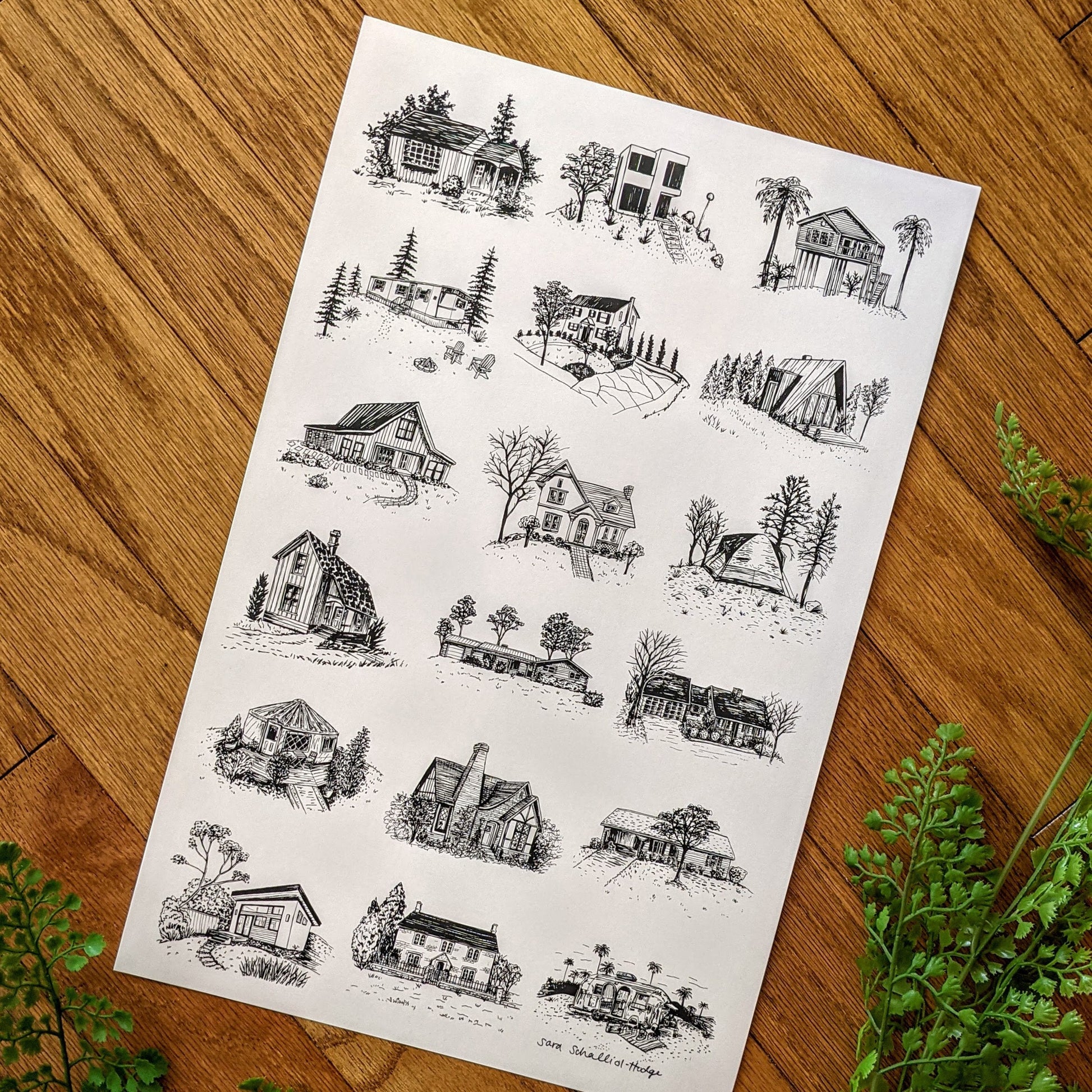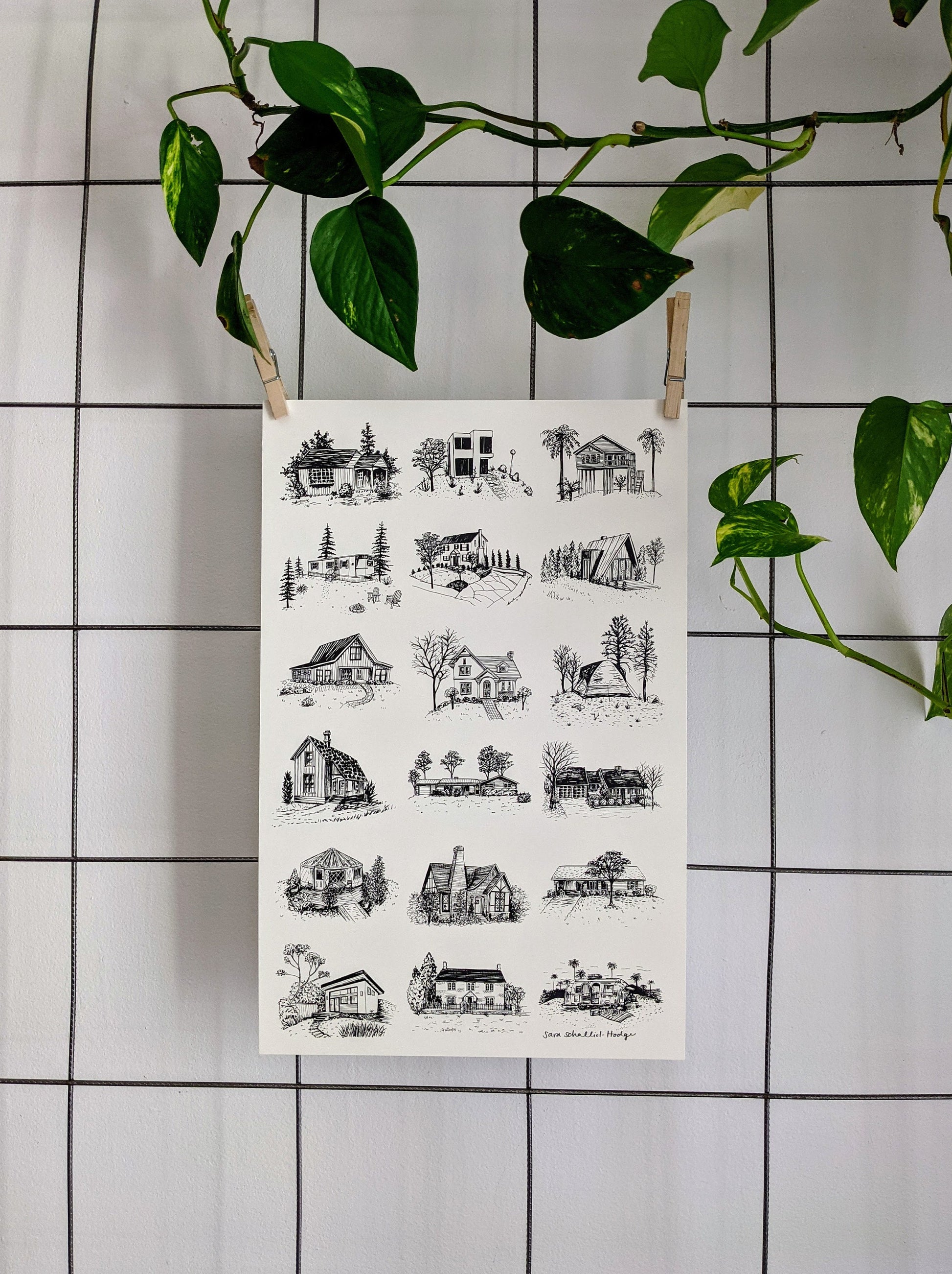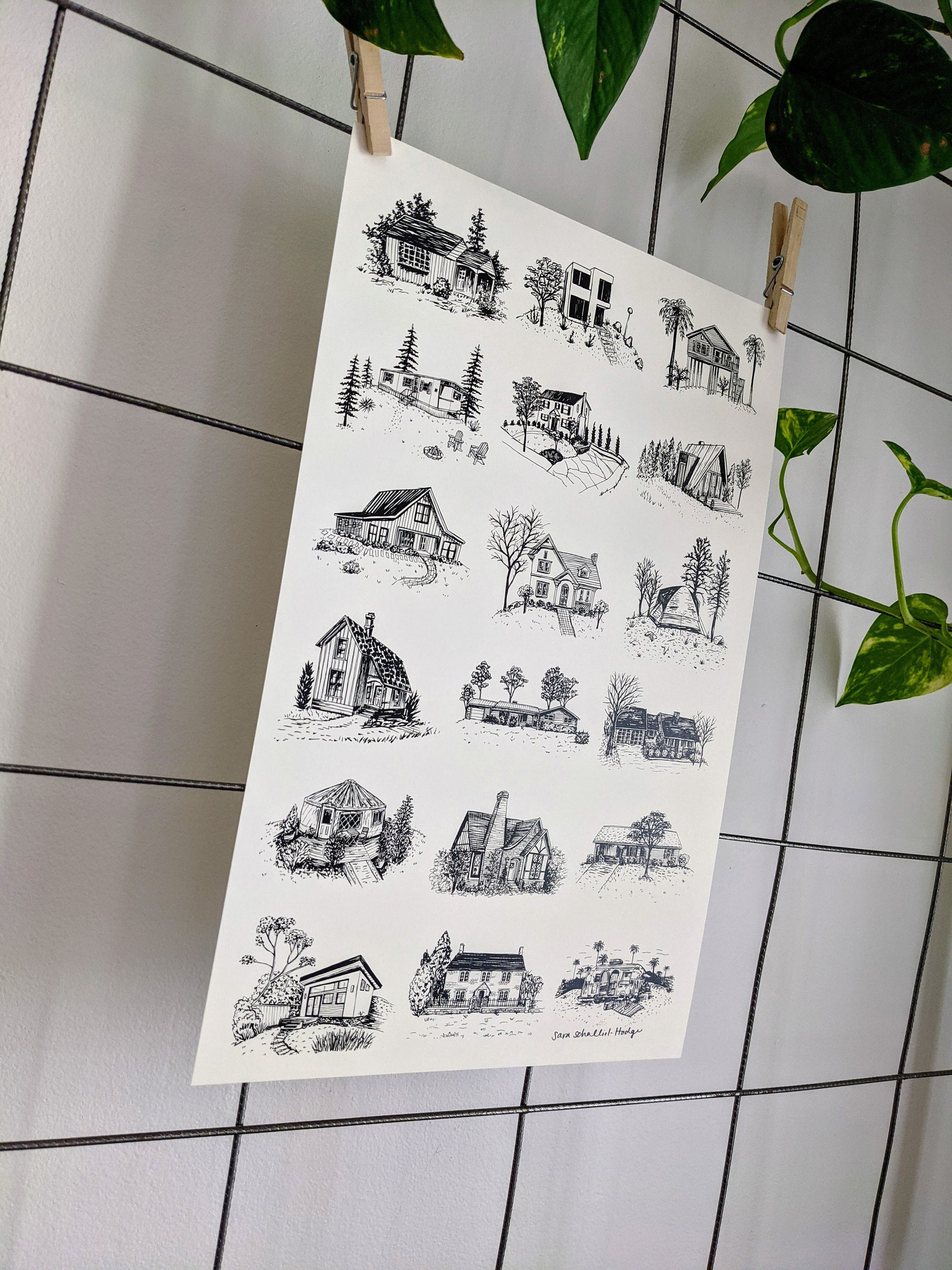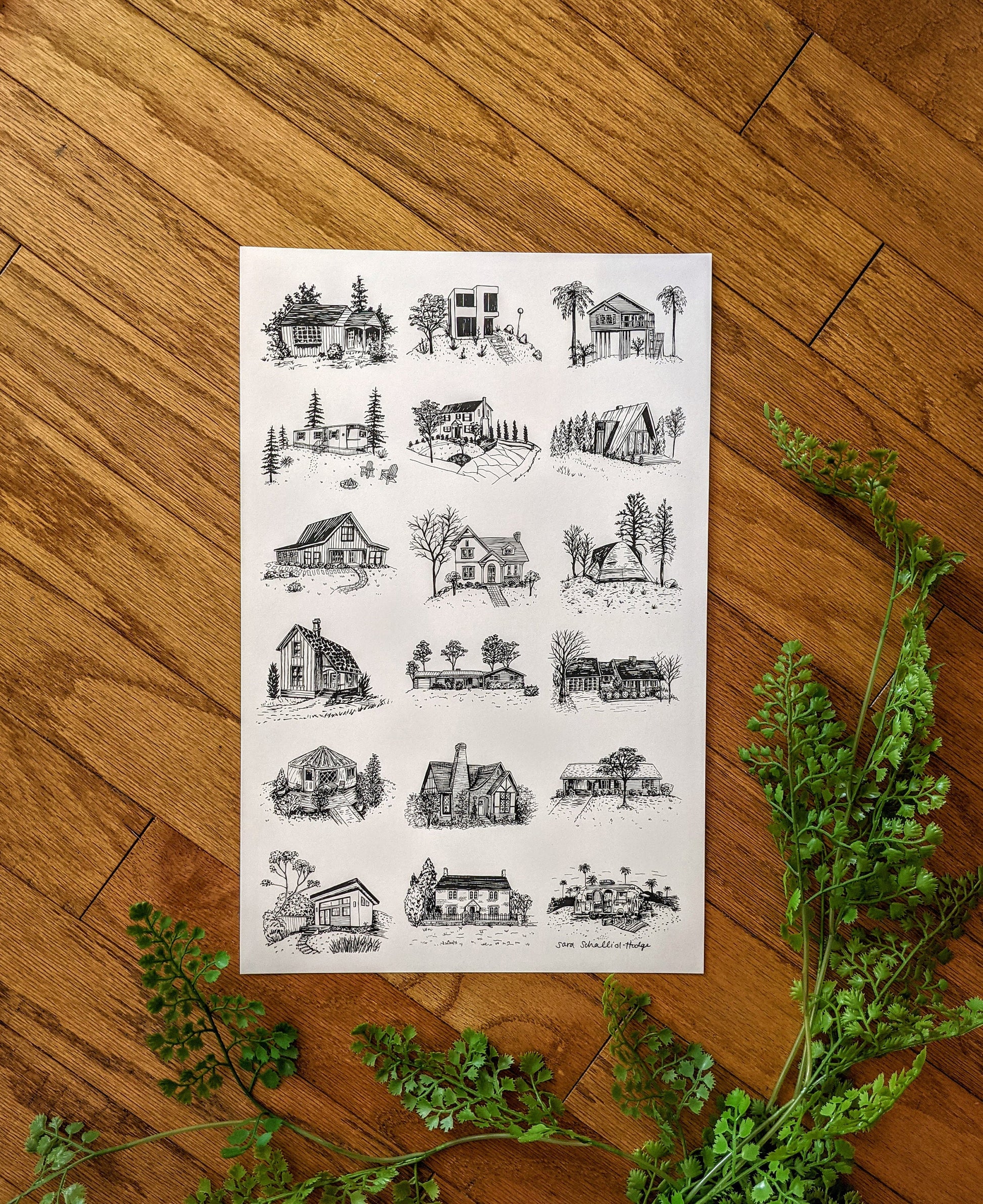 Bring a bit of architectural interest to your wall with this archival print by ilikesara (aka Sara Schalliol-Hodge). Made from pen and ink illustrations, this print includes a house that almost everyone might find nostalgic.