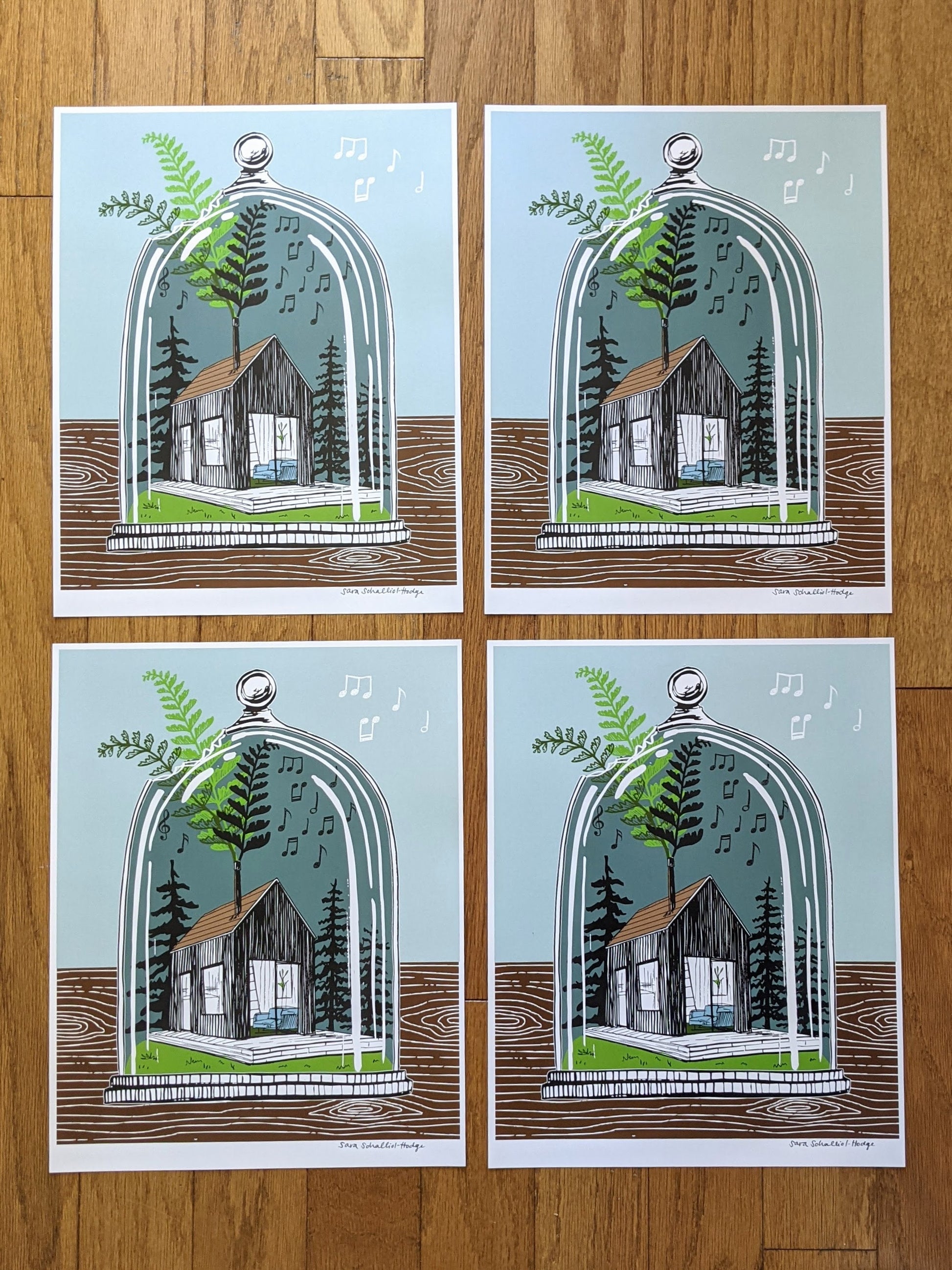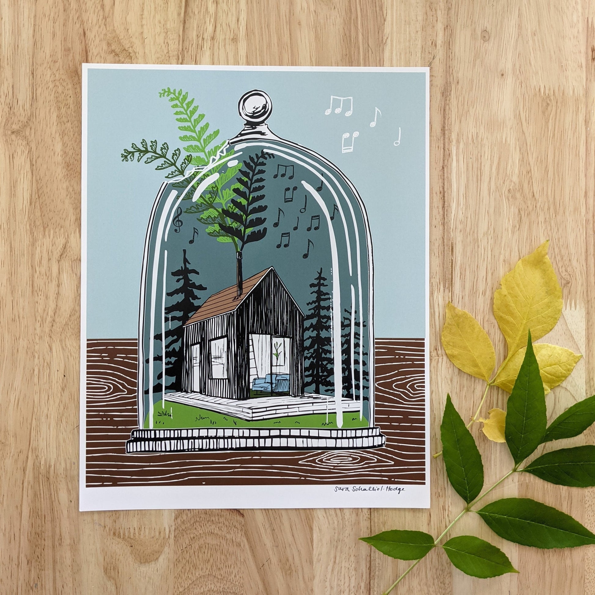 "bell jar home" Part of ilikesara's vessel series, this archival print features a fern-sprouting cabin breaking open a bell jar.