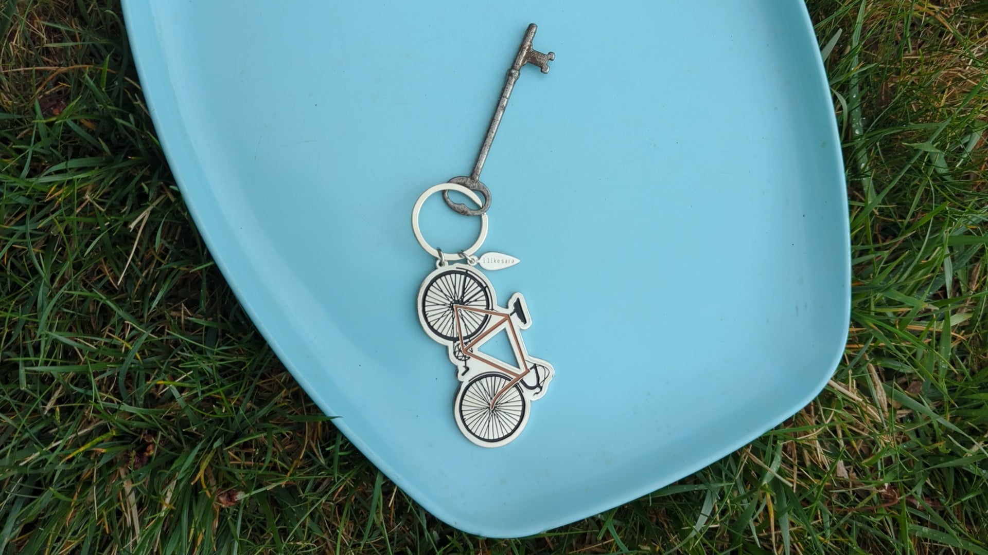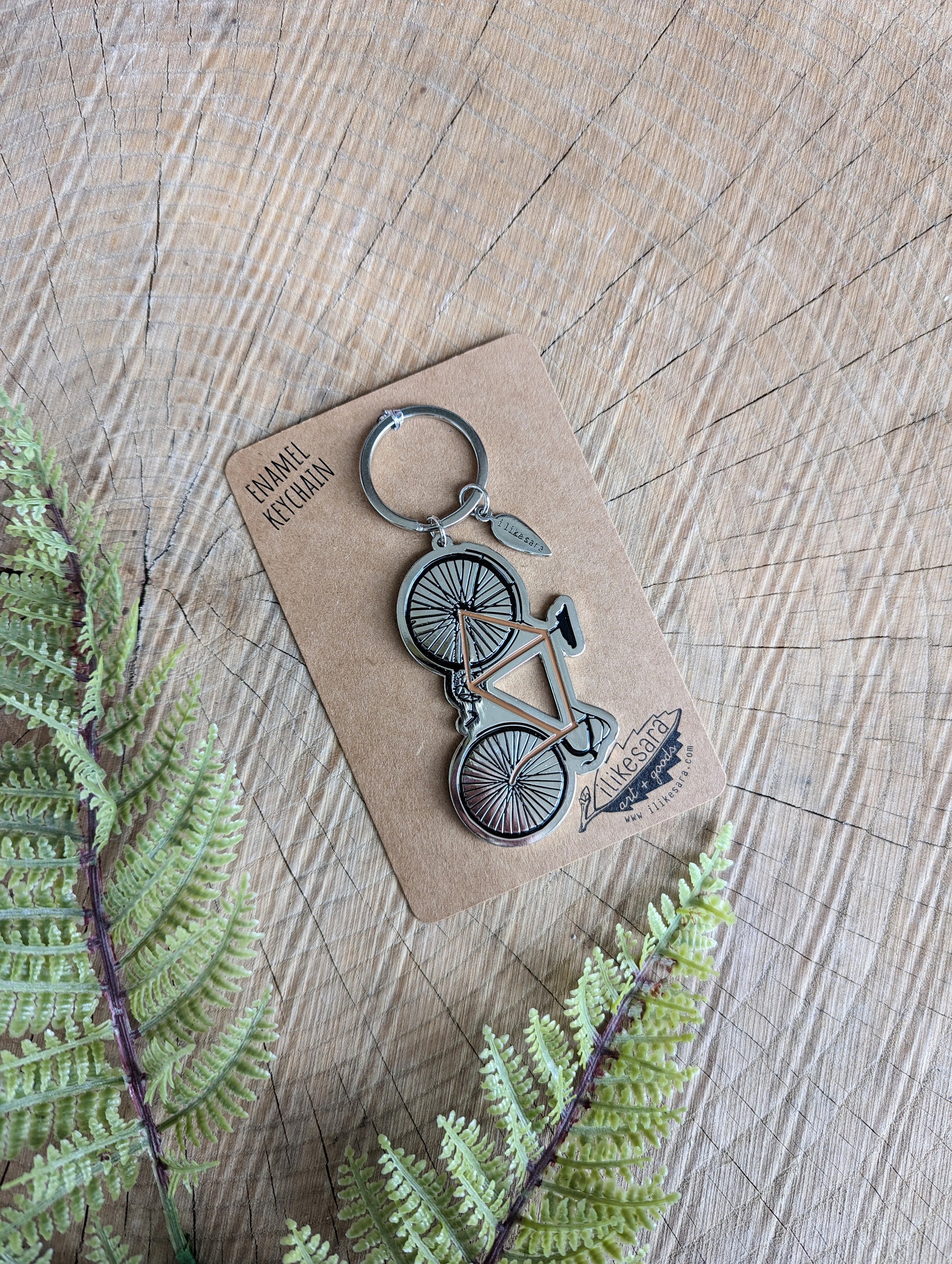 Bring some bicycle adventure vibes everywhere you go with this bike keychain. This silver metal enamel keychain is durable and functional with a split ring for attaching to your keys and a little "ilikesara" leaf charm. Based on an illustration by ilikesara / Sara Schalliol-Hodge.