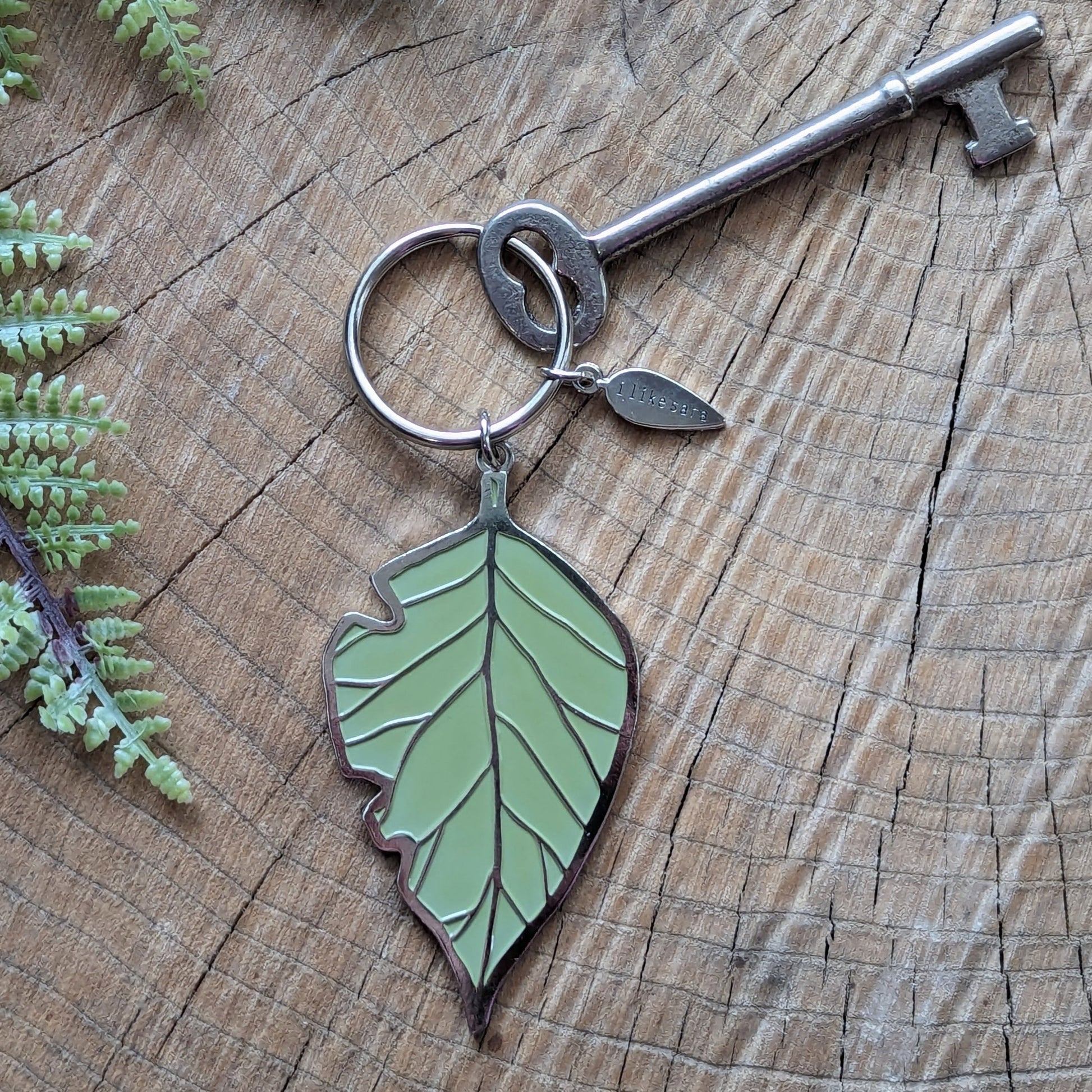 A green leaf to bring a bit of the forest with you along with your keys. This silver metal enamel keychain is durable and functional with a split ring for attaching to your keys and a little "ilikesara" leaf charm. Based on an illustration by ilikesara / Sara Schalliol-Hodge and inspired spring's fresh green leaves.