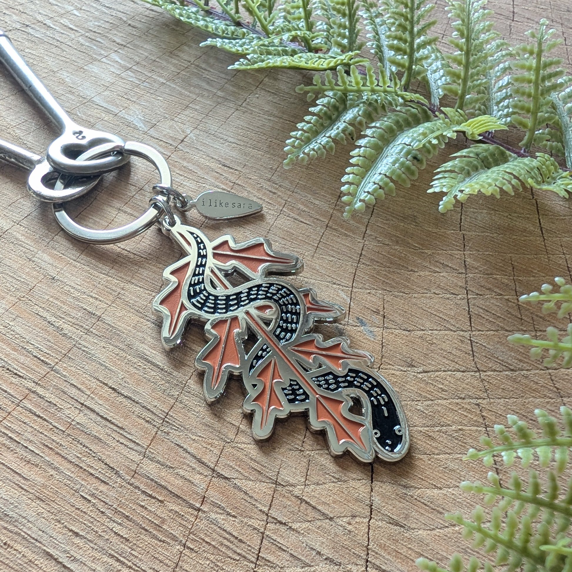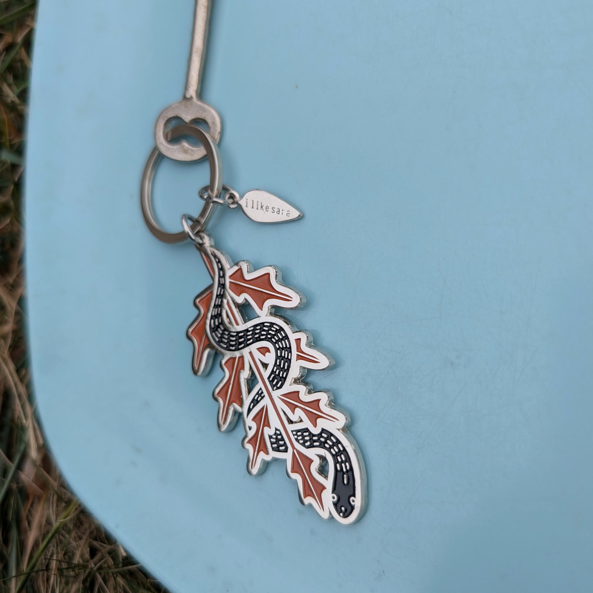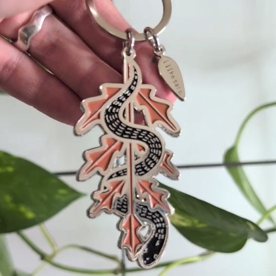 A forest guardian for your keys. This enamel keychain features a sleek black serpent winding through rust-colored fern fronds. It’s equal parts woodland charm and protective talisman—perfect for everyday wandering (or simply keeping track of your keys).