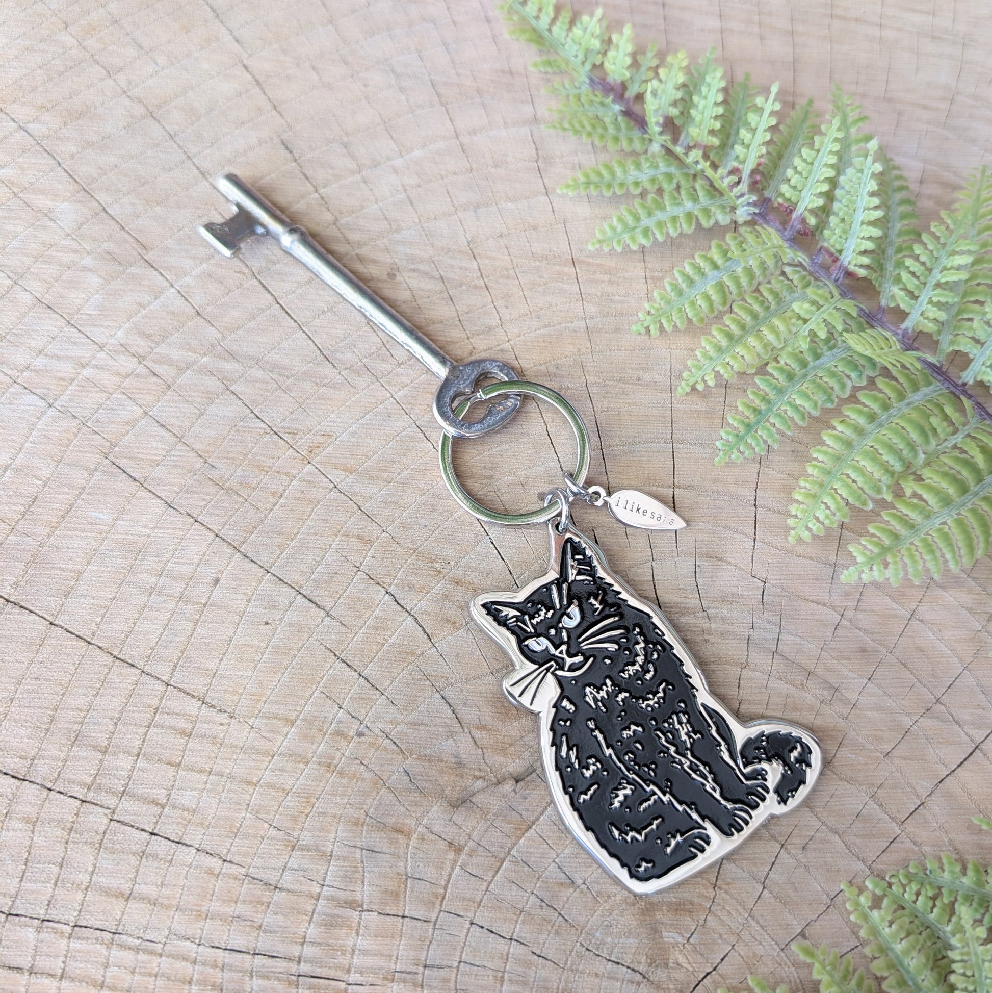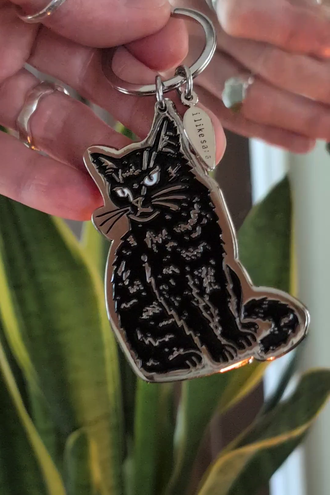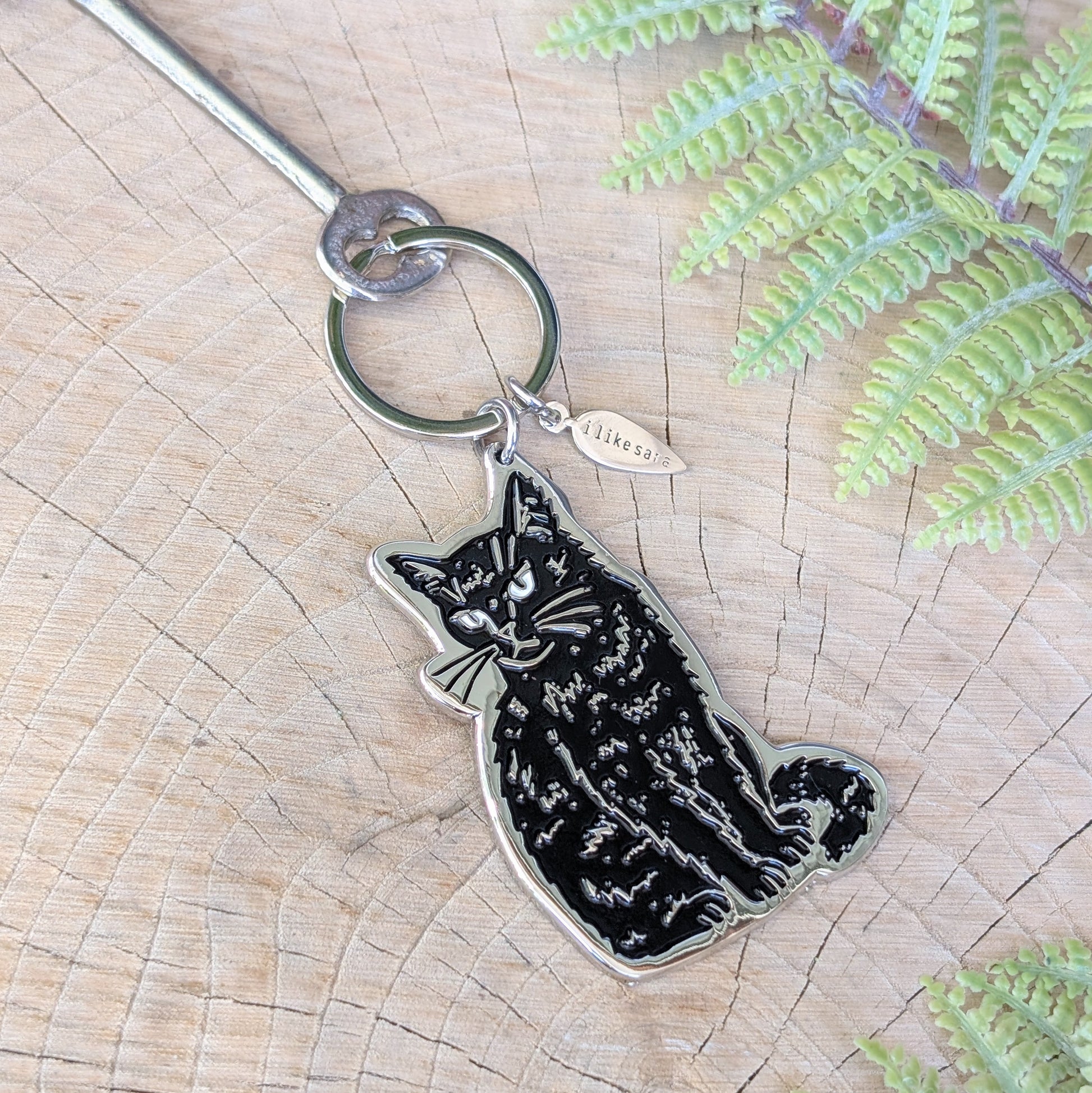 A slightly disappointed black cat brought to life in polished metal and enamel. Carry a little bit of mystery and cat charm along with your keys. This silver metal enamel keychain is durable and functional with a split ring for attaching to your keys and an engraved "ilikesara" leaf charm. Based on an illustration by ilikesara / Sara Schalliol-Hodge and inspired by her love of kitties.