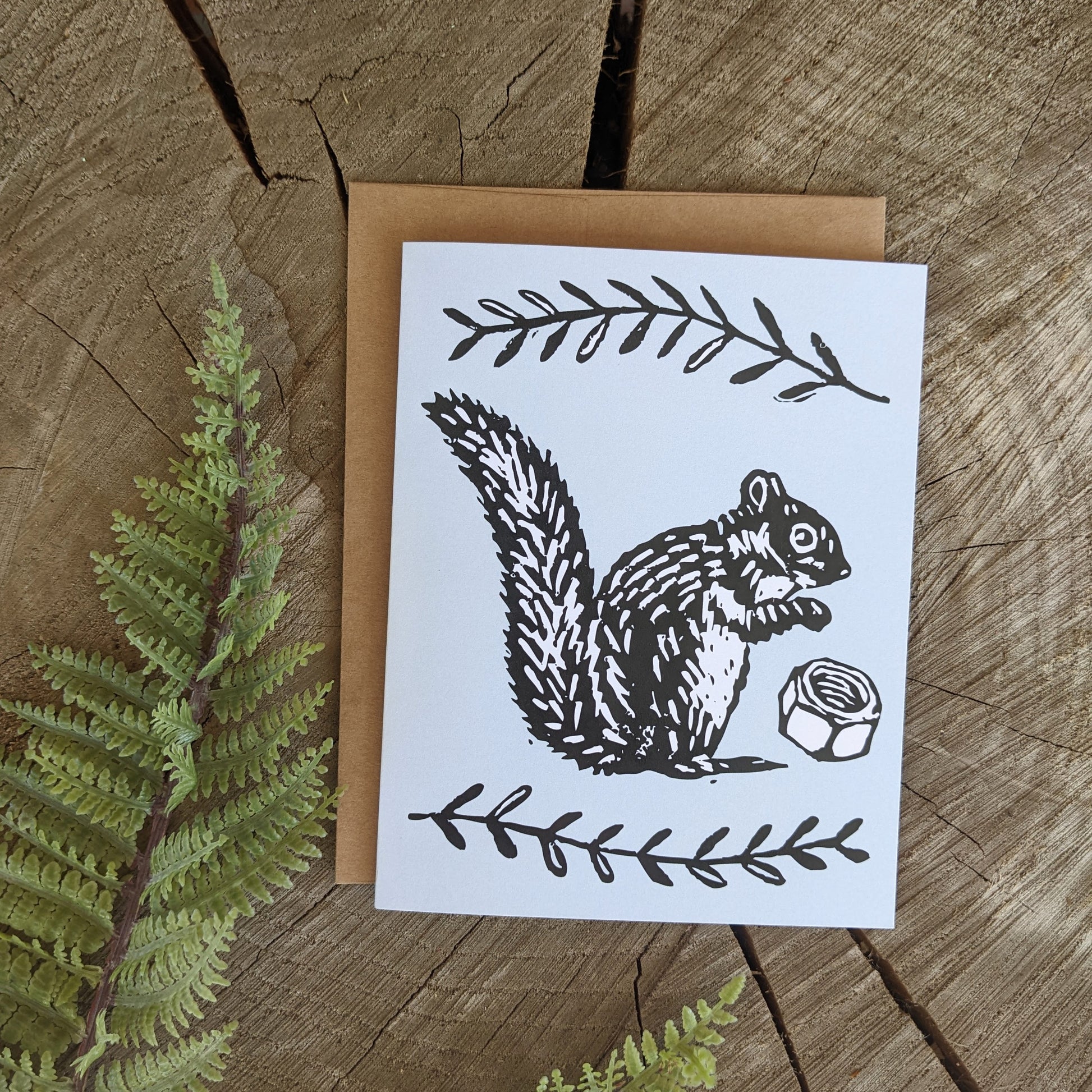 A friendly squirrel and his chum, the nut, surrounded by a fern sprig pattern on the lightest blue background.