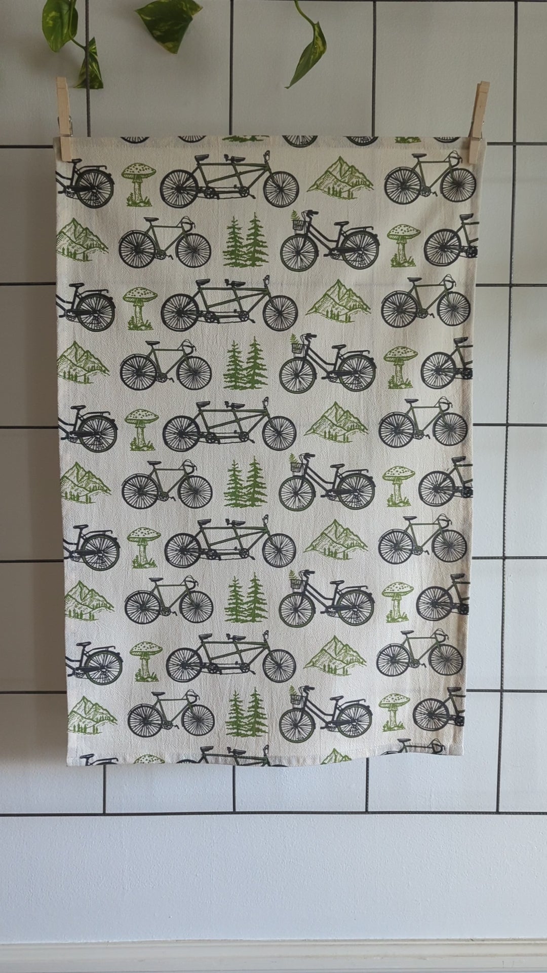Bring some bicycle adventure vibes to your kitchen or bathroom with this hand-screenprinted flour sack cotton towel. Featuring illustrations by ilikesara / Sara Schalliol-Hodge, including a vintage bike, a tandem bike, a road bike, mushrooms, mountains, and trees.