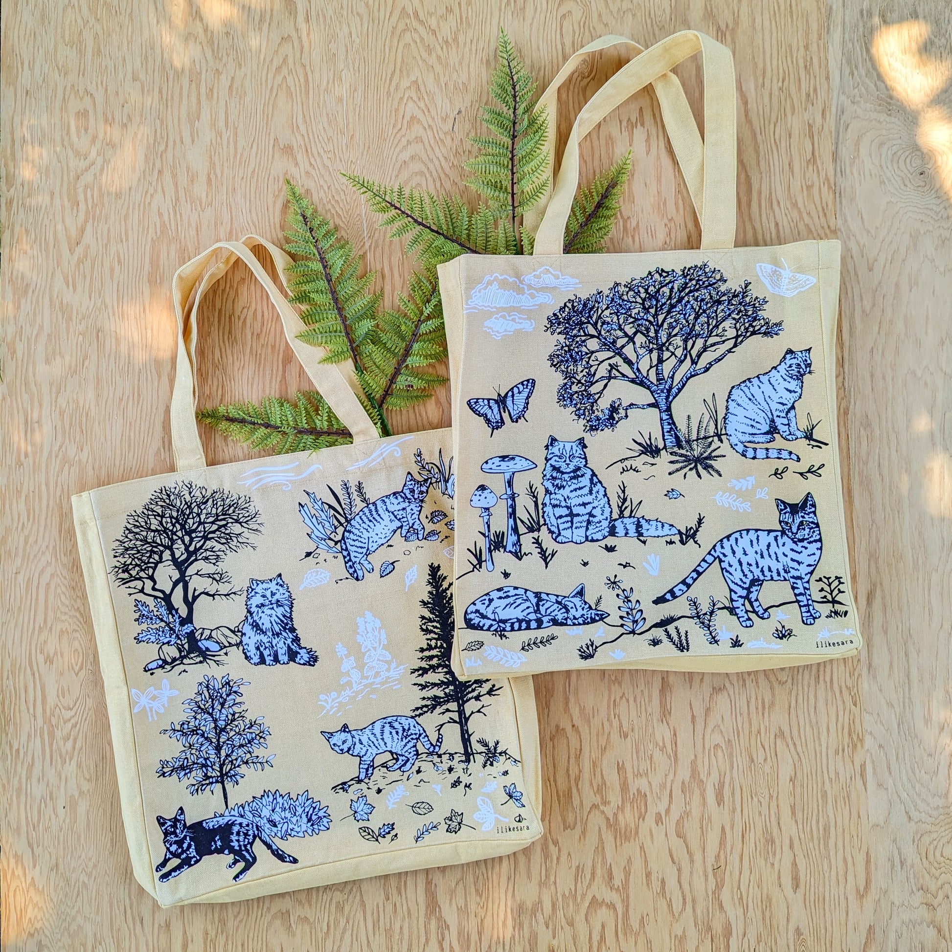 Take some feline friends everywhere you go (especially outside!) with this canvas cat tote bag. Featuring cats and outdoor scene illustrations by ilikesara (aka Sara Schalliol-Hodge), this tote is generously sized for a variety of adventures, like toting beach towels, a laptop and books, or even groceries. This tote bag is double sided, so you get two different sets of four kitties on each side! "Outside cats" has been screenprinted by hand onto 100% cotton and features reinforced handles.