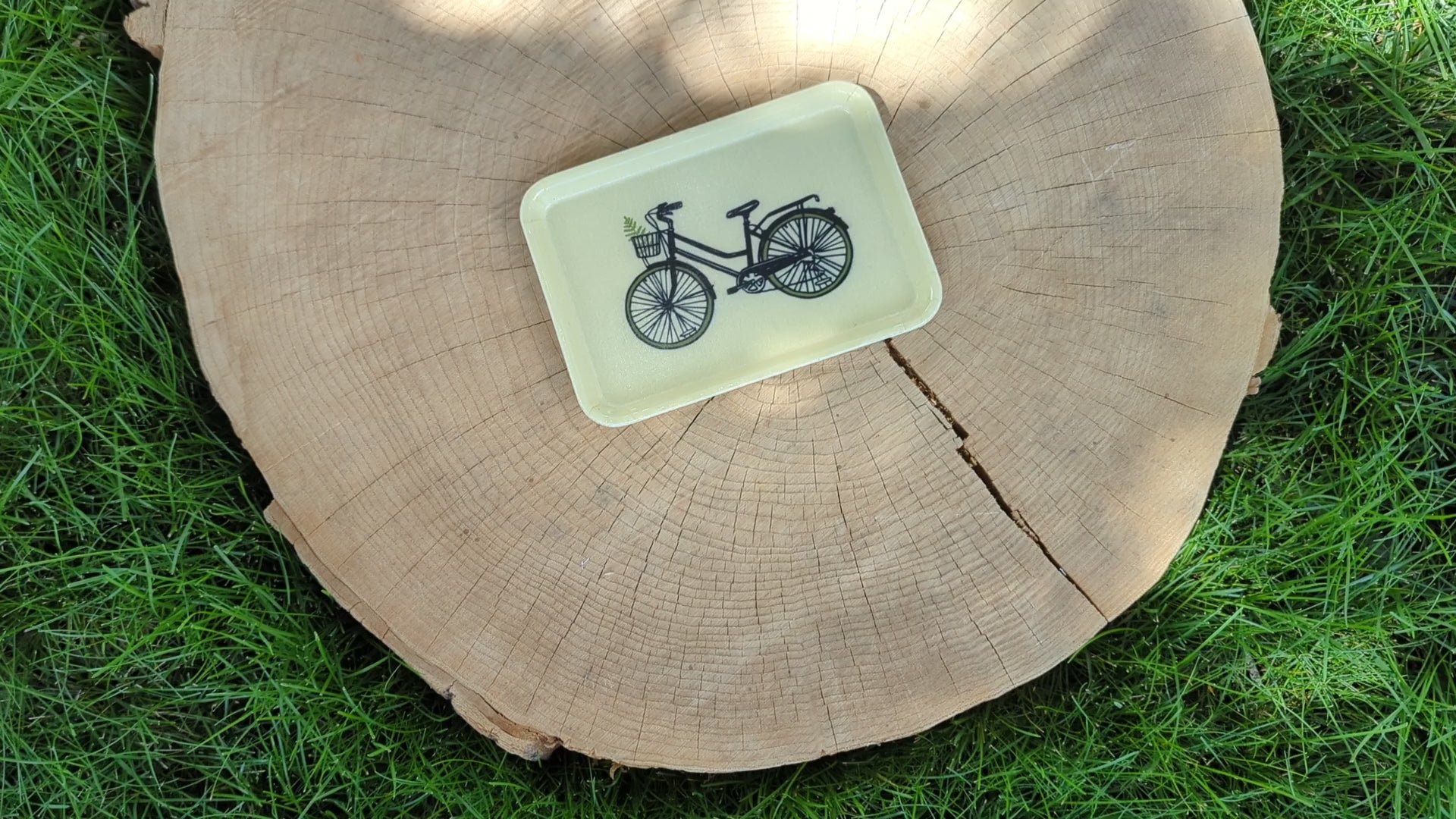 fiberglass tray | bike with fern - cream vintage bicycle 7" x 5" dishwasher safe