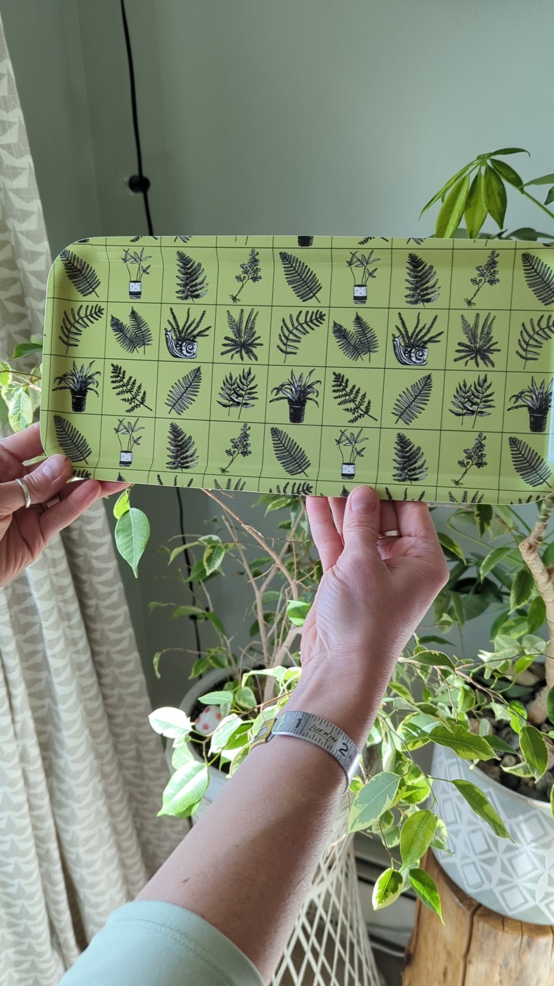 This tray features various fern specimens made from original illustrations by ilikesara / Sara Schalliol-Hodge. Use for displaying your baubles, adding woodland vibes to your appetizer situation, or just for corralling your doodads. Made of FSC certified birch wood, the back of the tray is natural birch and the multiple layers of birch veneer are visible on the edges of the tray.