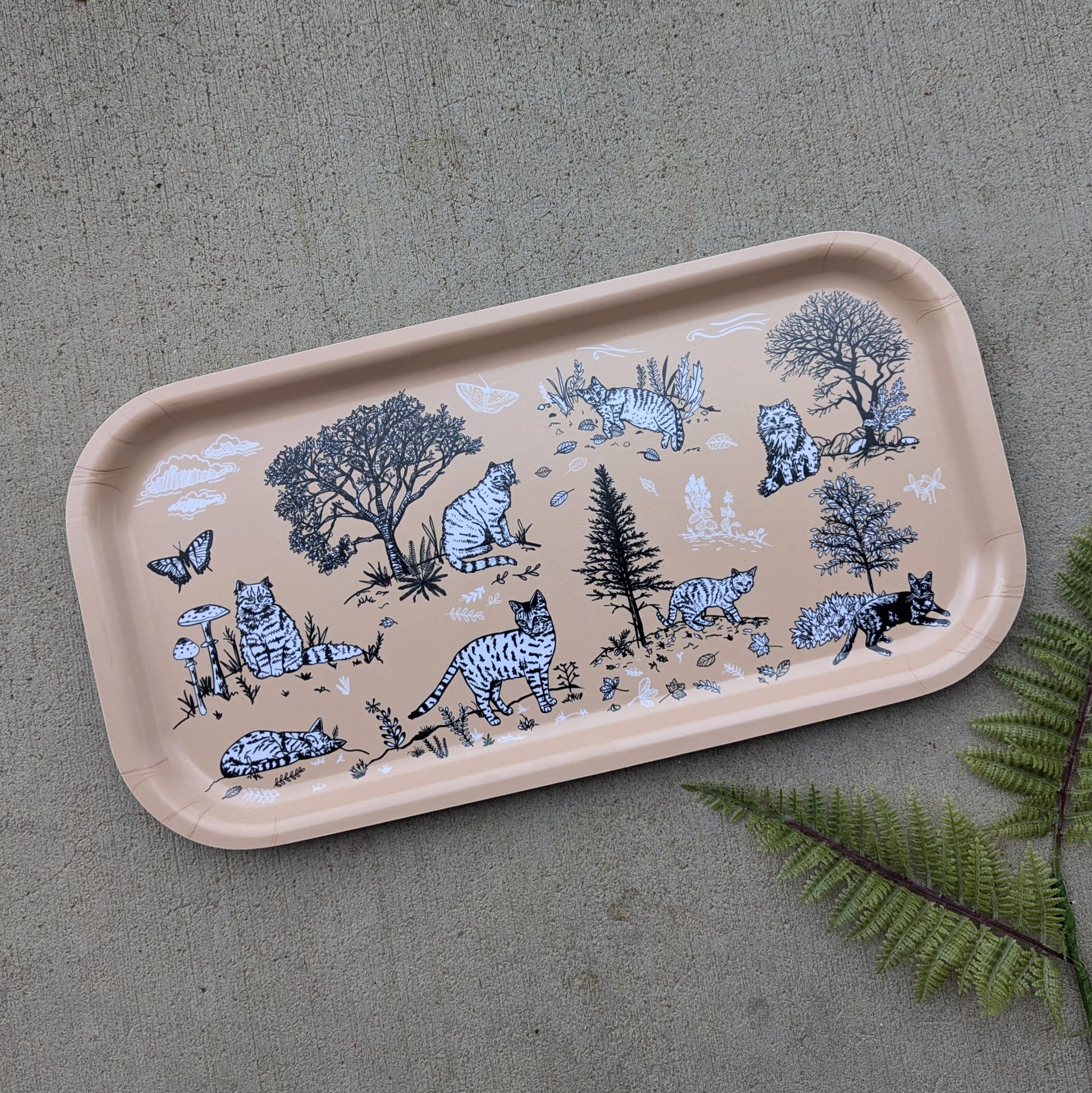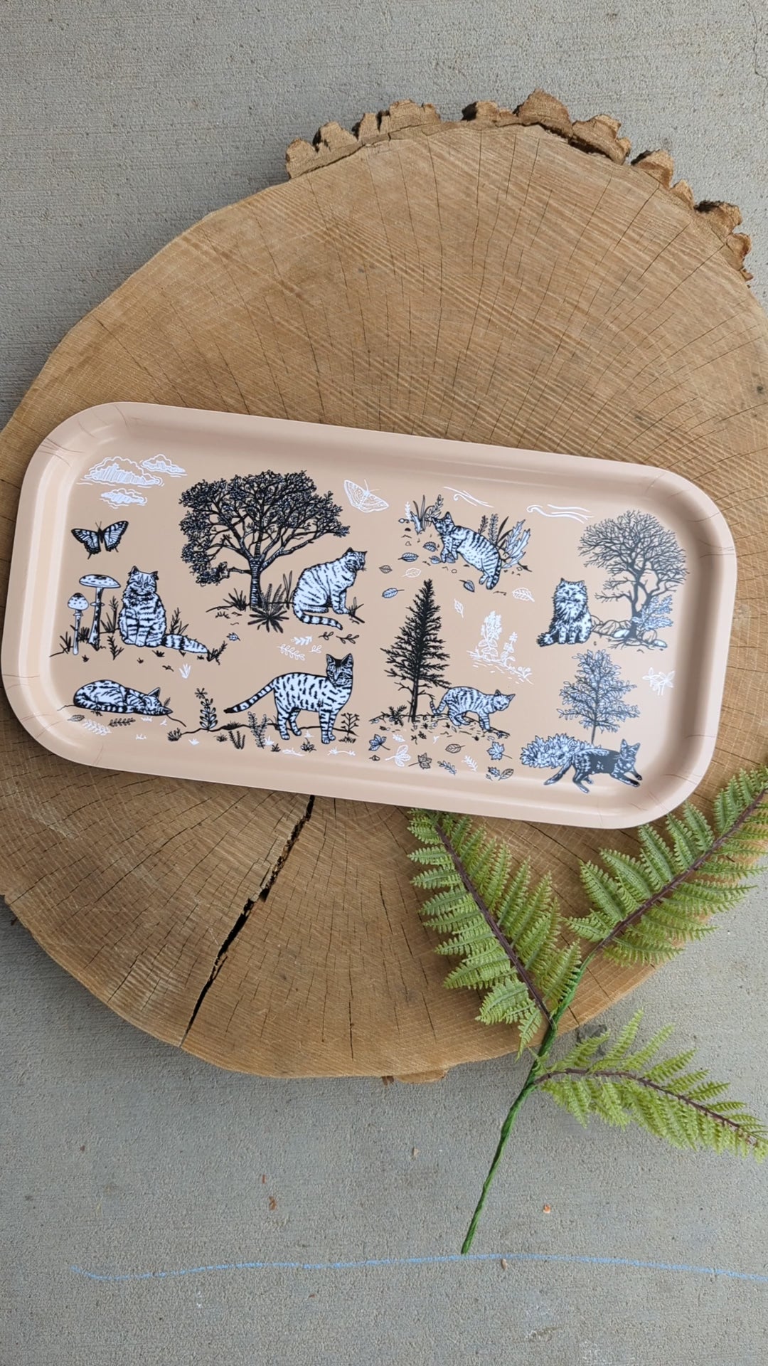This tray features some feline friends enjoying the outdoors with original illustrations by ilikesara / Sara Schalliol-Hodge. Use for displaying your baubles, adding kitty vibes to your table, or just for corralling your doodads. Made of FSC certified birch wood, the back of the tray is natural birch and the multiple layers of birch veneer are visible on the edges of the tray.