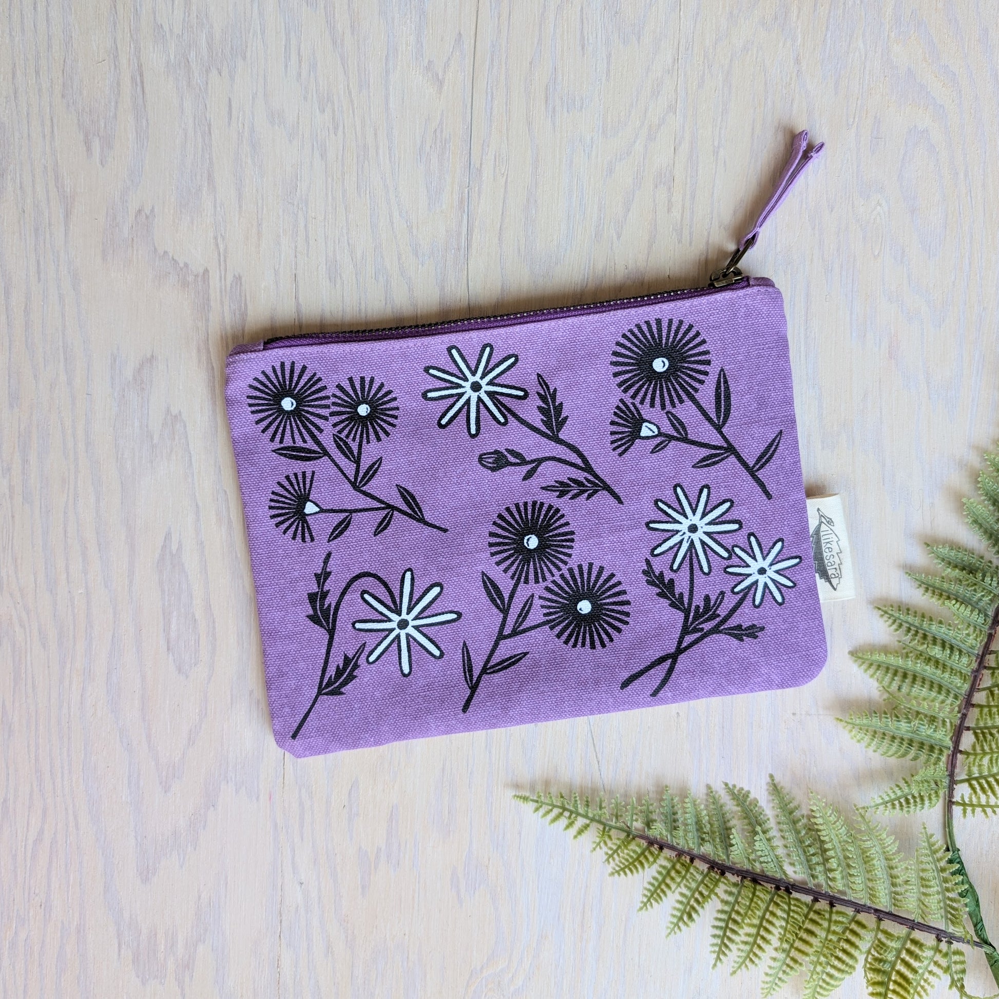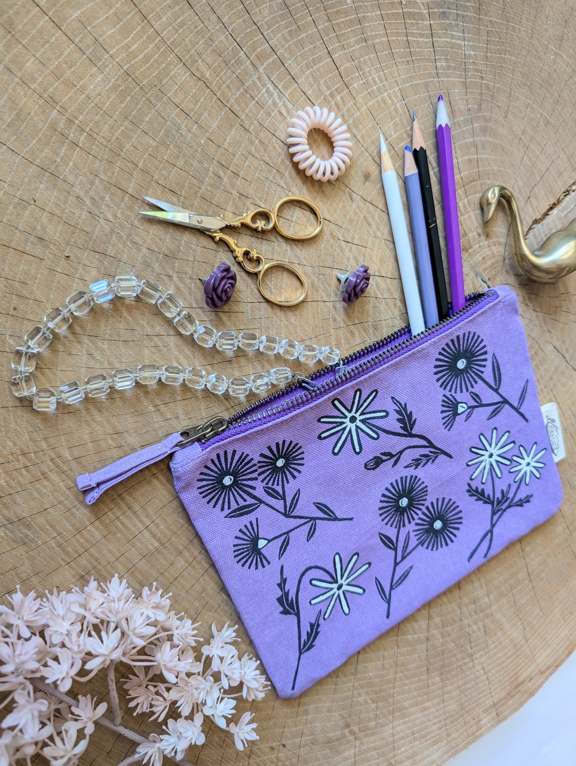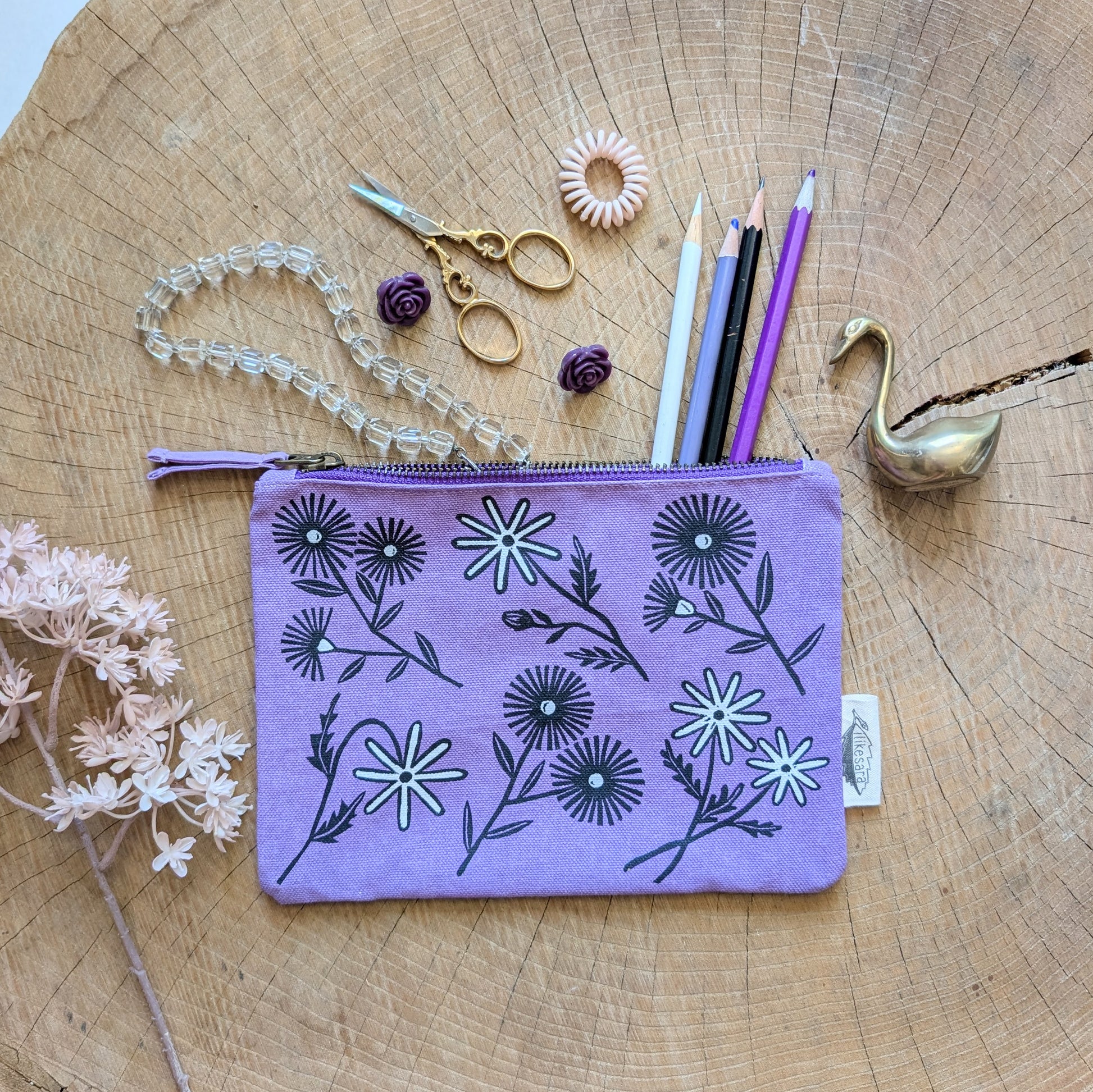 Take some blooms with you everywhere you go with this canvas floral zippered pouch. Featuring aster and daisy blockprints by ilikesara (aka Sara Schalliol-Hodge), this handy zippered pouch will keep you organized. Great for storing pencils and pens, snacks, flower pressing supplies, etc. The water-resistant inner layer is not only wipeable but adds structure to the bag.