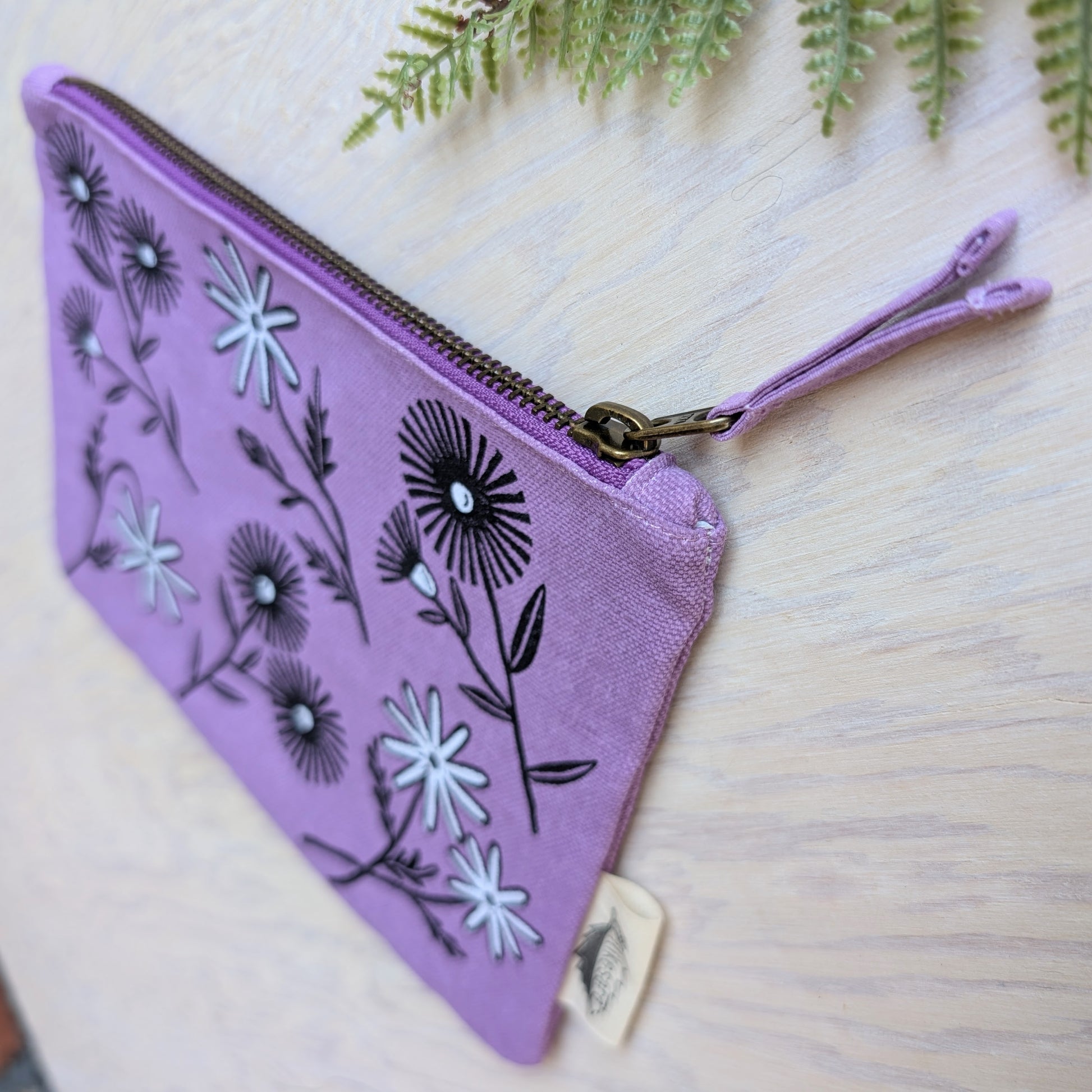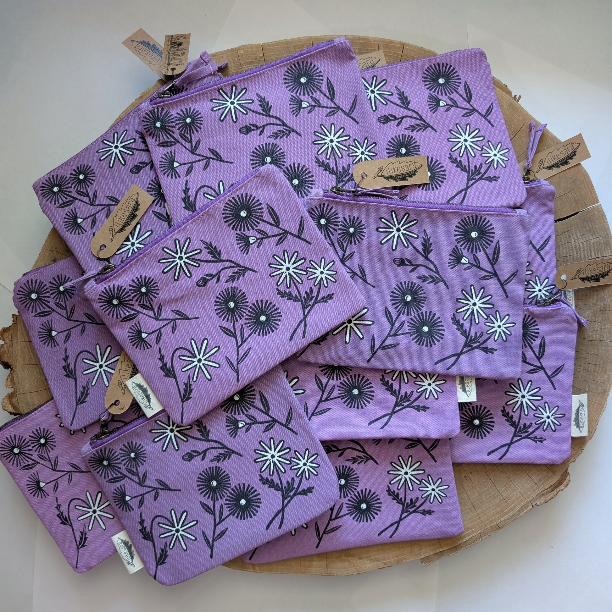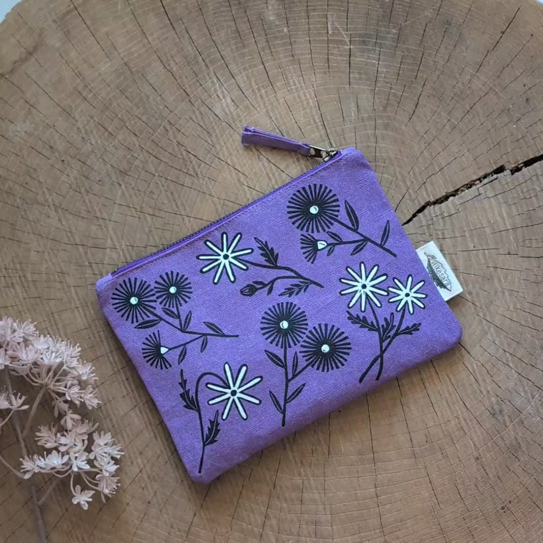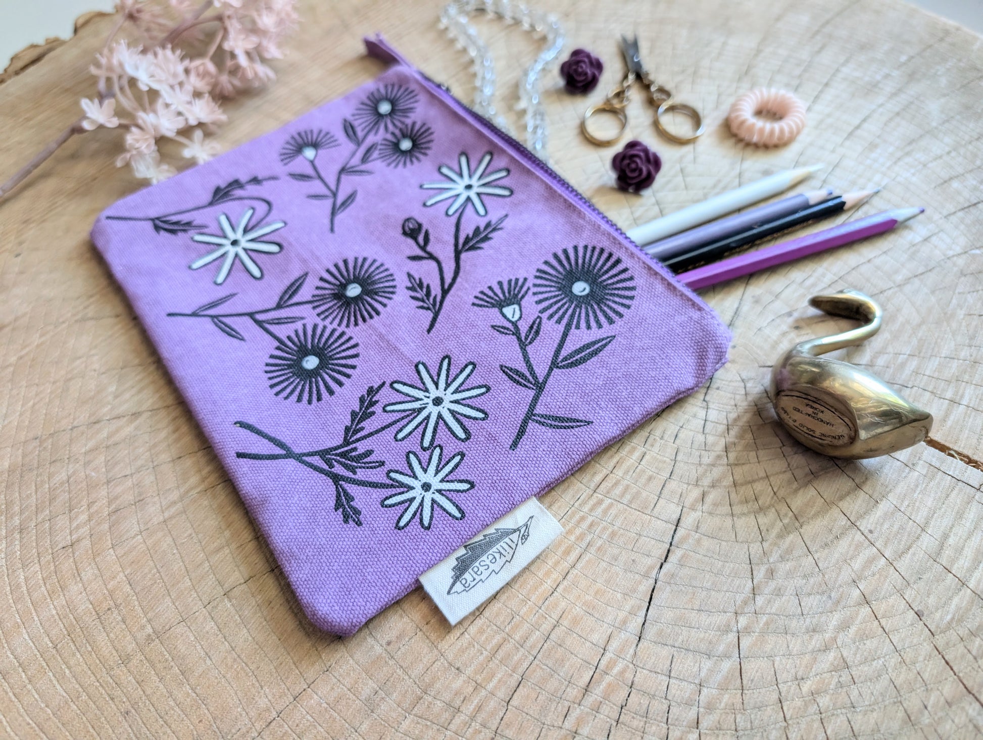 Take some blooms with you everywhere you go with this canvas floral zippered pouch. Featuring aster and daisy blockprints by ilikesara (aka Sara Schalliol-Hodge), this handy zippered pouch will keep you organized. Great for storing pencils and pens, snacks, flower pressing supplies, etc. The water-resistant inner layer is not only wipeable but adds structure to the bag.