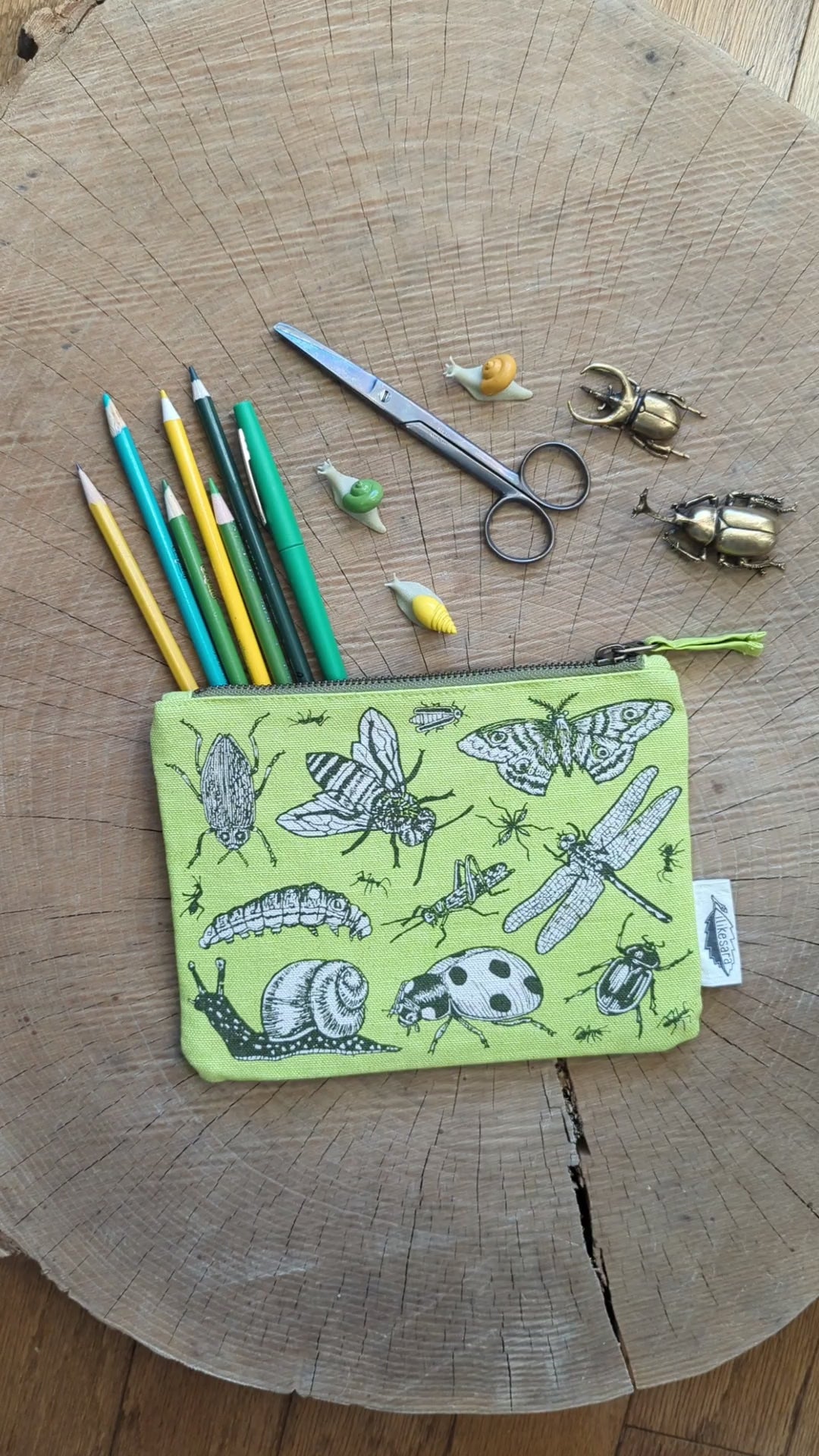 zippered pouch | insecta - light green pencil, supply, makeup bag with waterproof lining