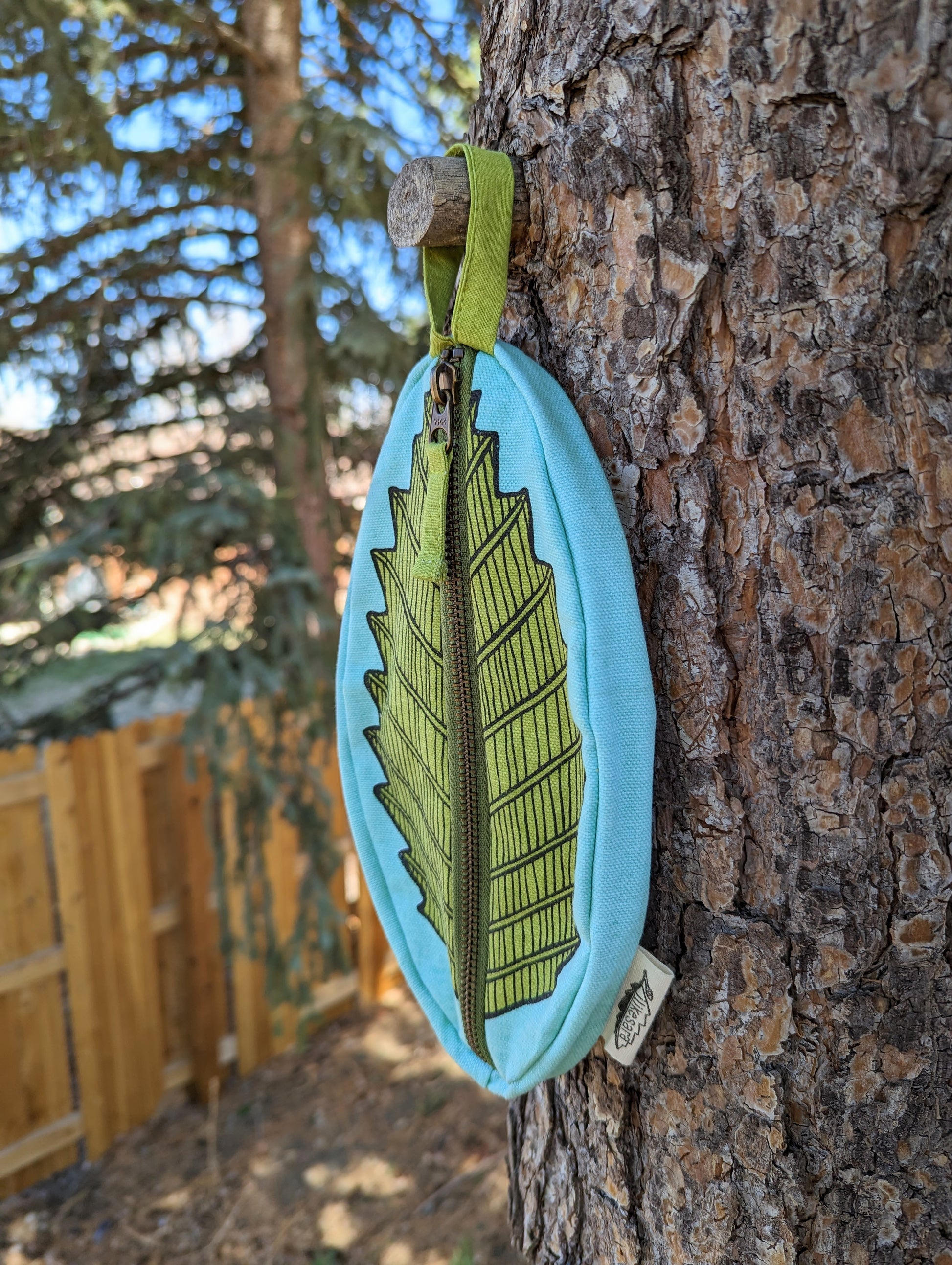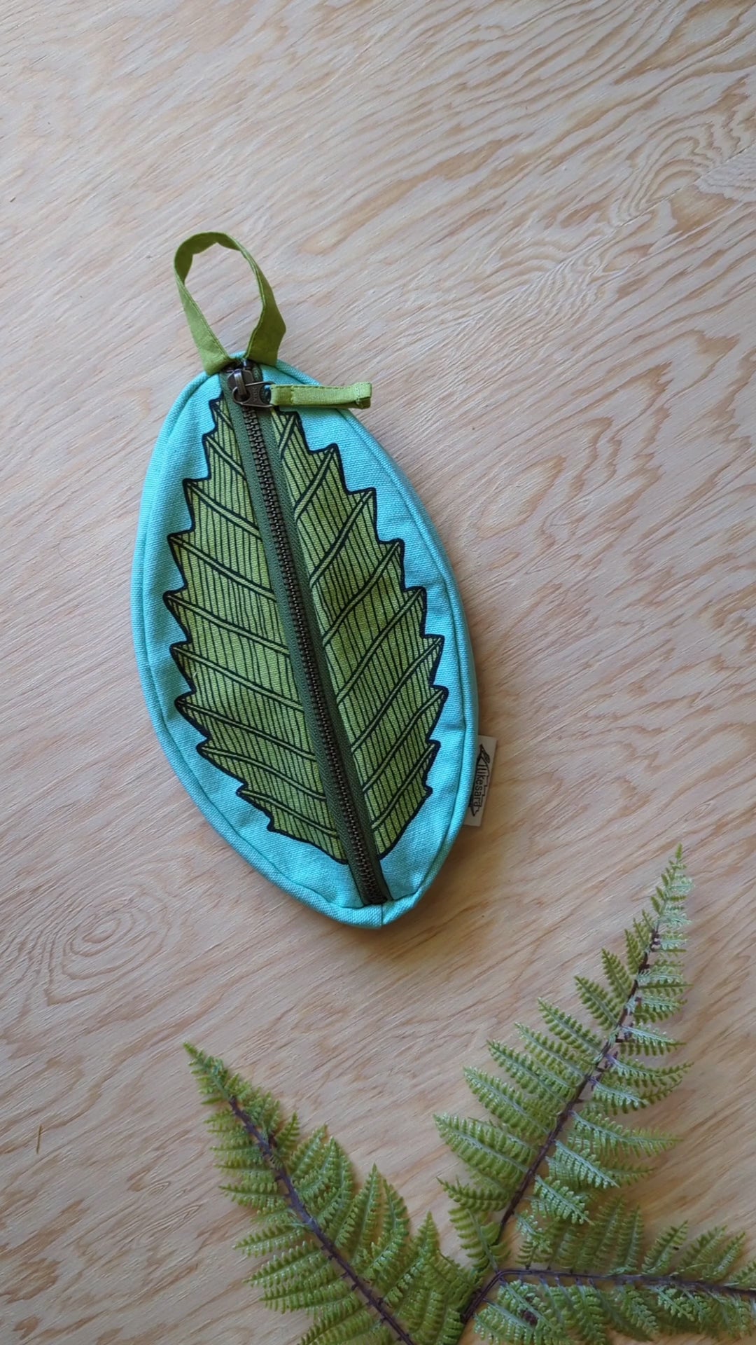 zippered pouch | leaf - green & blue nature pencil, supply, makeup bag with waterproof lining
