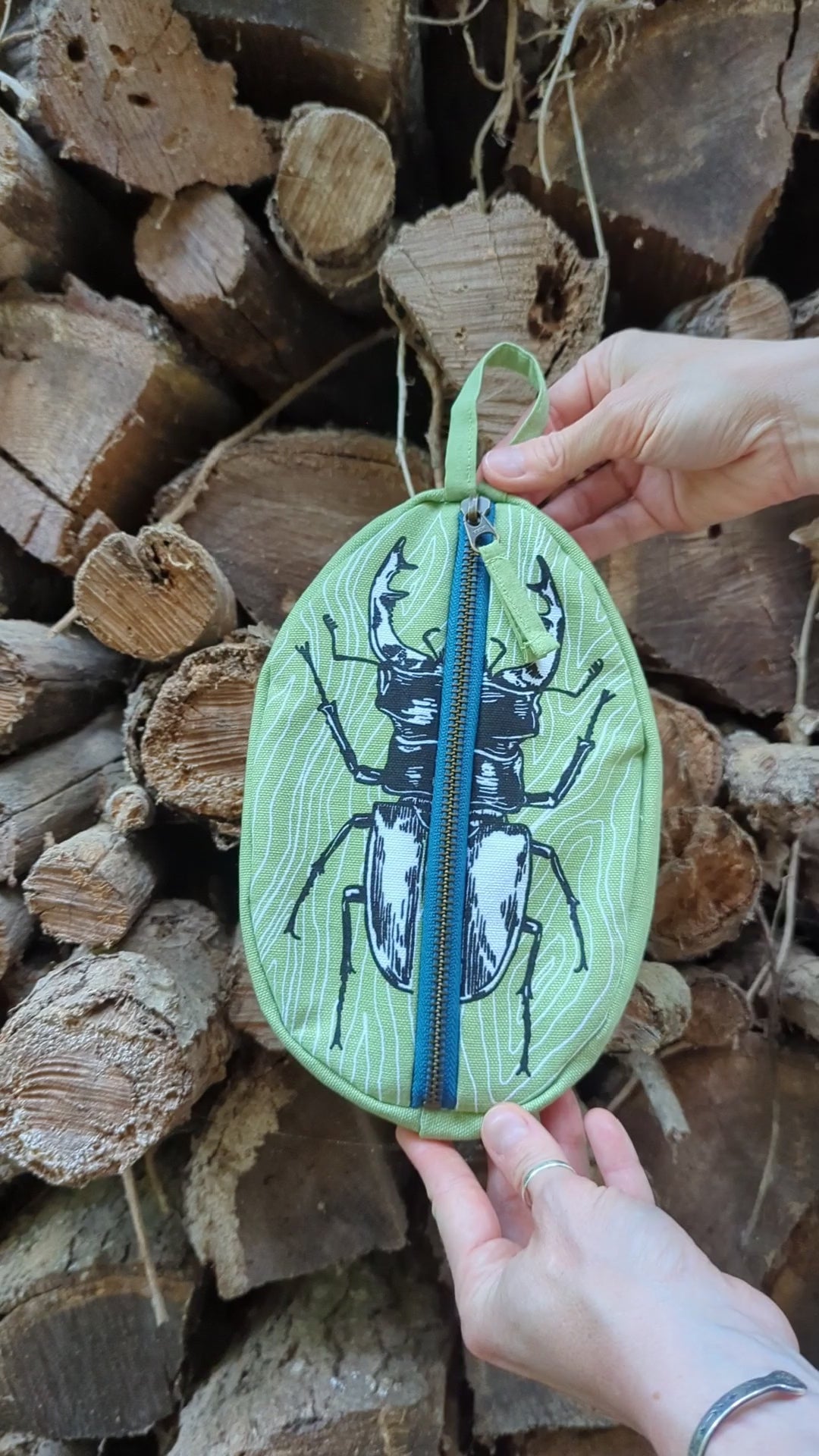 zippered pouch | stag beetle - green insect/bug pencil, supply, makeup bag with waterproof lining